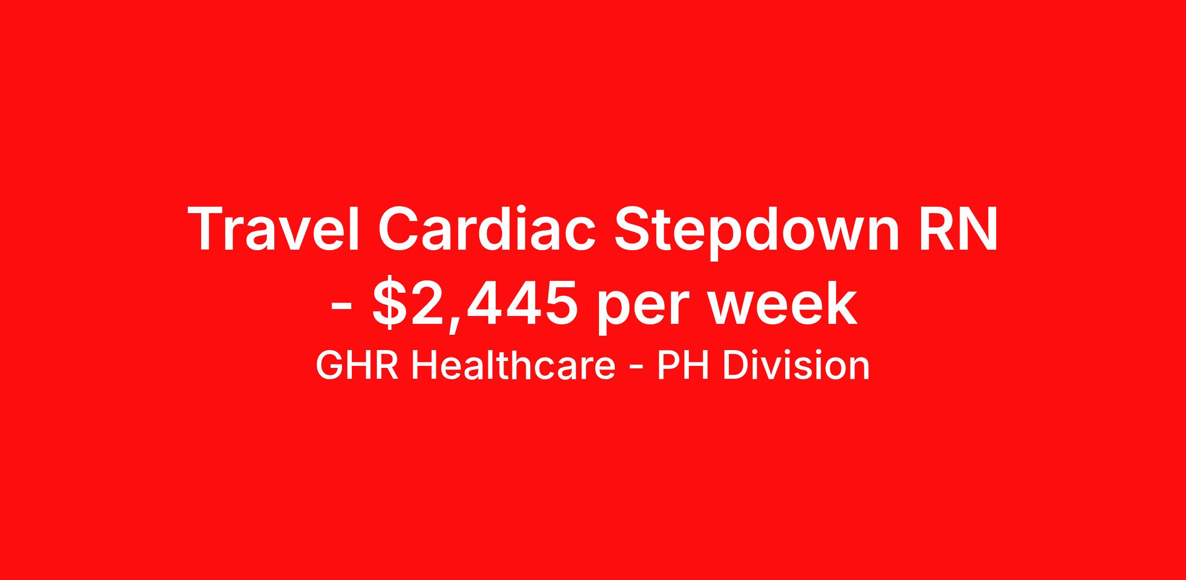 GHR Healthcare - PH Division is seeking a travel nurse RN Cardiac Stepdown for a travel nursing job in Cleveland, Ohio. Job Description & Requirements Specialty: Cardiac Stepdown Discipline: RN Start Date: 04/17/2026 Duration: 13 weeks 36 hours per week Shift: 12 hours Employment Type: Travel Cardiac Stepdown Registered Nurse (RN) – Night Shift | Travel Nurse | Cleveland, OH (44195) Cardiac Stepdown RN – Night Shift travel nurse opportunity in Cleveland, OH (44195): competitive pay, 13-week contract, and a supportive cardiovascular and neuro stepdown team. Apply now to join our Cleveland healthcare team. Job Details Location: Cleveland, Ohio 44195 (Greater Cleveland / Northeast Ohio) Setting: Cardiac Stepdown / Neuro Stepdown (Progressive Care Unit / PCU / Telemetry) Employment Type: Travel Contract – Travel RN / Travel Nurse assignment Start Date: April 17, 2026 End Date: July 17, 2026 Contract Duration: 13 weeks Shift: 12-hour nights (7:00pm – 7:30am), 3 shifts per week (Night Shift RN) Weekly Hours: 36 Estimated Weekly Pay: $2,130 – $2,250 Job Requirements Minimum 18 months recent, permanent experience in Neuro Stepdown, Cardiac Stepdown, PCU, or Telemetry (travel RN experience accepted) Active Registered Nurse (RN) license in Ohio or valid Compact RN license in hand Current AHA or American Red Cross BLS, ACLS, and NIHSS certifications (active status required) One supervisory reference in the specialty (manager, ANM, supervisor, or director) Must pass ECG rhythm recognition test and safeMedicate assessment during orientation (telemetry/arrhythmia competency) COVID-19 and Flu vaccines required (medical or religious exemptions considered) Ability to work at least every other holiday during the contract Responsibilities Provide high-quality nursing care to patients in the Cardiac/Neuro Stepdown unit (Progressive Care / PCU) Continuous cardiac and telemetry monitoring, rhythm interpretation, and early recognition of deterioration Manage complex cardiac and neurological patients, including post-op cardiac, heart failure, arrhythmia, and stroke-stepdown cases Administer medications, IV therapies, and treatments safely and per protocol (medication reconciliation and safeMedicate practices) Collaborate with interdisciplinary teams (cardiology, neurology, respiratory therapy, case management) to develop and implement individualized care plans Document patient progress, assessments, and interventions accurately in the electronic medical record Respond to emergencies and provide advanced cardiac life support (ACLS) and neuro-stabilization as needed Educate patients and families on diagnoses, treatment plans, and post-discharge instructions Experience the best of Cleveland while advancing your cardiac and neuro stepdown nursing career. This travel RN role is ideal for experienced telemetry, PCU, and stepdown nurses seeking a rewarding night shift assignment in Ohio. Apply now to be considered for this Cardiac Stepdown Registered Nurse (RN) – Night Shift travel assignment in Cleveland, OH (44195). Join our healthcare team today and make a difference in patient care! Benefits 401K with Matching, Healthcare, Dental and Vision Equal Opportunity We are an equal opportunity employer and value diversity across our organization. We do not discriminate on the basis of race, religion, color, national origin, gender, sexual orientation, age, marital status, veteran status, or disability status. Planet Healthcare Job ID 465992. Pay package is based on 12 hour shifts and 36 hours per week (subject to confirmation) with tax-free stipend amount to be determined. Posted job title: Cardiac Stepdown About GHR Healthcare - PH Division For over 30 years, GHR Healthcare has been the bridge between healthcare professionals and the facilities that need them nationwide. We're committed to uncovering your ideal fit, supported by GHR's dedication to competitive compensation, transparent communication, and a devoted team that genuinely cares about your career journey. You can trust us to stand by your side as your advocate, confidante, and partner in advancing your career. At GHR, care and consideration are at the heart of everything we do. Visit ghrhealthcare.com to learn more.