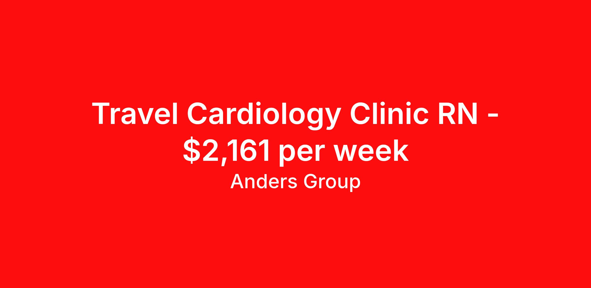 Anders Group is seeking a travel nurse RN Clinic Cardiology for a travel nursing job in Glenwood Springs, Colorado. Job Description & Requirements Specialty: Cardiology Discipline: RN Start Date: 03/31/2026 Duration: 13 weeks 36 hours per week Shift: 12 hours, days Employment Type: Travel Anders Group Job ID 1001283. Pay package is based on 12 hour shifts and 36 hours per week (subject to confirmation) with tax-free stipend amount to be determined. Posted job title: CO - CLINIC RN Cardiology About Anders Group WHY ANDERS? Anders Group is a Joint Commission accredited staffing agency and stands out from other agencies by our commitment to making sure our travelers are given the best customer service. Our team works hard to find the best jobs with the most aggressive rates! Anders Group offers rewarding assignments and competitive compensation packages, nationwide! We offer the following benefits from day one: Health Insurance, Including a Buy-up Option Dental Insurance Vision Insurance Life Insurance 401(k) Licensure Reimbursement Premium Pay Packages CEU Reimbursements Daily Per Diems Travel Reimbursements Rental Car Allowances Continuing Education Resources Referral Bonus And Many More! THE ANDERS DIFFERENCE You're committed to providing exceptional healthcare. We're committed to you. Anders Group was founded by a team of healthcare recruiters who had built strong relationships with healthcare facilities and professionals nationwide. As staffing firms shifted their focus to numbers and margins, these recruiters saw a need for a company to take a different approach to staffing. Anders Group was founded in 2010 to do just that. We focus on individual and facility goals to make quality placements. Great people working with great facilities make for the best placements. Through our focus on providing the best experience to Allied and Nursing health care professionals, Anders Group has grown to be a top staffing firm in Healthcare. We look forward to working with you! Benefits Medical benefits Dental benefits Vision benefits Life insurance 401k retirement plan License and certification reimbursement Continuing Education Referral bonus