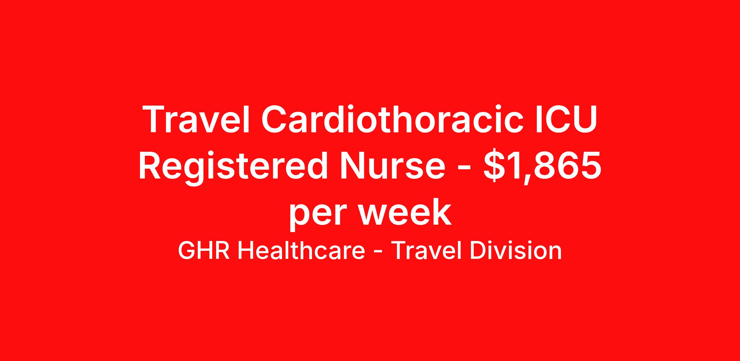 GHR Healthcare - Travel Division is seeking a travel nurse RN CTICU - Cardiothoracic Intensive Care for a travel nursing job in Albuquerque, New Mexico. Job Description & Requirements Specialty: CTICU - Cardiothoracic Intensive Care Discipline: RN Start Date: 05/04/2026 Duration: 13 weeks 36 hours per week Shift: 12 hours Employment Type: Travel GHR Healthcare - Travel Division Job ID 76376937. Pay package is based on 12 hour shifts and 36 hours per week (subject to confirmation) with tax-free stipend amount to be determined. About GHR Healthcare - Travel Division For over 30 years, GHR Healthcare has been the bridge between healthcare professionals and the facilities that need them nationwide. We're committed to uncovering your ideal fit, supported by GHR's dedication to competitive compensation, transparent communication, and a devoted team that genuinely cares about your career journey. You can trust us to stand by your side as your advocate, confidante, and partner in advancing your career. At GHR, care and consideration are at the heart of everything we do. Visit ghrhealthcare.com to learn more.