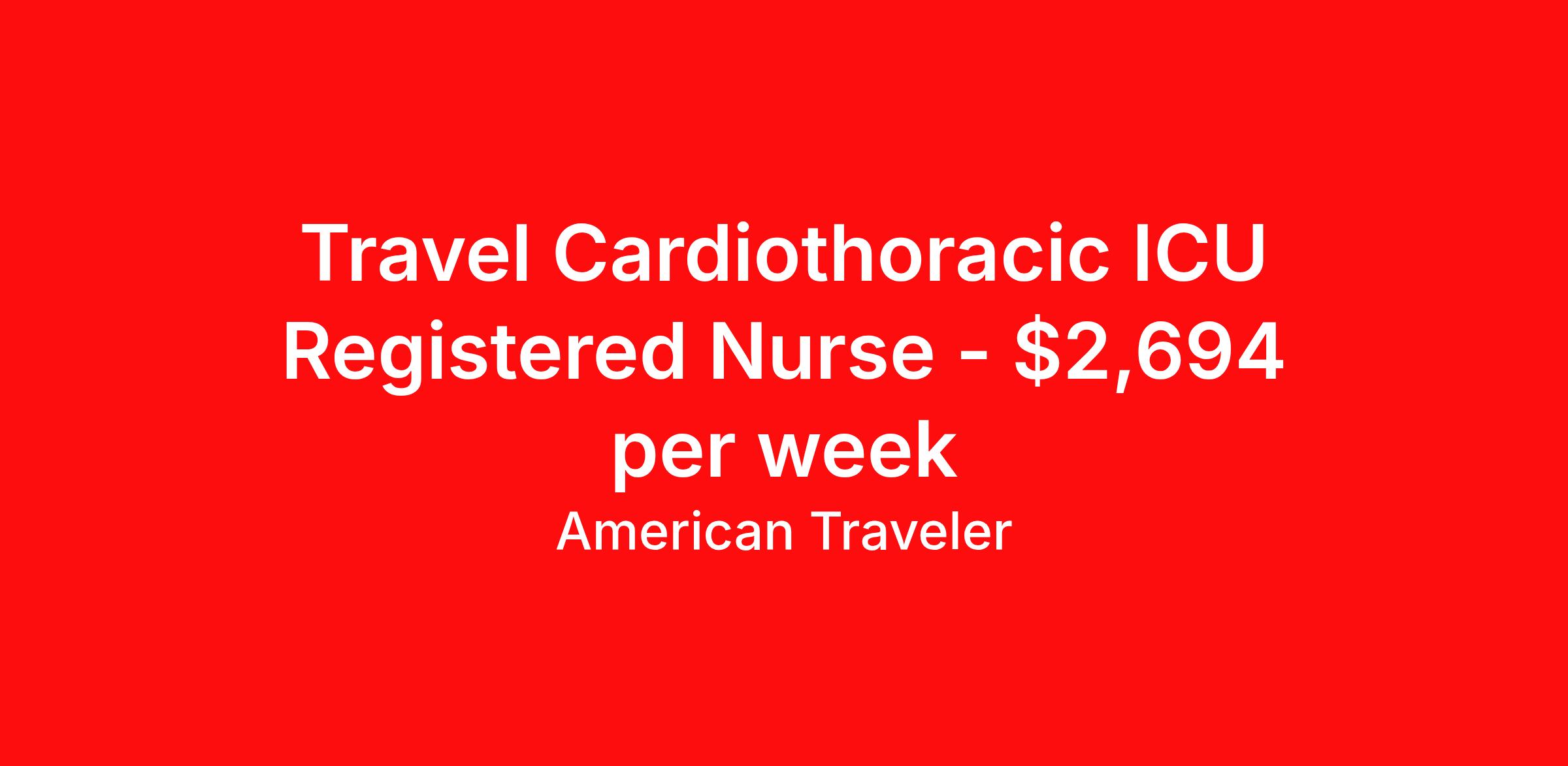 American Traveler is seeking a travel nurse RN CTICU - Cardiothoracic Intensive Care for a travel nursing job in Albuquerque, New Mexico. Job Description & Requirements Specialty: CTICU - Cardiothoracic Intensive Care Discipline: RN Start Date: 04/20/2026 Duration: 13 weeks 48 hours per week Shift: 12 hours, nights Employment Type: Travel Assignment Overview Shift: Nights, 4x12hrs Hours: 48 hrs/wk Start Date: Apr 20, 2026 Length: 13 weeks Openings: 1 Description American Traveler is seeking an experienced RN for a Cardiothoracic ICU position at a Level I Trauma teaching hospital in New Mexico, requiring a minimum of 2 years of experience and proficiency with advanced cardiac equipment such as ECMO, IABP, and Impella. Details Cardiothoracic ICU (CTVICU) setting within a Level I Trauma, acute care teaching hospital with 554 staffed beds Patient population includes post-op open heart surgery, CABG, aortic aneurysm repair/dissection, fem-pop bypass, pulmonary embolism, cardiac arrest, endovascular repair, heart failure, MODS, and sepsis Patient ratio of 1:2 Specialized procedures include post-op open heart care, bedside tracheostomy/PEG placement, bedside surgical procedures, CRRT, ECMO, IABP, Impella, Swan-Ganz catheters, arterial lines, CVCs, chest tubes, Foley insertion, and NG tubes Equipment used includes CRRT, Hemosphere, Bladderscanner, Cortrak, ultrasound, Philips monitors, Impella, IABP, ECMO, ZOLL, Dopplers, GlideScope, pupilometer, Blanketrol, Arctic Sun, Belmont, and BairHugger Charting performed in Cerner Night shift, 4x12-hour shifts, 7:00 PM – 7:30 AM Weekend availability required as needed No on-call requirement May be floated to other ICUs, PCU floors, ED (for admitted patients), or PACU (for admitted patients) within scope Requirements Active NM or Compact RN license required Current certifications: BLS and ACLS Minimum 2 years of ICU experience required, with cardiothoracic ICU experience strongly preferred Proficiency with advanced cardiac devices including ECMO, IABP, Impella, and Swan-Ganz catheters required Experience with CRRT required Cerner EMR experience preferred COVID vaccination required; religious and medical exemptions accepted with completed exemption form signed by a provider Must reside more than 75 miles from the facility to be eligible for this position Additional Information First-time travelers are welcome to apply Pending NM license accepted Scrub color required: black Free parking available on-site RTO requests exceeding 7 days require prior approval; all scheduling requests should be submitted at the time of application Travelers who have worked 4 consecutive assignments or reached a one-year mark at this facility are required to take a 6-month break before returning American Traveler Job ID P-681647. Pay package is based on 12 hour shifts and 48 hours per week (subject to confirmation) with tax-free stipend amount to be determined. Posted job title: Travel RN - Cardiothoracic ICU About American Traveler With over 25 years of experience, American Traveler has established a reputation for outstanding customer service. Our team ensures a smooth, worry-free experience for those starting on or expanding their travel nursing and allied careers. With thousands of travel nursing and allied jobs nationwide, our attentive and approachable recruiters find positions that align perfectly with your career aspirations and personal requirements. American Traveler offers exceptional benefits, including premium medical, dental, vision and life insurance beginning day one of your assignment, generous 401(k) match, substantial housing stipends, and more. Additionally, with 24/7 support and access to our in-house clinicians, you are assured confidence and comfort throughout your assignment. With our team behind you, you can relax and enjoy a rewarding travel career.