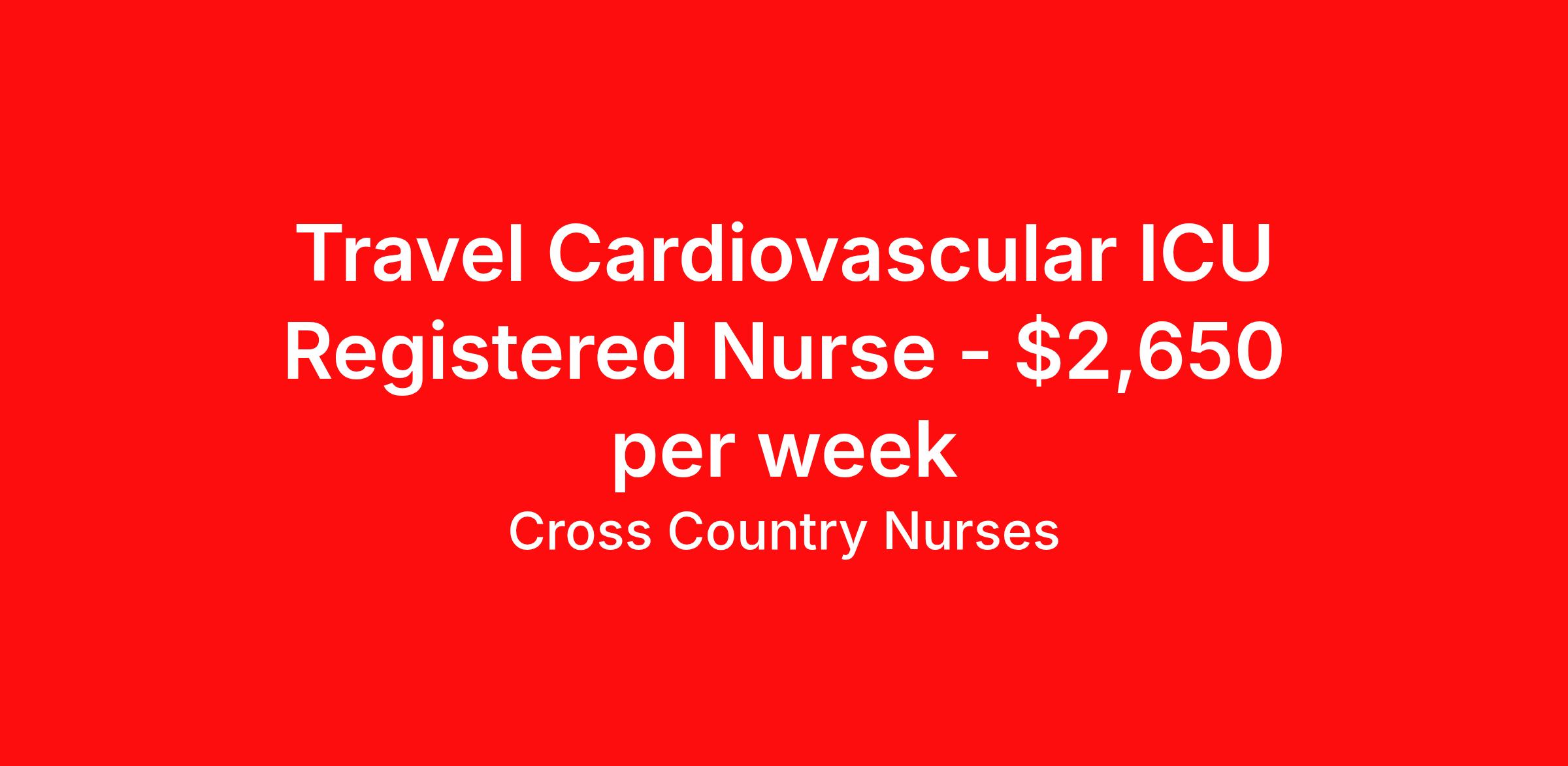 Cross Country Nurses is seeking a travel nurse RN CVICU for a travel nursing job in Lodi, California. Job Description & Requirements Specialty: CVICU Discipline: RN Start Date: 04/12/2026 Duration: 13 weeks 36 hours per week Shift: 12 hours, days Employment Type: Travel Job Description As an intensive care unit nurse (RN ICU), you will be monitoring patients with highly unstable, life-threatening conditions, to ensure they receive the best possible care. You must be able to rapidly assess a patient's condition and intervene with the appropriate care, managing various life-support systems like ventilation and heart-monitoring. Additionally, you will extend emotional support and education to gravely ill patients and their families. Minimum Requirements At least 1 year of recent acute care experience in specialty Active RN license Benefits The benefits of taking a travel nursing job with Cross Country include: Private housing or generous housing allowance Comprehensive health insurance with prescription coverage Dependent health insurance with prescription coverage Competitive salaries Referral bonuses Travel reimbursement 401(k) retirement plan Direct deposit/free checking Unlimited free CE credits Cross Country Job ID 1236743. Pay package is based on 12 hour shifts and 36 hours per week (subject to confirmation) with tax-free stipend amount to be determined. Posted job title: Registered Nurse / Intensive Care Unit Cardiovascular About Cross Country Nurses You care for others — we’re here to care for you. At Cross Country, we know travel nursing is about more than just the job. It’s about building a career that supports your lifestyle, your values, and your impact. We offer competitive pay, full benefits, and 24/7 support from a team that truly understands what it means to be on the front lines. Wherever your journey takes you, we’re with you every step of the way. Let’s build your best life — one assignment at a time. Benefits 401k retirement plan Referral bonus