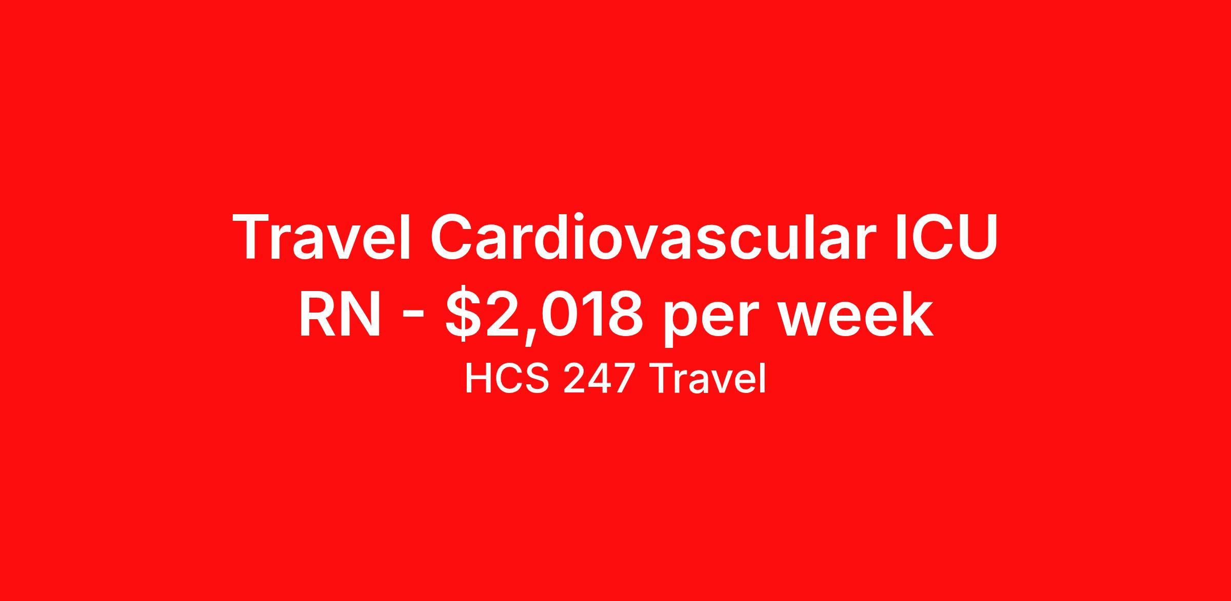 HCS 247 Travel is seeking a travel nurse RN CVICU for a travel nursing job in San Antonio, Texas. Job Description & Requirements Specialty: CVICU Discipline: RN Start Date: 04/06/2026 Duration: 13 weeks 36 hours per week Shift: 12 hours, nights Employment Type: Travel HCS 247 Travel Job ID 61838170. Pay package is based on 12 hour shifts and 36 hours per week (subject to confirmation) with tax-free stipend amount to be determined. About HCS 247 Travel HCS 24/7 is a national healthcare staffing organization specializing in the placement of Registered Nurses and Allied health professionals across acute care and other clinical settings. We support travel assignments, local short- and long-term contracts, per diem, temp-to-perm, and direct hire opportunities nationwide. Our clinical coverage includes Registered Nurse specialties such as ER, ICU, Med-Surg, Telemetry, Step-Down, OR, PACU, L&D, Mother/Baby, NICU, Cath Lab, Endoscopy, and more along with a full range of allied and imaging professionals, including Respiratory Therapists, Surgical Technicians, X-Ray Techs, CT Techs, MRI Techs, Interventional Radiology (IR) Techs, Cath Lab Techs, Ultrasound/Sonographers, Mammography Techs, and Nuclear Medicine Techs. With competitive compensation and benefits, consistent opportunities, and a clinician-first approach backed by top-rated customer service, HCS 24/7 delivers a seamless experience from initial application through assignment completion. Benefits Holiday Pay Guaranteed Hours Continuing Education Mileage reimbursement Referral bonus Medical benefits Dental benefits Vision benefits License and certification reimbursement Life insurance Benefits start day 1 Weekly pay