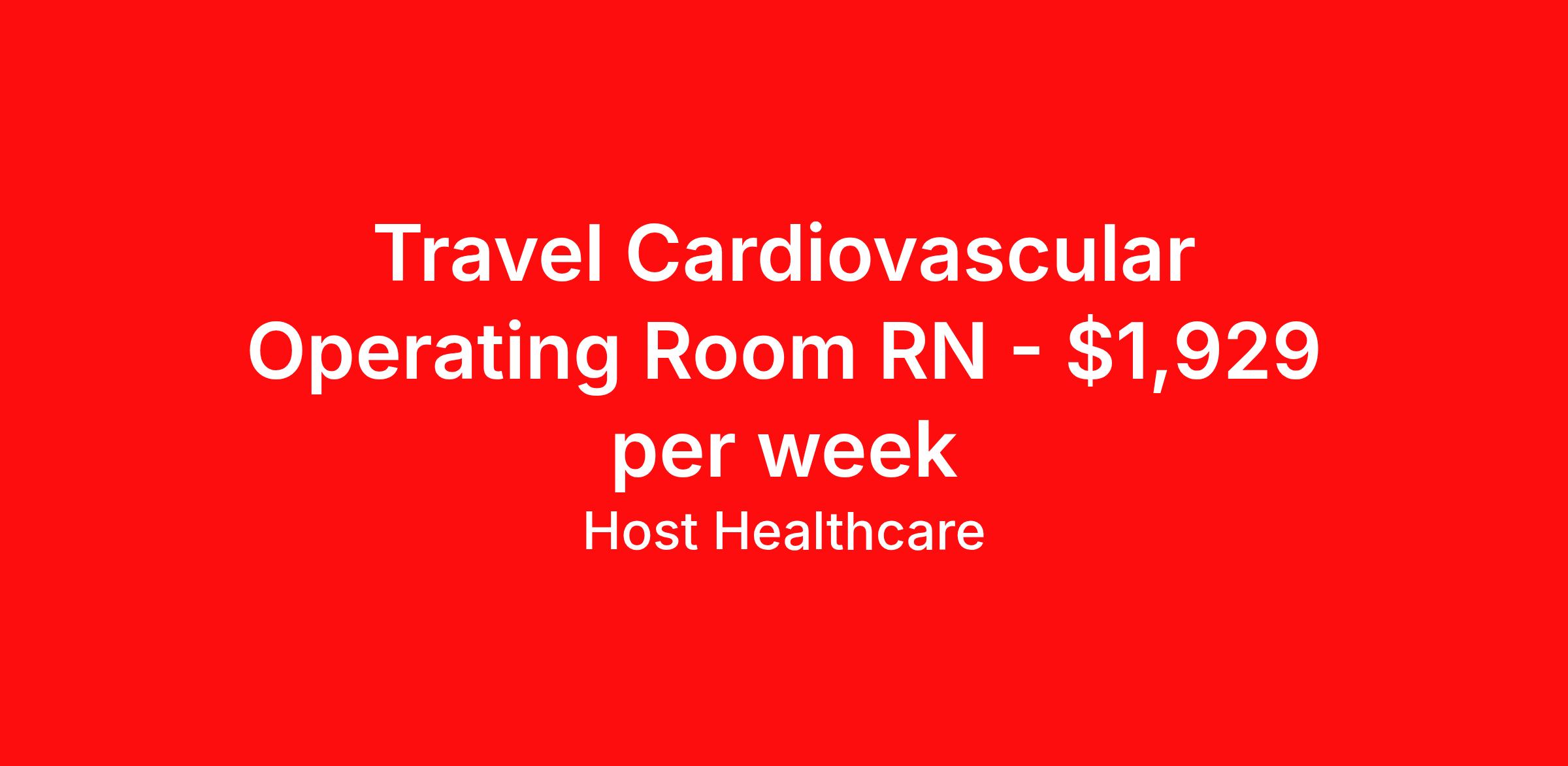 Host Healthcare is seeking a travel nurse RN CVOR for a travel nursing job in Webster, Texas. Job Description & Requirements Specialty: CVOR Discipline: RN Start Date: 03/30/2026 Duration: 13 weeks 36 hours per week Shift: 12 hours, days Employment Type: Travel Host Healthcare Job ID a1fVX000002ewfFYAQ. Pay package is based on 12 hour shifts and 36 hours per week (subject to confirmation) with tax-free stipend amount to be determined. Posted job title: RN - Operating Room About Host Healthcare At Host Healthcare, we provide a truly comfortable experience as you explore your travel nursing, therapy, or allied career. We make your travel healthcare journey easy by taking care of all the details, so you don’t have to. We are on a mission to help others live better and we do this by helping the healers of the world be as comfortable as possible. With access to tens of thousands of travel nursing, therapy, and allied jobs in all 50 states, our responsive and friendly recruiters find your dream position based on what’s important to you. During your assignment, get access to premium benefits, including Day 1 medical that continues up to 30 days between assignments, 401K matching, travel reimbursements, dedicated housing support, and more. We also offer 24/7 support from our team and access to our on-staff clinicians so you can feel comfortable and confident throughout your entire assignment. Travel comfortably with Host Healthcare. Benefits Referral bonus School loan reimbursement Vision benefits Wellness and fitness programs Company provided housing options License and certification reimbursement Life insurance Medical benefits Mileage reimbursement Pet insurance Discount program Employee assistance programs Guaranteed Hours Health savings account Holiday Pay 401k retirement plan Continuing Education Dental benefits
