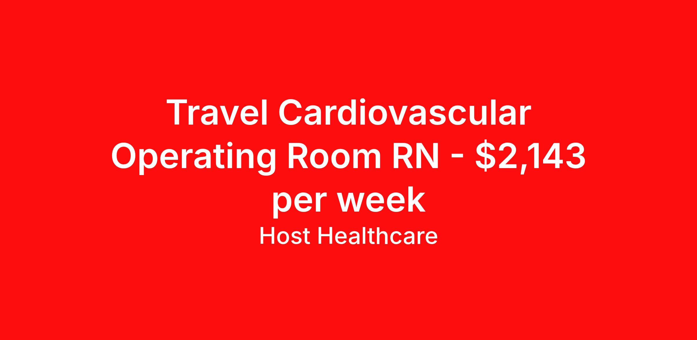Host Healthcare is seeking a travel nurse RN CVOR for a travel nursing job in Austin, Texas. Job Description & Requirements Specialty: CVOR Discipline: RN Start Date: ASAP Duration: 13 weeks 40 hours per week Shift: 10 hours, days Employment Type: Travel Host Healthcare Job ID a1fVX000002iPCrYAM. Pay package is based on 10 hour shifts and 40 hours per week (subject to confirmation) with tax-free stipend amount to be determined. Posted job title: RN - Operating Room About Host Healthcare At Host Healthcare, we provide a truly comfortable experience as you explore your travel nursing, therapy, or allied career. We make your travel healthcare journey easy by taking care of all the details, so you don’t have to. We are on a mission to help others live better and we do this by helping the healers of the world be as comfortable as possible. With access to tens of thousands of travel nursing, therapy, and allied jobs in all 50 states, our responsive and friendly recruiters find your dream position based on what’s important to you. During your assignment, get access to premium benefits, including Day 1 medical that continues up to 30 days between assignments, 401K matching, travel reimbursements, dedicated housing support, and more. We also offer 24/7 support from our team and access to our on-staff clinicians so you can feel comfortable and confident throughout your entire assignment. Travel comfortably with Host Healthcare. Benefits Referral bonus School loan reimbursement Vision benefits Wellness and fitness programs Company provided housing options License and certification reimbursement Life insurance Medical benefits Mileage reimbursement Pet insurance Discount program Employee assistance programs Guaranteed Hours Health savings account Holiday Pay 401k retirement plan Continuing Education Dental benefits