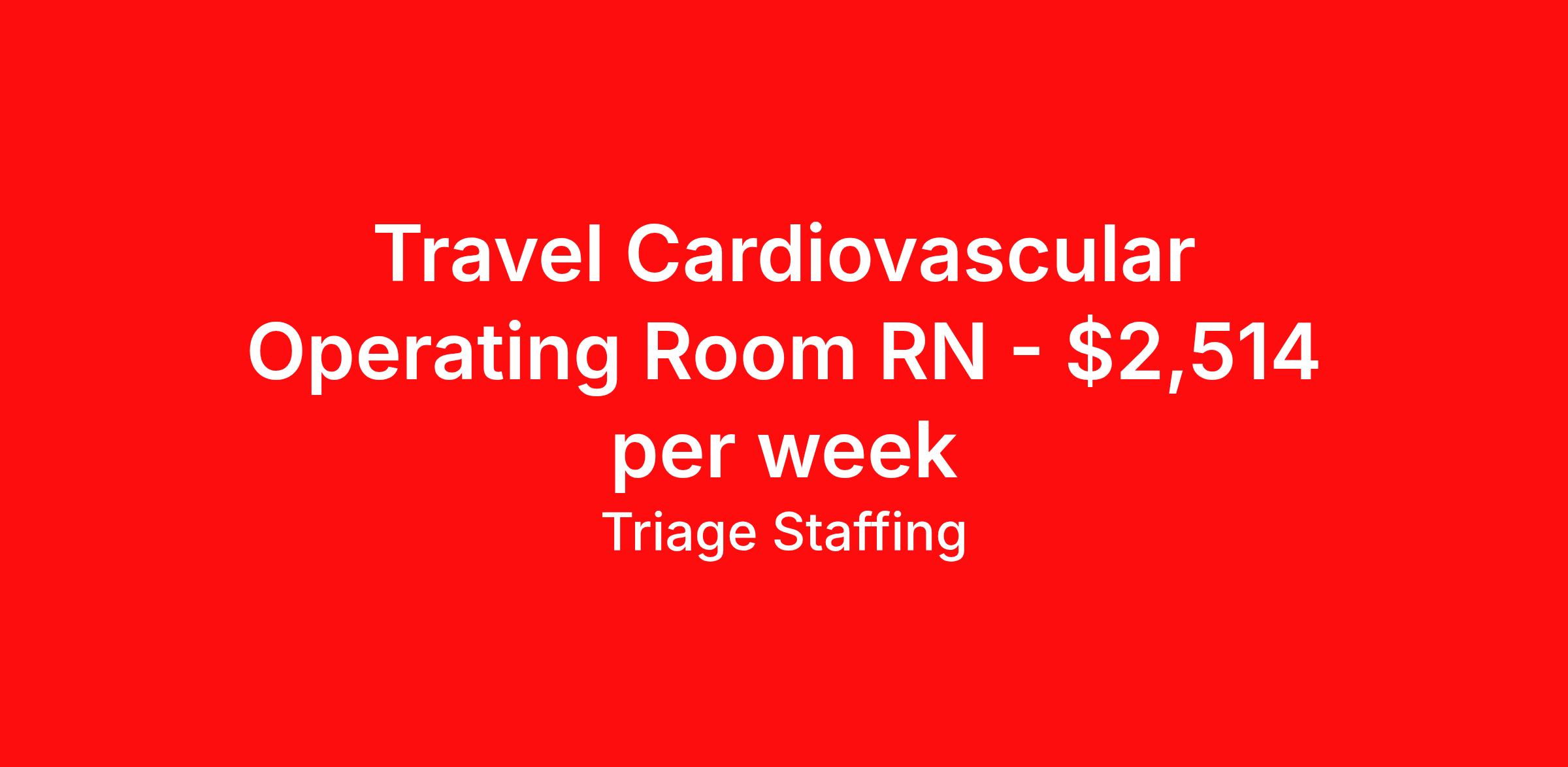 Triage Staffing is seeking a travel nurse RN CVOR for a travel nursing job in Harrisburg, Pennsylvania. Job Description & Requirements Specialty: CVOR Discipline: RN Start Date: 04/06/2026 Duration: 13 weeks 40 hours per week Shift: 10 hours, days Employment Type: Travel Travel Nursing: Cardiovascular OR Harrisburg, PA Location: Harrisburg, PA Start Date: 4/6/2026 Shift Details: 10H Days 40 hours per week Length: 13 WEEKS Apply for specific facility details.CVOR RN Triage Staffing Job ID KDUQWA4D. Posted job title: Nursing: Cardiovascular OR About Triage Staffing At Triage, we prefer to be real . Real about expectations—both ours and yours. Real about how a decision you make today could affect your tomorrows. Real about how compensation actually works. Real about how great—or grating—your next supervisor may be. Being real allows everyone at Triage to be ready . Ready to serve you with real honesty. So if that gig near the ocean is really no day at the beach, or that third shift comes with a second-class rate, we tell you. So you can be ready, too. We staff all five major divisions of acute care—nursing, lab, radiology, cardiopulmonary and rehab therapy, offering: - Competitive, custom pay packages - One point of contact for both travelers and facilities (per division) - A reliable recruiter who's got your back throughout your entire assignment - In-house compliance and accounting specialists - A clinical liaison team available 24/7 to offer medical and professional support and career development - A mentoring program that is run and managed by actual clinicians—yeah, you read that right - And more (because of course there’s more) Are we the biggest? No. Are we the best? That’s rather subjective, but we’re trying to be. Will we work like hell to get you as close to your idea of heaven as possible? Yes. Yes, we will. Benefits: Day One comprehensive, nationwide insurance plans for health, vision and dental and life—including a HSA option Day One 401(k) program with employer-matching contributions once eligible Facility cancelling protection—your time is money on and off-the-clock Guaranteed hours Weekly paychecks via direct deposit Earned vacation bonuses for time worked Paid holidays Employee assistance program (EAP)—your mental health is important, too Continuing education, certification and licensing reimbursement Workers comp—because accidents happen Top-rated professional liability insurance Company provided housing options Referral bonus—$750 in your pocket after they’ve completed a 13-week assignment