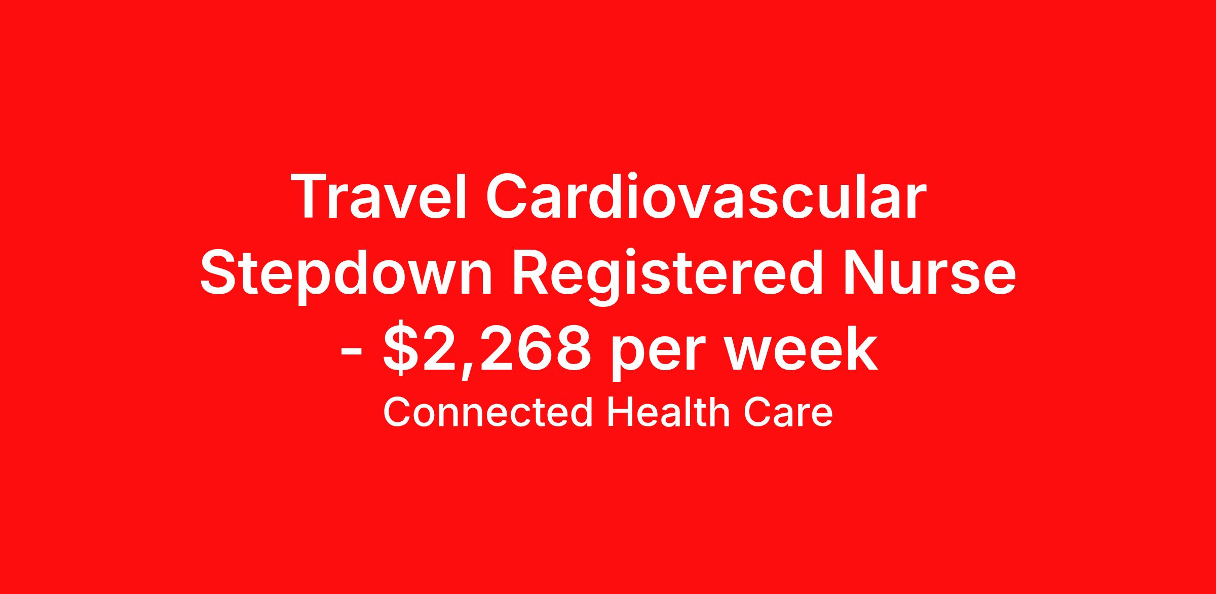 Connected Health Care is seeking a travel nurse RN Cardiac Stepdown for a travel nursing job in Evansville, Indiana. Job Description & Requirements Specialty: Cardiac Stepdown Discipline: RN Start Date: ASAP Duration: 13 weeks 36 hours per week Shift: 12 hours Employment Type: Travel Travel/Contract ICU Stepdown Registered Nurse Competitive WEEKLY Pay for Qualified Candidates! Connected Health Care is seeking a compassionate and experienced Travel/Contract ICU Stepdown Registered Nurse for an immediate opportunity in IN. Whether you are looking to take your next adventure across the country or simply looking for a new contract opportunity close to home, our team is committed to finding the perfect opportunity for you. Job Description & Requirements: Position: Travel/Contract ICU Stepdown Registered Nurse Discipline: Registered Nurse Specialty/Department: Step Down Unit Duration: 13 weeks Benefits What To Expect From The Connected Team: Weekly, On time Pay Access to exclusive travel/contract assignments through our dedicated team at Connected Health Care Quick Offers and submittals through direct relationships with partners and facilities in all 50 states Weekly, On time Pay Holiday Overtime Rates that are typically 50% higher than our competitors Premium Health Benefits starting on the first day of your assignment 401K Plans with generous matching programs Paid Housing or generous housing allowances in the form of stipends Paid Time Off and Paid Sick Time Referral Bonuses ranging from $500 - $1,500 depending on the role Completion Bonuses for every assignment Reimbursements for Travel, Licensure, Relocation, and other expenses when applicable A dedicated team who care, with 24/7 support If you're ready to elevate your career while enjoying the flexibility of travel, apply now and let our team connect you to exciting opportunities across the nation! *Note: Per Diem Hours are NOT guaranteed on a weekly basis. Connected Healthcare Job ID 166196. Pay package is based on 12 hour shifts and 36 hours per week (subject to confirmation) with tax-free stipend amount to be determined. Posted job title: Travel/Contract ICU Stepdown Registered Nurse About Connected Health Care Connected Health Care is a nationally recognized healthcare recruiting and staffing agency specializing in travel nursing, travel allied health, interim leadership, per-diem staffing, and permanent placement. Our team of professional account managers, recruits, and credentialists are focused on providing you with the most fulfilling career path that aligns with your personal goals, whether you are traveling with us for a season or looking for a permanent place to call home. Benefits Weekly pay Holiday Pay Guaranteed Hours Continuing Education 401k retirement plan Company provided housing options Cancelation protection Mileage reimbursement Referral bonus Employee assistance programs Medical benefits Dental benefits Vision benefits Benefits start day 1 License and certification reimbursement