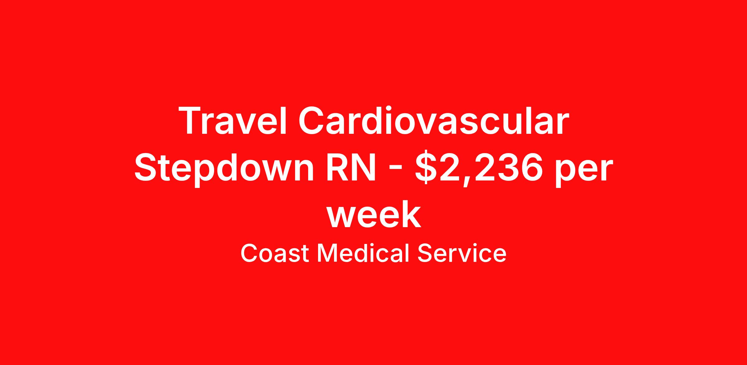Coast Medical Service is seeking a travel nurse RN Cardiac Stepdown for a travel nursing job in Evansville, Indiana. Job Description & Requirements Specialty: Cardiac Stepdown Discipline: RN Start Date: ASAP Duration: 13 weeks 36 hours per week Shift: 12 hours, nights Employment Type: Travel Coast Medical Service is a nationwide travel nursing & allied healthcare staffing agency dedicated to providing an elite traveler experience for the experienced or first-time traveler. Coast is featured on Blue Pipes' 2023 Best Travel Agencies and named a 2022 Top Rated Healthcare Staffing Firm & 2023 First Half Top Rated Healthcare Staffing Firm by Great Recruiters. Please note that pay rate may differ for locally based candidates. Please apply here or contact a recruiter directly to learn more about this position & the facility, and/or explore others that may be of interest to you. We look forward to speaking with you! Coast Medical Services Job ID 35252184. Pay package is based on 12 hour shifts and 36.0 hours per week (subject to confirmation) with tax-free stipend amount to be determined. Posted job title: RN:Stepdown (PCU),19:00:00-07:30:00