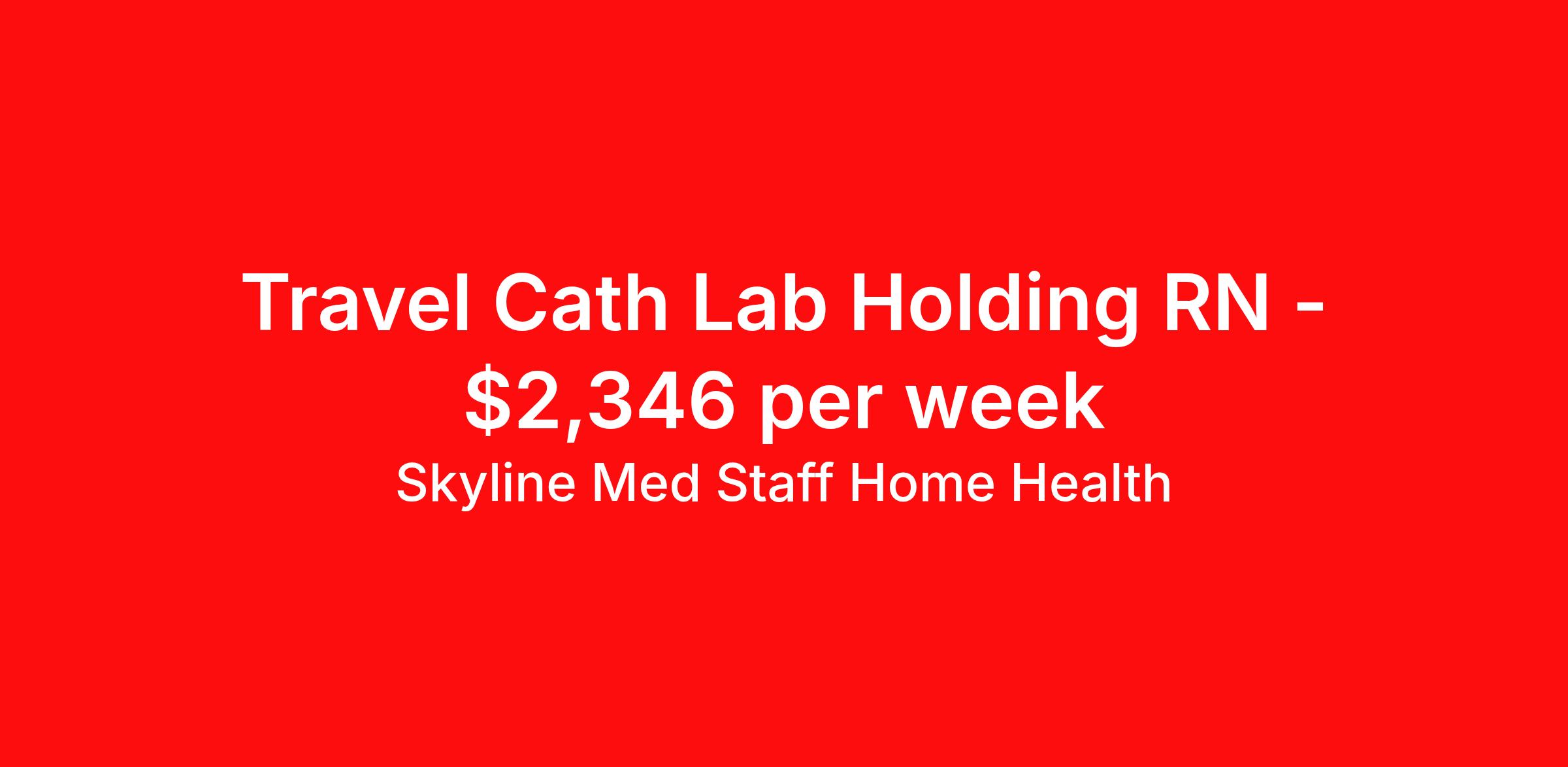 Skyline Med Staff Home Health is seeking a travel nurse RN Cardiac Cath Lab for a travel nursing job in Sumter, South Carolina. Job Description & Requirements Specialty: Cardiac Cath Lab Discipline: RN Start Date: 04/13/2026 Duration: 13 weeks 40 hours per week Shift: 8 hours, days Employment Type: Travel Weekly amount stated in the job postings is estimated based on estimated hourly wages and potential stipends available for the location of the assignment. Pay package is calculated on bill rate at the time job was posted, but can change or vary without notice. Exact pay packages might vary as this is an estimate. Our recruiter would be happy to build an exact pay package for you for each job. Join the Best in Travel Nursing! Skyline Med Staff was honored as the 1 Best Travel Nursing Company in 2025 by BluePipes, a recognition driven by glowing reviews from travel healthcare professionals. Our recruiters are consistently praised on Google for their responsiveness, dedication, accessibility, and industry knowledge. Ready to experience the difference? Apply for a job today and see why travel nurses choose Skyline! As a traveler with Skyline Med Staff, you'll have a dedicated recruiter supporting you every step of the way and available whenever you need them. We are a Woman Owned Agency providing clinicians with Health Insurance through Blue Cross Blue Shield, along with Dental and Vision coverage, plus $500 referral bonuses! We’re seeking committed Nursing professionals who excel in delivering quality patient care and can adapt to diverse work environments. Required for Submission: 1. Minimum of 1 year recent work experience in the specialty of the job applying for 2. A current BLS/CPR certification through American Heart Association 3. Active License in the state of the job location We look forward to connecting and working with you to find your next job opportunity! Skyline Med Staff Home Health Job ID 36119786. Pay package is based on 8 hour shifts and 40.0 hours per week (subject to confirmation) with tax-free stipend amount to be determined. Posted job title: RN:Cath Lab,07:00:00-15:00:00 About Skyline Med Staff Home Health Join the Top- Rated Travel Healthcare Team! Skyline Med Staff was named as the 1 Best Travel Healthcare Company in 2025 by BluePipes, a recognition driven by glowing reviews from travel healthcare professionals. Our recruiters are consistently praised on Google for their responsiveness, dedication, accessibility, and industry knowledge. Ready to experience the difference? Apply for a job today and see why healthcare professionals choose Skyline! Certified Women Owned Business We believe that travel is good for the soul. We want to be on your journey with you and find the right job that fits you Skyline Med Staff is committed to one vision treating others the way that THEY want to be treated. The executive team at Skyline Med Staff focuses on a commitment to quality, consistency, and the highest level of service. Our team members continually strive to build long term relationships that center on you and helping you achieve your goals. Some of the Benefits you will receive with Skyline Med Staff: Over 30 years of combined experience in the staffing industry Higher Take-Home Pay Rates Dedicated Personal Recruiter We are available to you 24/7 Health Insurance Plan Options Tax Free Per Diems, Housing Stipends and Travel Reimbursements Joint Commission Certified Contracts in all 50 states Referral and Loyalty Bonuses Benefits Medical benefits Referral bonus
