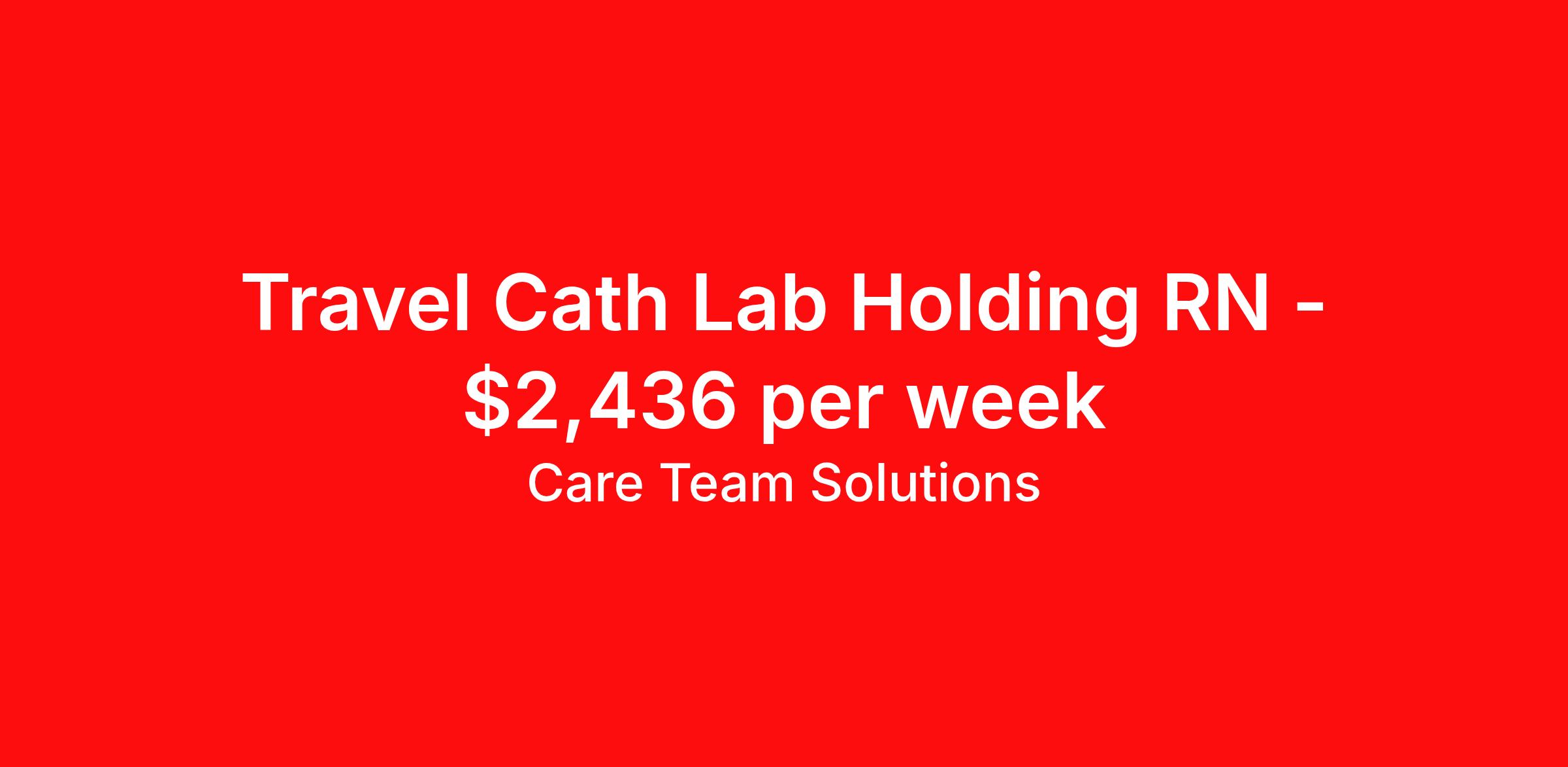 Care Team Solutions is seeking a travel nurse RN Cardiac Cath Lab for a travel nursing job in Sumter, South Carolina. Job Description & Requirements Specialty: Cardiac Cath Lab Discipline: RN Start Date: 03/30/2026 Duration: 13 weeks 40 hours per week Shift: 8 hours Employment Type: Travel Registered Nurse must have 2 years of recent experience in particular specialty Details: Must Have 2 Years of recent Catheterization Laboratory experience. Specialty: Catheterization Laboratory Discipline: Registered Nurse Start Date: 2026-03-30 Duration: 13 Weeks Shift: 8 Hours Day shift Hours Per Week: 40 Hours Employment Type: Contract Gross Weekly Pay: $2436.25 Six things that won’t happen if you apply to this job: You won’t have to guess what the downsides are. We’ll tell you up front. You won’t show up on day 1 and find out this is not what you signed up for. We won't leave your phone call ringing when it's inconvenient. Business hours for you are business hours for us. You won’t get shuffled to some customer service rep when a problem pops up. If we screw up something in securing your placement, we'll own it. That means it's on us to make it right. You won’t figure out your credentials alone. Our credentialing experts will walk you through it step by step. We've talked to thousands of travel nurses like you. We know you want good pay. You want to choose when you work. But the one thing nurse after nurse has said they want and don't have is someone in their corner. There's a lot in this business that’s messed up. We’re trying to be the people that fix it. You and every nurse with the guts to travel deserve it. We've worked hard for you to enjoy some one-of-a-kind benefits you'll not likely find anywhere else, because they benefit you more than they benefit us: Our early pay program Student loan reimbursement Free well-being tele-visits with a psychologist Care Team Solutions Job ID 586251. Pay package is based on 8 hour shifts and 40 hours per week (subject to confirmation) with tax-free stipend amount to be determined. Posted job title: Cath Lab Holding Registered Nurse About Care Team Solutions Two brothers who give an enormous damn. We're Justin and Kyle. Neither of us are nurses. It doesn’t take a nurse to see that the way travel nurses are treated sucks. Nursing is already hard enough. Travel nursing takes serious guts. You get the toughest assignments in places you’ve never been. Which can be fun, but it’s also stressful. You’re in your element but outside of your hometown. You can be a stranger on the team. If anyone deserves someone in their corner, it’s you. But that’s not how most agencies operate. Which is why travel nurses hate working with them. We got into this business because we saw bucket-loads of nurses moving through the "churn and burn" travel machinery. We absolutely hate that. You'll do your best work when you have the placements you want and feel fully supported in your work. We pay our people well because we want them to treat you well. Our recruiters are amazing (we picked each of them ourselves), but if you've got a problem too big for them, they can come straight to us. We work like ten feet away. The "Churners and Burners" promise you the same benefits. They might as well copy/paste them from each other. We have them too: 401k, holiday pay, healthcare, dental, travel reimbursement, etc But we've worked hard for you to enjoy some one-of-a-kind benefits you'll not likely find anywhere else, because they benefit you more than they benefit us: Our early pay program Student loan reimbursement Free well-being tele-visits with a psychologist Benefits Weekly pay Holiday Pay Guaranteed Hours 401k retirement plan Wellness and fitness programs Referral bonus Medical benefits Dental benefits Vision benefits School loan reimbursement