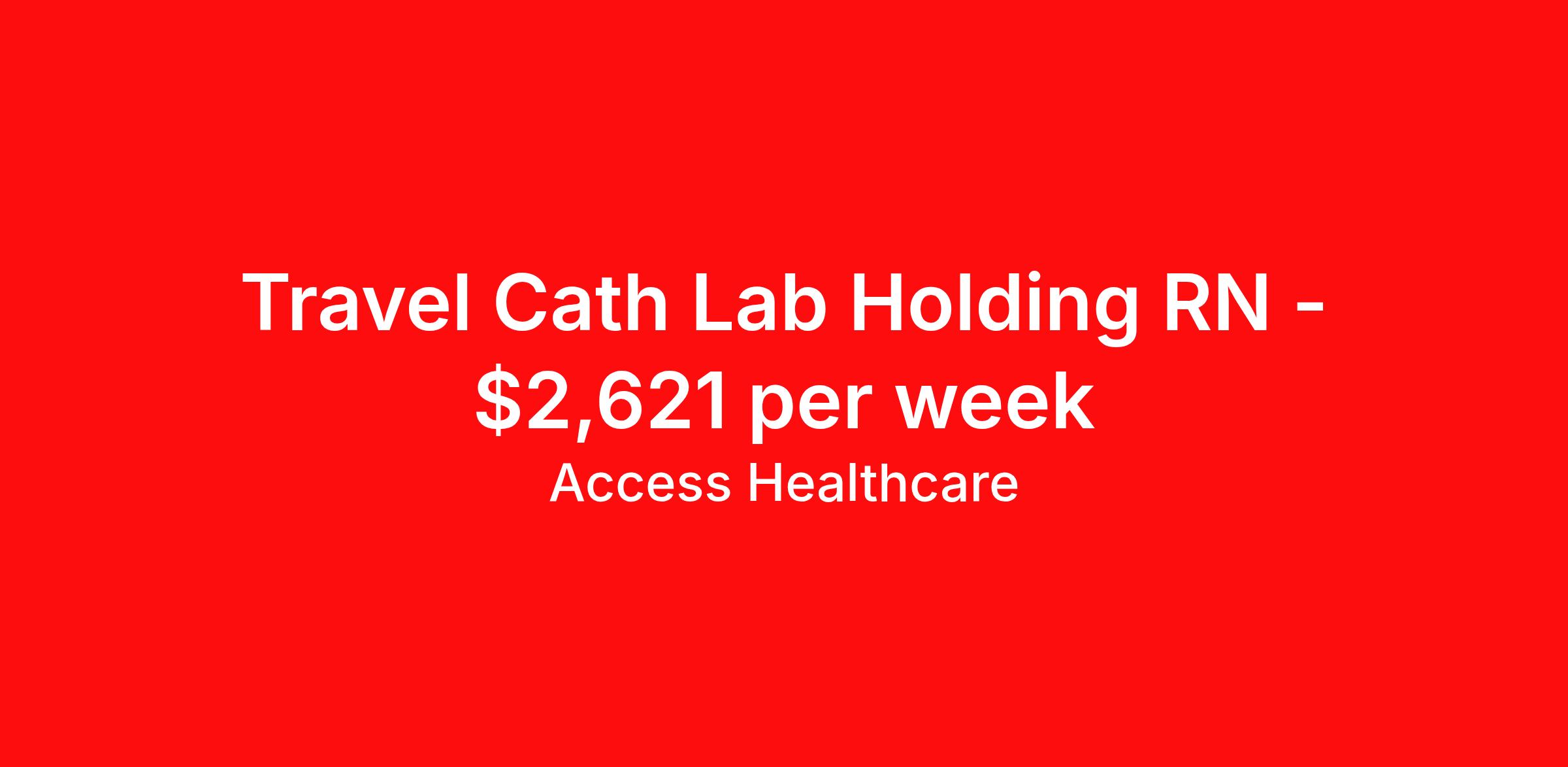 Access Healthcare is seeking a travel nurse RN Cardiac Cath Lab for a travel nursing job in Sumter, South Carolina. Job Description & Requirements Specialty: Cardiac Cath Lab Discipline: RN Start Date: 04/13/2026 Duration: 13 weeks 40 hours per week Shift: 8 hours, days Employment Type: Travel Access Healthcare Job ID 76270800. Pay package is based on 8 hour shifts and 40 hours per week (subject to confirmation) with tax-free stipend amount to be determined. About Access Healthcare Access Healthcare aims to provide superior service to our nursing family by providing around the clock support, competitive pay packages and an unmatched benefits package! Unlike other agencies, we offer a true family feel and work with you to find the placement that is right for you. We offer one of the top leading pay packages in the industry and we are ready to get you the money you deserve! Access Healthcare was founded by two travel nurses, Danielle and Diego, who had a dream and a shared vision of creating an agency which all nurses would want to work with. Our passion has led us to where we are today as one of the top 10 agencies in our home state of New Jersey, with access to contracts in all 50 states! We encourage you to join our team and we cannot wait to get to know you!