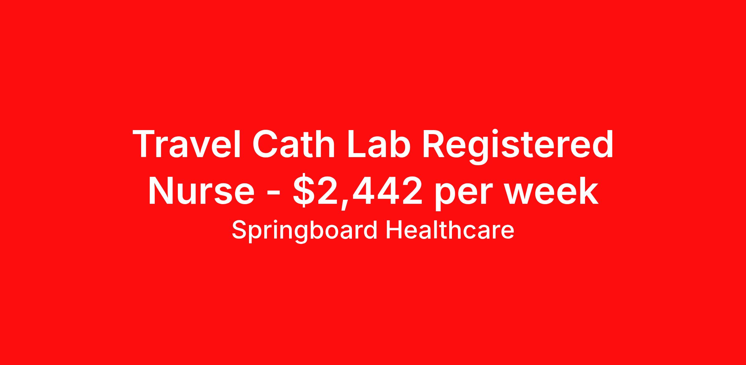 Springboard Healthcare is seeking a travel nurse RN Cardiac Cath Lab for a travel nursing job in Lebanon, Indiana. Job Description & Requirements Specialty: Cardiac Cath Lab Discipline: RN Start Date: 04/06/2026 Duration: 13 weeks 40 hours per week Shift: 8 hours Employment Type: Travel At Springboard Health, we’re experts specializing in matching nurses and techs just like you with travel and local assignments in Cath Lab, EP, IR, and Diagnostic Imaging at the best facilities across the country. We are so passionate about what you do that we developed free cutting-edge educational tools that offer valuable CEUs to help our clinicians gain additional expertise in Cath Lab and EP. Our relationship managers not only know their stuff about what you do and what you need, they are Jerry Maguire-type advocates to get you the most money in the best jobs at the nation’s top hospitals. Plus, as icing on the cake, we are fun, driven, and here for you every step of the way on your assignment. We work with great people and can’t wait to have you on our team. Want to see a full pay package for your dream job? Apply online or say hello by calling us at ! Springboard Healthcare Job ID 833224. Pay package is based on 8 hour shifts and 40 hours per week (subject to confirmation) with tax-free stipend amount to be determined. Posted job title: Cath Lab RN