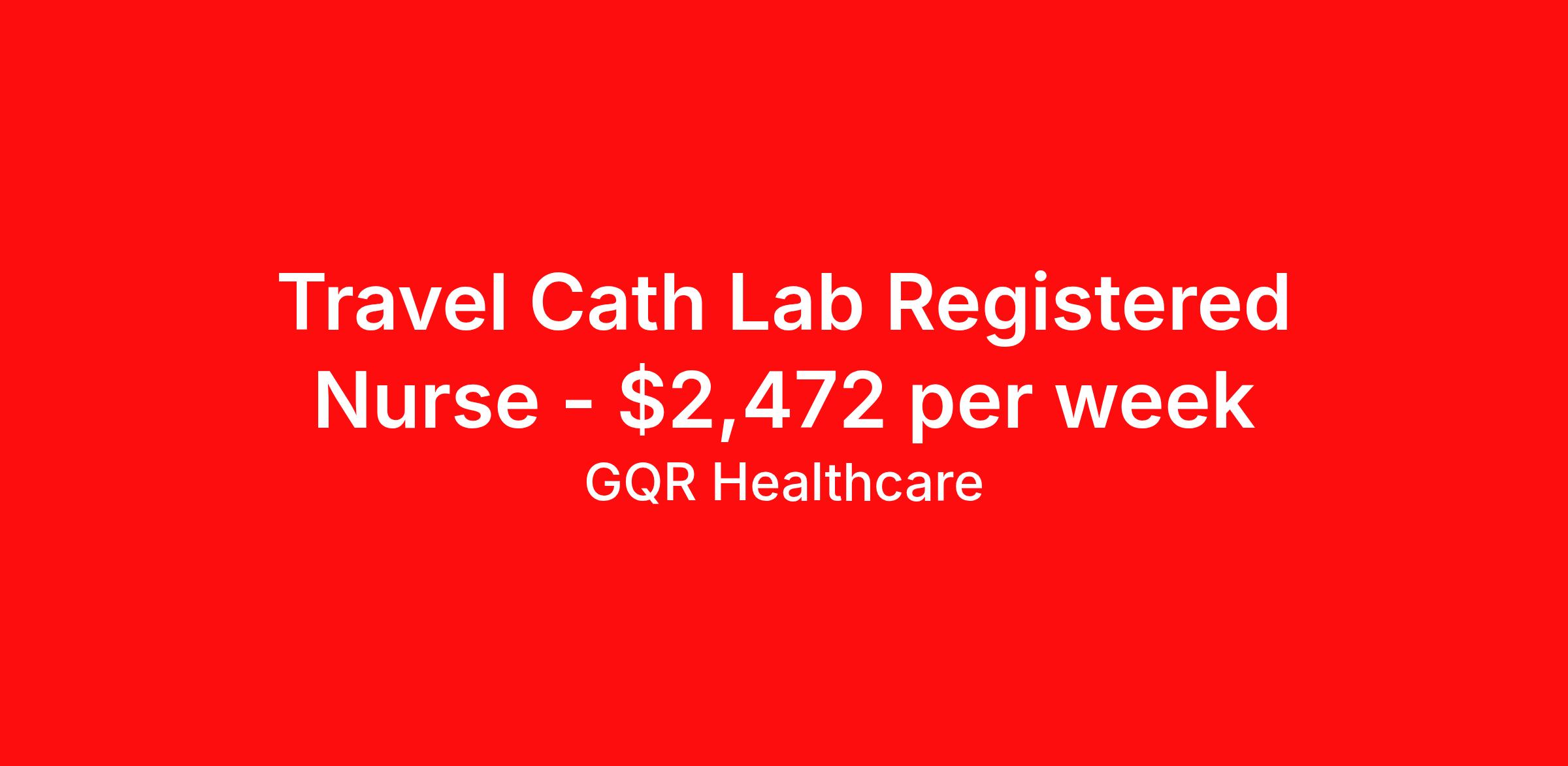 GQR Healthcare is seeking a travel nurse RN Cardiac Cath Lab for a travel nursing job in Santa Barbara, California. Job Description & Requirements Specialty: Cardiac Cath Lab Discipline: RN Start Date: 03/23/2026 Duration: 13 weeks 36 hours per week Shift: 12 hours, days Employment Type: Travel Contract - W2 Cath Lab Registered Nurse (RN) Job Location: Santa Barbara, California Start Date: March 23, 2026 Profession: Registered Nurse (RN) Facility: Estimated Pay: $2471.69 - $2566.69 Duration:13 weeks Specialty:Cath Lab Shift: Day Shift Details: null Day Job Type: Travel *Estimated weekly pay includes projected hourly wages and weekly meal and lodging per diems for eligible clinicians based on nationally published GSA rates. Actual weekly pay and per diems may differ from the amount shown and are subject to change during an assignment. Benefits: Day 1 Insurance Cigna medical, MetLife dental and vision insurance License reimbursement for new licenses needed for each assignment Discounts with hotels and rental cars A dedicated recruiter and support team that will help you every step of the way to sure you start on time and have an exceptional experience Referral bonus up to $700 About the Company: Finding the right role is about more than just matching skills to a job—it’s about aligning with your goals, values, and the way you want to work. As an award-winning talent partner, we support healthcare professionals through every step of that process, offering meaningful opportunities, clear guidance, and long-term partnership. From our first conversation to your first day on the job (and beyond!), we’re here to help you move forward with confidence. GQR Job ID 784003. Pay package is based on 12 hour shifts and 36 hours per week (subject to confirmation) with tax-free stipend amount to be determined. Posted job title: Registered Nurse (RN) About GQR Healthcare GQR’s Healthcare team specializes in connecting experts within the industry to highly skilled healthcare professionals across the US market. In the competitive healthcare market, we recognize that the industry’s common goals of improved quality of care and patient outcomes are wholly reliant upon the professionals directly supporting these initiatives. Leveraging our extensive candidate network, we deliver continuity of care for the communities our partners serve to ensure the patient experience is of the highest quality. Through deep market specialization and a unique approach to talent acquisition, GQR Healthcare provides an unparalleled and personalized experience across all medical specialties in nursing and within diverse healthcare platforms across the industry.