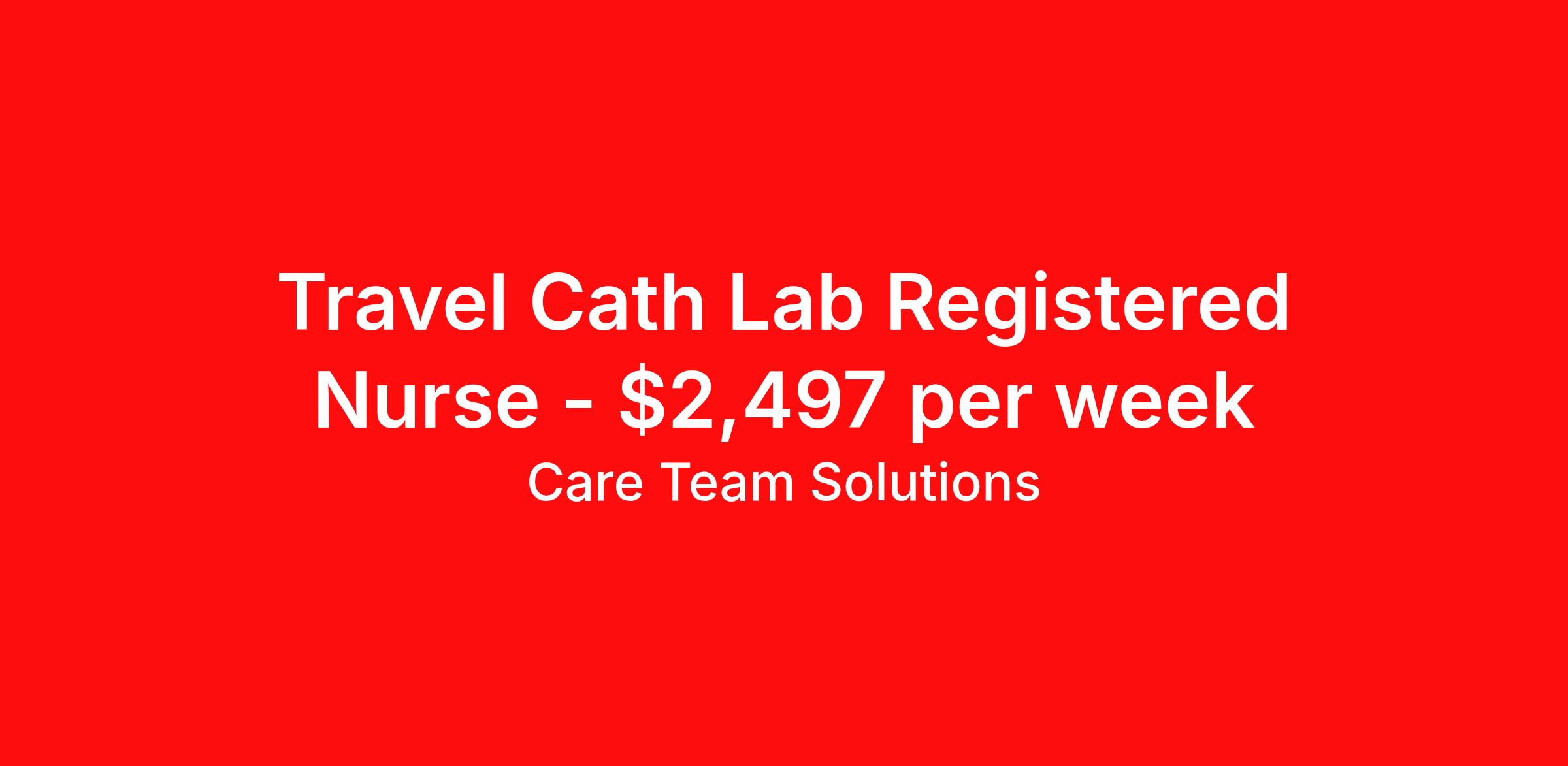 Care Team Solutions is seeking a travel nurse RN Cardiac Cath Lab for a travel nursing job in Lebanon, Indiana. Job Description & Requirements Specialty: Cardiac Cath Lab Discipline: RN Start Date: 03/23/2026 Duration: 13 weeks 40 hours per week Shift: 8 hours Employment Type: Travel Registered Nurse must have 2 years of recent experience in particular specialty Details: Must Have 2 Years of recent Catheterization Laboratory experience. Specialty: Catheterization Laboratory Discipline: Registered Nurse Start Date: 2026-03-23 Duration: 13 Weeks Shift: 8 Hours Day shift Hours Per Week: 40 Hours Employment Type: Contract Gross Weekly Pay: $2496.55 Six things that won’t happen if you apply to this job: You won’t have to guess what the downsides are. We’ll tell you up front. You won’t show up on day 1 and find out this is not what you signed up for. We won't leave your phone call ringing when it's inconvenient. Business hours for you are business hours for us. You won’t get shuffled to some customer service rep when a problem pops up. If we screw up something in securing your placement, we'll own it. That means it's on us to make it right. You won’t figure out your credentials alone. Our credentialing experts will walk you through it step by step. We've talked to thousands of travel nurses like you. We know you want good pay. You want to choose when you work. But the one thing nurse after nurse has said they want and don't have is someone in their corner. There's a lot in this business that’s messed up. We’re trying to be the people that fix it. You and every nurse with the guts to travel deserve it. We've worked hard for you to enjoy some one-of-a-kind benefits you'll not likely find anywhere else, because they benefit you more than they benefit us: Our early pay program Student loan reimbursement Free well-being tele-visits with a psychologist Care Team Solutions Job ID 585720. Pay package is based on 8 hour shifts and 40 hours per week (subject to confirmation) with tax-free stipend amount to be determined. Posted job title: Cath Lab Registered Nurse About Care Team Solutions Two brothers who give an enormous damn. We're Justin and Kyle. Neither of us are nurses. It doesn’t take a nurse to see that the way travel nurses are treated sucks. Nursing is already hard enough. Travel nursing takes serious guts. You get the toughest assignments in places you’ve never been. Which can be fun, but it’s also stressful. You’re in your element but outside of your hometown. You can be a stranger on the team. If anyone deserves someone in their corner, it’s you. But that’s not how most agencies operate. Which is why travel nurses hate working with them. We got into this business because we saw bucket-loads of nurses moving through the "churn and burn" travel machinery. We absolutely hate that. You'll do your best work when you have the placements you want and feel fully supported in your work. We pay our people well because we want them to treat you well. Our recruiters are amazing (we picked each of them ourselves), but if you've got a problem too big for them, they can come straight to us. We work like ten feet away. The "Churners and Burners" promise you the same benefits. They might as well copy/paste them from each other. We have them too: 401k, holiday pay, healthcare, dental, travel reimbursement, etc But we've worked hard for you to enjoy some one-of-a-kind benefits you'll not likely find anywhere else, because they benefit you more than they benefit us: Our early pay program Student loan reimbursement Free well-being tele-visits with a psychologist Benefits Weekly pay Holiday Pay Guaranteed Hours 401k retirement plan Wellness and fitness programs Referral bonus Medical benefits Dental benefits Vision benefits School loan reimbursement