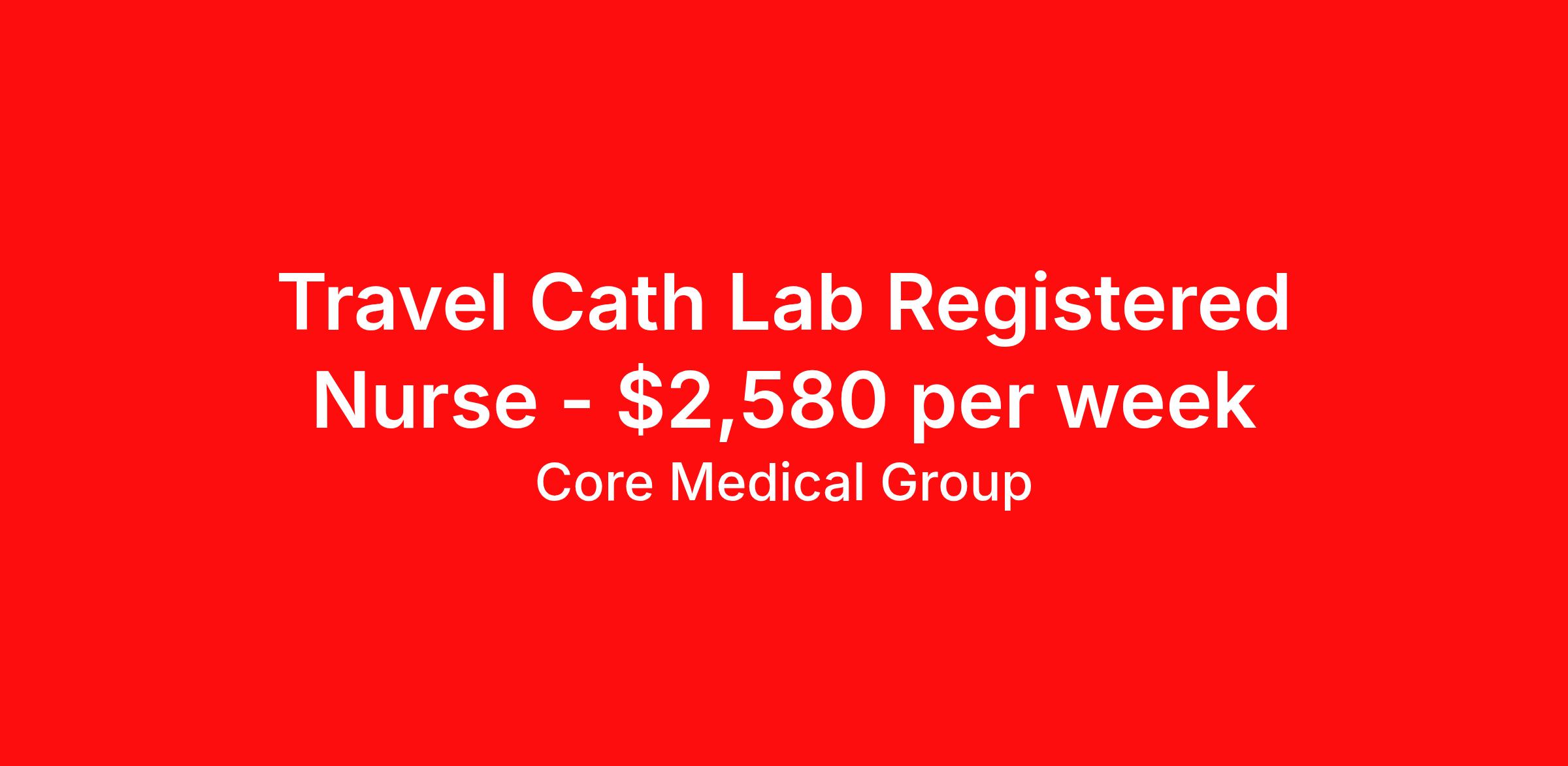Core Medical Group is seeking a travel nurse RN Cardiac Cath Lab for a travel nursing job in Cleveland, Ohio. Job Description & Requirements Specialty: Cardiac Cath Lab Discipline: RN Start Date: 03/23/2026 Duration: 13 weeks 40 hours per week Shift: 8 hours Employment Type: Travel Client in OH seeking Registered Nurse: Cath Lab for the following shift(s): Days We are looking for a healthcare professional who is ready to provide exceptional patient care in this contract/travel role. Contract/travel assignments are typically 13 weeks, with potential to extend. Help us continue our mission to connect people, improve lives, and give back to the community by joining the CoreMedical Group team. When you work with CoreMedical Group, we put you first and treat you like family, supporting you every step of the way. CoreMedical Group is one of the largest healthcare staffing agencies in the country, with travel and contract positions located across the United States. Our recruiters will help you find the perfect job, whether it's across the country or across the street. In addition to dedicated, personalized support from your recruiter, when you work with CoreMedical Group you'll receive: Access to an extensive benefits package, including day 1 health, dental, and vision insurance, employer paid life insurance, a health reimbursement account, and more! Weekly paychecks with competitive pay packages Matching 401(k) benefits to help you save for retirement Licensure assistance and reimbursement to set you up for success on your contract Travel reimbursement and dedicated housing support while on assignment Referral cash bonuses when you connect us with other clinicians CoreMedical Group also offers you a free, all-inclusive vacation each year as our way of saying "thank you" for your hard work. Join other healthcare professionals on the annual Club CoreMed retreat and you'll see why our contract and travel professionals come back to us year after year! Your career is too valuable to tackle on your own. Let CoreMedical Group help you with your healthcare journey! *Estimate of weekly payments is intended for informational purposes and includes hourly wages, as well as reimbursements for meal & incidental expenses, and housing expenses incurred on behalf of the Company. Any benefits (medical/dental/vision) are in addition to the weekly pay. Please speak with your Recruiter for additional details. Estimated payments are subject to change until formal offer of assignment is made and accepted. Core Medical Group Job ID 1316986. Pay package is based on 8 hour shifts and 40 hours per week (subject to confirmation) with tax-free stipend amount to be determined. Posted job title: RN About Core Medical Group CoreMedical Group is one of the largest healthcare staffing agencies in the country. We have jobs nationwide in travel nursing, travel allied health, interim, locum tenens, and permanent placements! Join the staffing agency with Club CoreMed, the best perk in the industry - an all inclusive paid trip to a tropical resort! Benefits Weekly pay Holiday Pay Guaranteed Hours Continuing Education 401k retirement plan Pet insurance Company provided housing options Sick pay Wellness and fitness programs Mileage reimbursement Referral bonus Employee assistance programs Medical benefits Dental benefits Vision benefits Benefits start day 1 License and certification reimbursement Life insurance Discount program