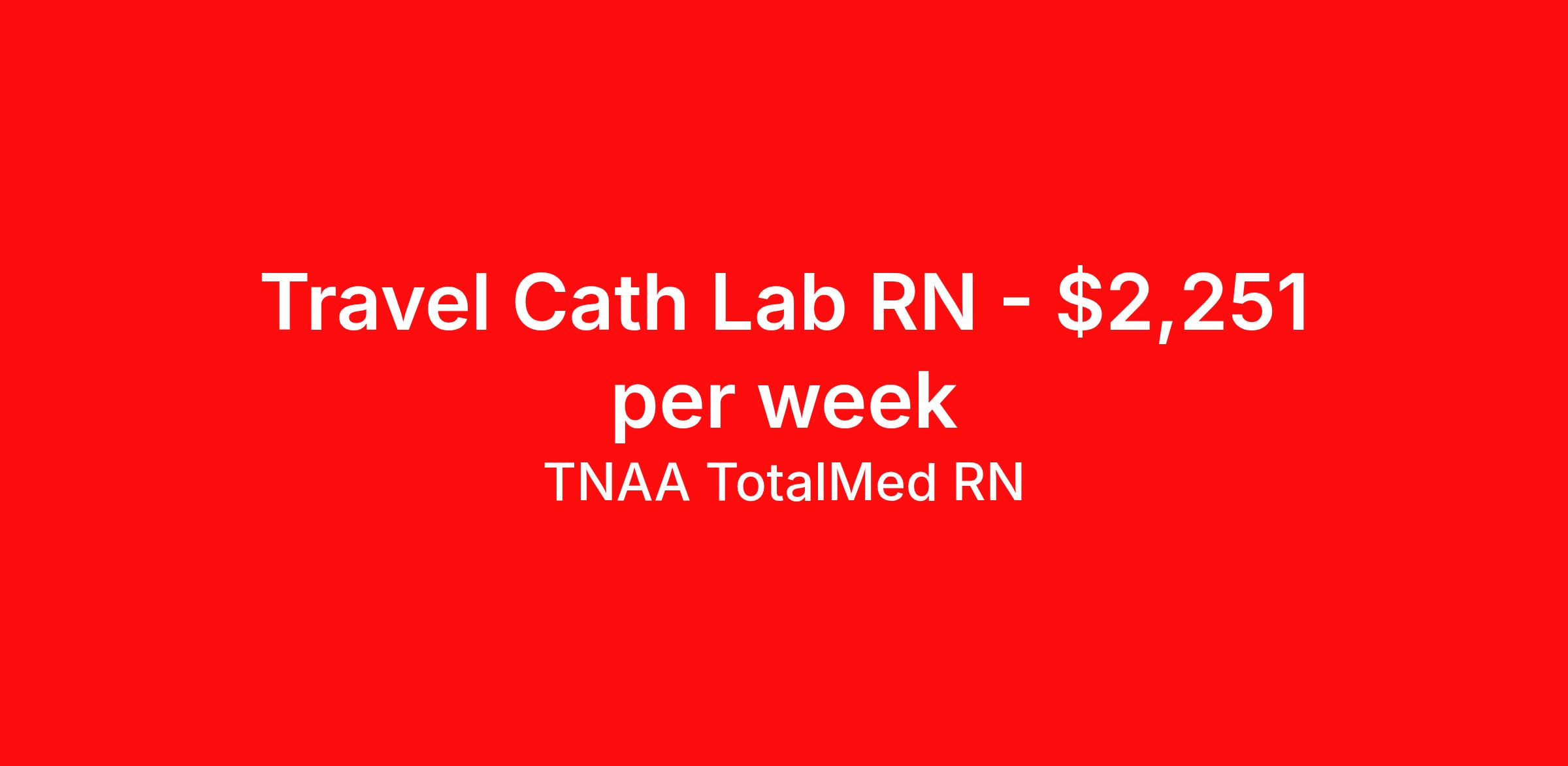 TNAA TotalMed RN is seeking a travel nurse RN Cardiac Cath Lab for a travel nursing job in West Jordan, Utah. Job Description & Requirements Specialty: Cardiac Cath Lab Discipline: RN Start Date: 04/06/2026 Duration: 13 weeks 36 hours per week Shift: 9 hours, days Employment Type: Travel We're looking for Cardiac Cath Lab RNs for an immediate travel nurse opening in West Jordan, UT. The right RN should have 1-2 years recent acute care experience. Read below for more requirements. As a Cath Lab RN, you'll work with a highly skilled team of medical professionals in a cardiovascular surgical environment providing assistance to the physician including maintenance and monitoring of EKG equipment, and assisting during angioplasty, cardiac catheterization and electrophysiology. As a Cath Lab Travel Nurse, you should be prepared to perform the following tasks: Learn complex technologies effectively. Assist physicians with cardiac catheterization as a way to diagnose heart conditions or as a treatment. Assist with angioplasties, valvuloplasties and stent placements. Help implant pacemakers and implantable cardioverter-defibrillators (ICDs). Cath Lab Travel Nurses should be able to stand and walk for long periods of time, as well as bend, lean and stoop without difficulty. RNs should be able to easily lift 20 pounds. Moving or lifting of patients may require lifting of up to 50 pounds at times. Because of the fast-paced environment, Cardiac Cath Lab Travel Nurses must possess good skills for coping with stress and be able to relate to people of all ages and backgrounds. Requirements*: ACLS, BLS, 1 Year * Additional certifications may be required before beginning an assignment. TotalMed Travel Job ID 1394790. Pay package is based on 9 hour shifts and 36 hours per week (subject to confirmation) with tax-free stipend amount to be determined. Posted job title: Catheterization lab - CathLab RN - Travel Nurse About TNAA TotalMed RN TotalMed is a Top Ten, travel nursing and healthcare staffing agency with the mission of igniting purpose in healthcare. The organization staffs nurses, therapists, pharmacists, and other clinicians of all specialties in all 50 states. They offer local and travel jobs and match caregivers with the right organization to assist both facilities and patients. As an organization, they focus on putting highly-skilled staff into facilities to ensure adequate staffing for a better patient experience. TotalMed specializes in recruiting and placing healthcare professionals in travel, PRN, and permanent positions across the country in Nursing and Allied Health. Throughout 2020, the organization filled roles at even the most short-staffed facilities during the most challenging time in healthcare. By matching the right travel healthcare professional with the right organization, TotalMed continues to offer a lifeline to facilities and their patients. Benefits Weekly pay Guaranteed Hours Continuing Education 401k retirement plan Sick pay Wellness and fitness programs Referral bonus Employee assistance programs Medical benefits Dental benefits Vision benefits Benefits start day 1