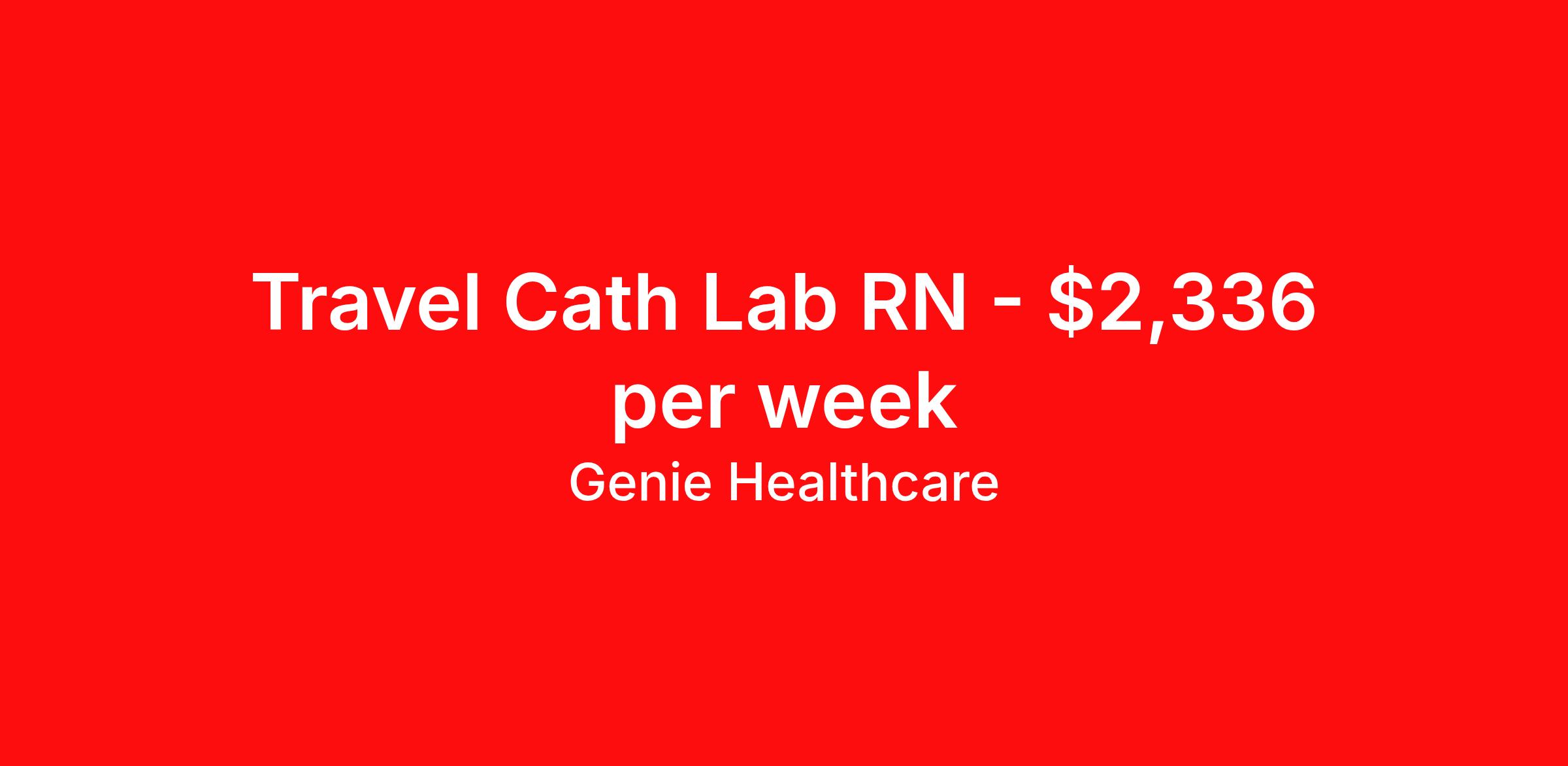 Genie Healthcare is seeking a travel nurse RN Cardiac Cath Lab for a travel nursing job in Lawton, Oklahoma. Job Description & Requirements Specialty: Cardiac Cath Lab Discipline: RN Start Date: 04/13/2026 Duration: 13 weeks 40 hours per week Shift: 8 hours, days Employment Type: Travel Genie Healthcare is looking for a RN to work in Cath Lab for a 13 weeks travel assignment located in Lawton, OK for the Shift (5x8 Days - Please verify shift details with recruiter, 07:00:00-15:00:00, 8.00-5). Pay and benefits packages are estimated based on client bill rate at time the job was posted. These rates are subject to change. Exact pay and benefits vary based on several things, including, but not limited to, guaranteed hours, client changes in bill rate, experience, etc. Benefits: Medical Insurance, Dental Insurance, Vision Insurance, 401(k) with company matching (50% up to 6% of what you contribute) Genie Healthcare Job ID 17971295. Pay package is based on 8 hour shifts and 40.0 hours per week (subject to confirmation) with tax-free stipend amount to be determined. Posted job title: RN:Cath Lab,07:00:00-15:00:00 About Genie Healthcare Genie Healthcare is one of the fastest growing Nurse Travel Agencies in the USA. Genie serves hundreds of facilities and has over 4000 current travel RN contracts open at any given time. Genie provides travel RN’s flexibility, support, top pay scale, housing and the 1 rated, multi-state health insurance coverage. Genie Healthcare carries with it a commitment to providing a comprehensive level of service and quality care. Growing from a small team of eager recruiters to a company with satisfied clients in nearly every corner of the nation, delivering excellence in patient and customer care is the key to Genie’s success. The management team has 20 years of experience in workforce solutions and staffing in medical and non-medical fields, roles ranging from Clerical job to Cardiologist to software developer to CEO.
