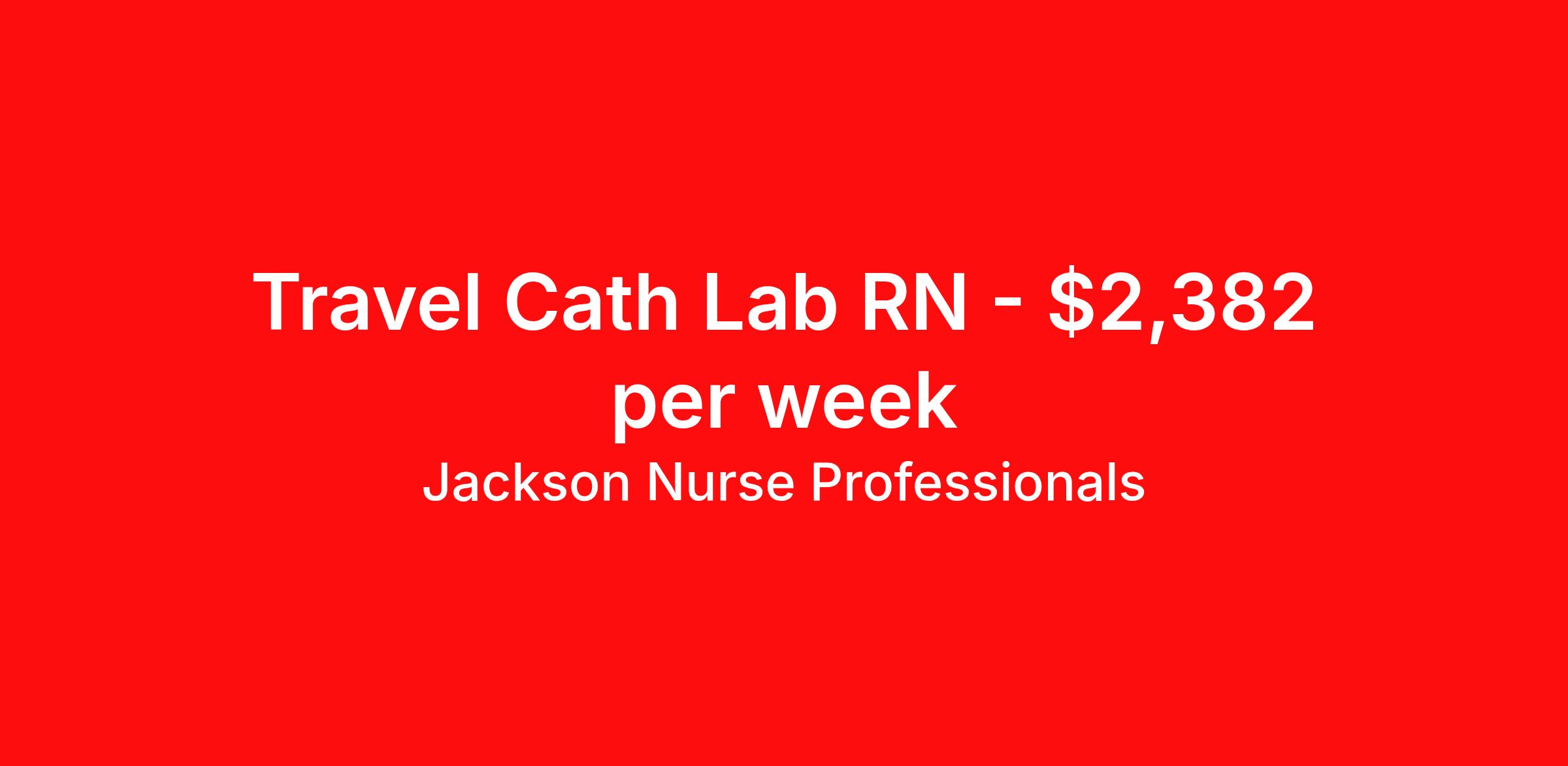 Jackson Nurse Professionals is seeking a travel nurse RN Cardiac Cath Lab for a travel nursing job in Greeley, Colorado. Job Description & Requirements Specialty: Cardiac Cath Lab Discipline: RN Start Date: 04/06/2026 Duration: 13 weeks 40 hours per week Shift: 10 hours, days Employment Type: Travel At Jackson Nurse Professionals , we are dedicated to supporting travel nurses and helping you build a fulfilling nursing career. Whether you’re looking for your first or next travel nursing assignment, we specialize in connecting healthcare professionals with leading medical facilities. With a focus on personalized service and a wide range of opportunities, we make it easier than ever for nurses to find the right balance of adventure and professional growth. Qualifications: 2 years of recent experience in area of specialty listed on job Current BLS required (certifications vary by location – job may require ACLS) Valid license and/or certification in state of practice Valid Driver's License Background and drug screen Benefits: Full Medical, Dental and Vision Insurance 401(k) with Employer Match 24/7/365 Support from your Recruiter available by text, phone, or email Referral Bonus Program: Give $200, Get $500 for every referral Same Day Immediate Pay Access Certification & Licensure Reimbursement Apply today to experience the Jackson Nurse Professionals difference! Jackson Nurse Professionals Job ID 2475002. Pay package is based on 10 hour shifts and 40 hours per week (subject to confirmation) with tax-free stipend amount to be determined. About Jackson Nurse Professionals Filling critical needs in patient care, Jackson Nurse Professionals delivers cost-effective travel nurse staffing solutions to over 500 hospitals, outpatient clinics, and home health clients nationwide. Awarded Best of Staffing - Talent and Client 2024, and rated as a Top Workplace 2023 by the Orlando Sentinel, Jackson Nurse Professionals goes the extra mile to provide travel nurses the career they deserve, while providing clients with a large range of highly skilled nurses to fill short, long-term, and temporary assignments. As a member of Jackson Healthcare’s family of award-winning staffing companies, we’re part of a growing community that’s impacting 10 million patients nationwide. Join our mission to improve the delivery of patient care, and the lives of everyone we touch.