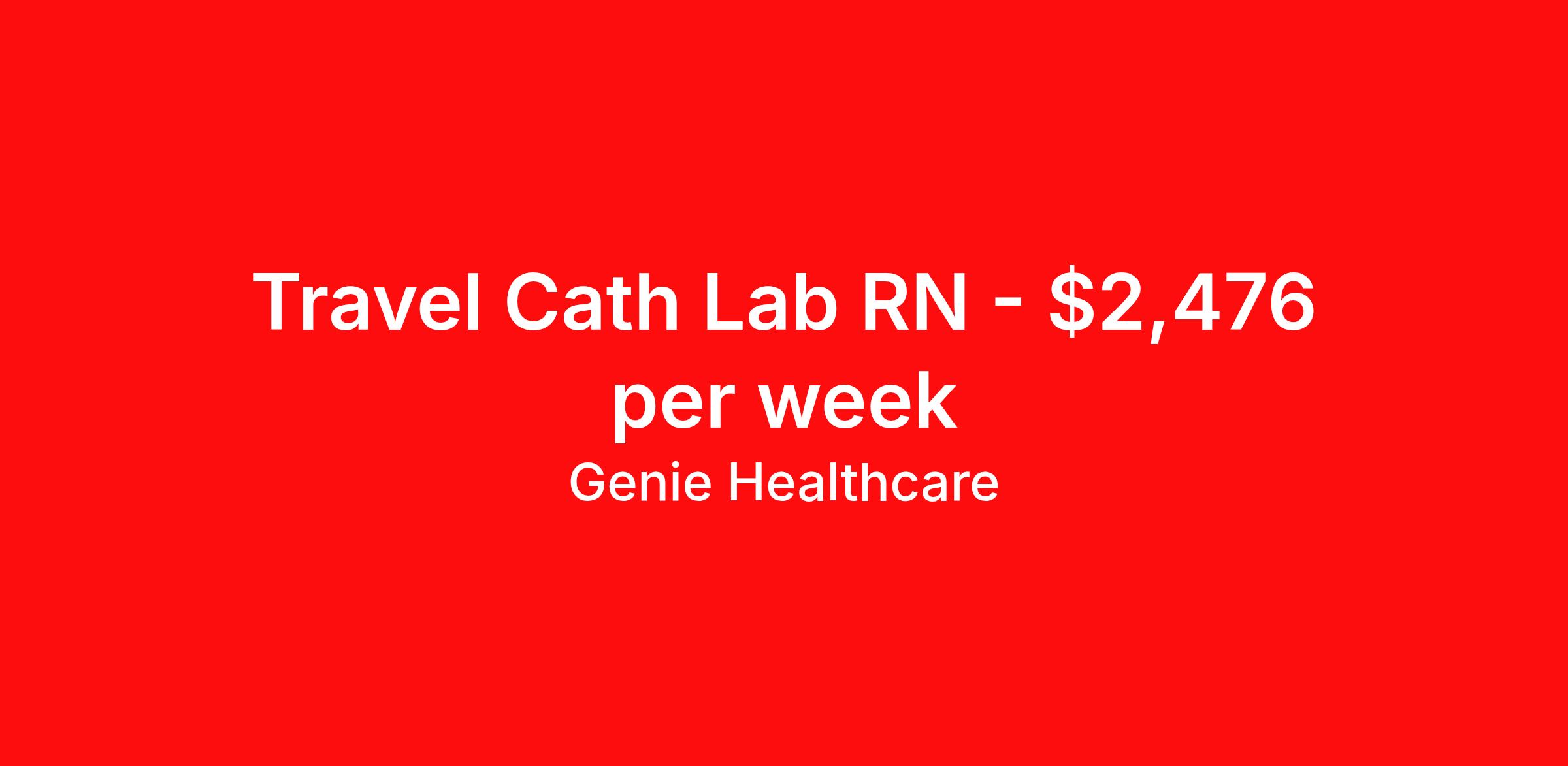 Genie Healthcare is seeking a travel nurse RN Cardiac Cath Lab for a travel nursing job in Snellville, Georgia. Job Description & Requirements Specialty: Cardiac Cath Lab Discipline: RN Start Date: 04/13/2026 Duration: 14 weeks 40 hours per week Shift: 10 hours, days Employment Type: Travel Genie Healthcare is looking for a RN to work in Cath Lab for a 14 weeks travel assignment located in Snellville, GA for the Shift (4x10 Days-Please verify shift details with recruiter, 07:00:00-17:00:00, 10.00-4). Pay and benefits packages are estimated based on client bill rate at time the job was posted. These rates are subject to change. Exact pay and benefits vary based on several things, including, but not limited to, guaranteed hours, client changes in bill rate, experience, etc. Benefits: Medical Insurance, Dental Insurance, Vision Insurance, 401(k) with company matching (50% up to 6% of what you contribute) Genie Healthcare Job ID 17987553. Pay package is based on 10 hour shifts and 40.0 hours per week (subject to confirmation) with tax-free stipend amount to be determined. Posted job title: RN:Cath Lab,07:00:00-17:00:00 About Genie Healthcare Genie Healthcare is one of the fastest growing Nurse Travel Agencies in the USA. Genie serves hundreds of facilities and has over 4000 current travel RN contracts open at any given time. Genie provides travel RN’s flexibility, support, top pay scale, housing and the 1 rated, multi-state health insurance coverage. Genie Healthcare carries with it a commitment to providing a comprehensive level of service and quality care. Growing from a small team of eager recruiters to a company with satisfied clients in nearly every corner of the nation, delivering excellence in patient and customer care is the key to Genie’s success. The management team has 20 years of experience in workforce solutions and staffing in medical and non-medical fields, roles ranging from Clerical job to Cardiologist to software developer to CEO.