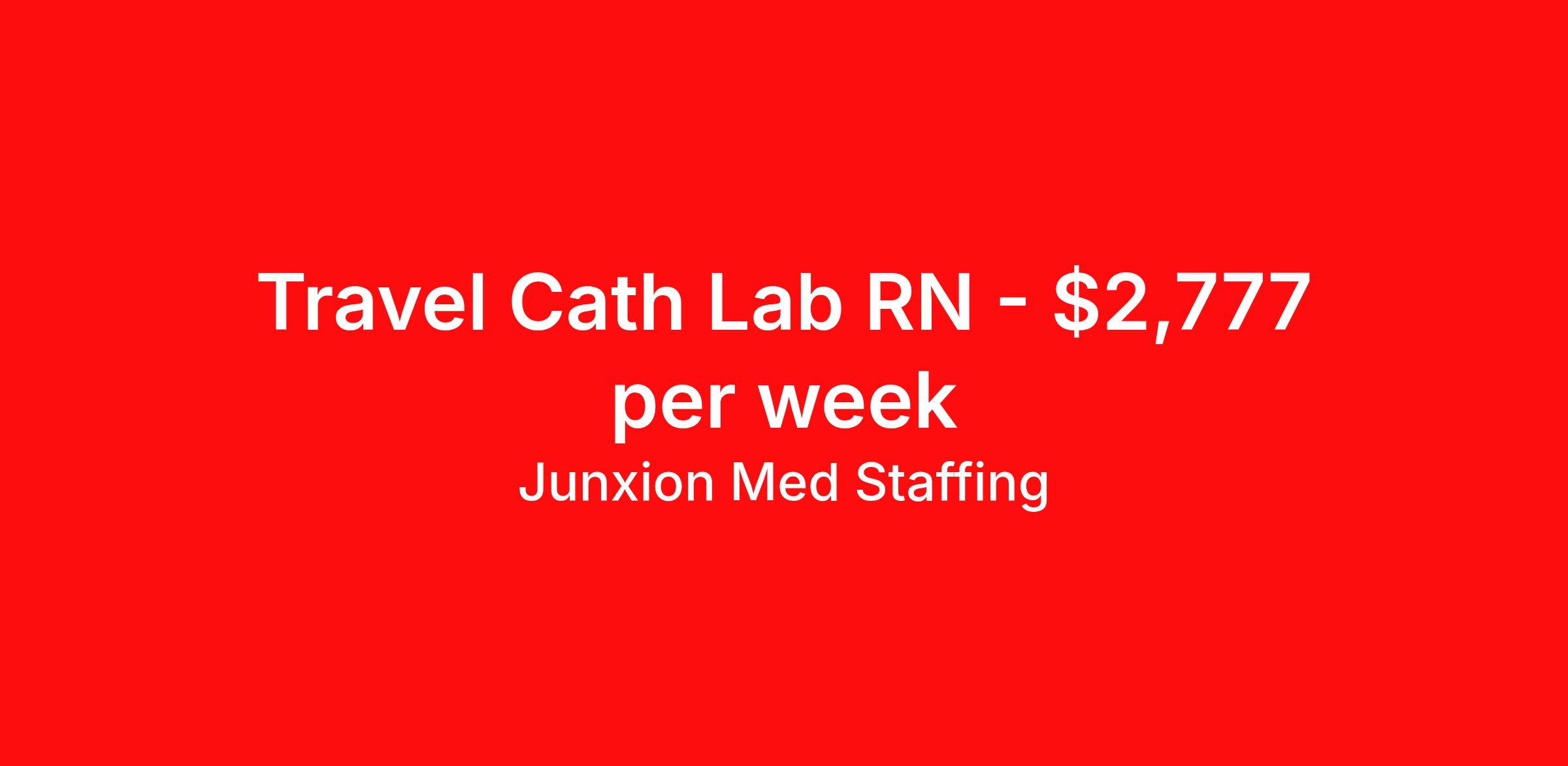 Junxion Med Staffing is seeking a travel nurse RN Cardiac Cath Lab for a travel nursing job in Bloomington, Illinois. Job Description & Requirements Specialty: Cardiac Cath Lab Discipline: RN Start Date: 03/30/2026 Duration: 13 weeks 36 hours per week Shift: 9 hours Employment Type: Travel Summary: Junxion Med Staffing is looking for a Cath lab RN to take an assignment in Bloomington, Illinois. This assignment lasts 13.14 WEEKS and is scheduled to start on March 30, 2026. If you don't like the start date, pay, or shift, then let’s talk. Give us a call opt 1 Job Details: Shift: 4x9/ 36 H Total Weekly Hours: 36 Certifications: BLS, BLS, ACLS Trauma Level: Benefits: Day 1 Insurance Additional bonus potential for every contract Additional vacation incentives Medical insurance with no more than $175 monthly premium for employee Employee Assistance Program (EAP) Referral bonus up to $1,000 401K and access to financial advisors for financial wellness and education A dedicated recruiter and support team that will help you every step of the way to sure you start on time and have an exceptional experience An agency ran by a traveler for travelers Click here for licensing requirements About the Company: Junxion Med Staffing is an award-winning healthcare staffing company with a mission to provide quality healthcare to our communities. Apply today to speak with a recruiter! Awards: RNVIP- Top 10 Travel Nursing Agencies of 2024 BluePipes – The Best Travel Nursing Companies 2023 *Estimated weekly pay includes projected hourly wages and weekly meal and lodging per diems for eligible clinicians based on nationally published GSA rates. Actual weekly pay and per diems may differ from the amount shown and may be subject to change during an assignment. For all employees and employee applicants, Junxion Med Staffing is an Equal Employment Opportunity ("EEO") Employer, including Disability/Vets, and welcomes all to apply. Junxion Med Staffing Job ID 1362843. Pay package is based on 9 hour shifts and 36 hours per week (subject to confirmation) with tax-free stipend amount to be determined. About Junxion Med Staffing Junxion Med Staffing was founded by a former healthcare traveler who understands the challenges healthcare professionals face - because we’ve been there. We specialize in placing travel nurses, allied health professionals, physicians, physician assistants, and nurse practitioners in both short-term and permanent roles across a wide range of specialties. Whether you're looking for a travel contract or a long-term fit, we work to ensure the right match between each healthcare professional and facility. At Junxion, we keep it simple: ● Transparent communication. No surprises, no hidden details, just honest conversations so you always know what to expect. ● Dedicated support. From job search to contract negotiations and throughout your assignment, you’ll have a recruiter who’s with you every step of the way. ● Competitive pay and benefits. We advocate for you to be fairly compensated and supported in your goals. ● A focus on your success. When healthcare professionals feel valued and empowered, patient care improves and that’s what it’s all about. You’re not just a number here. You’re part of a team that actually cares. Let’s find your next great opportunity together. Benefits Weekly pay Referral bonus Dental benefits Vision benefits 401k retirement plan Medical benefits Mileage reimbursement