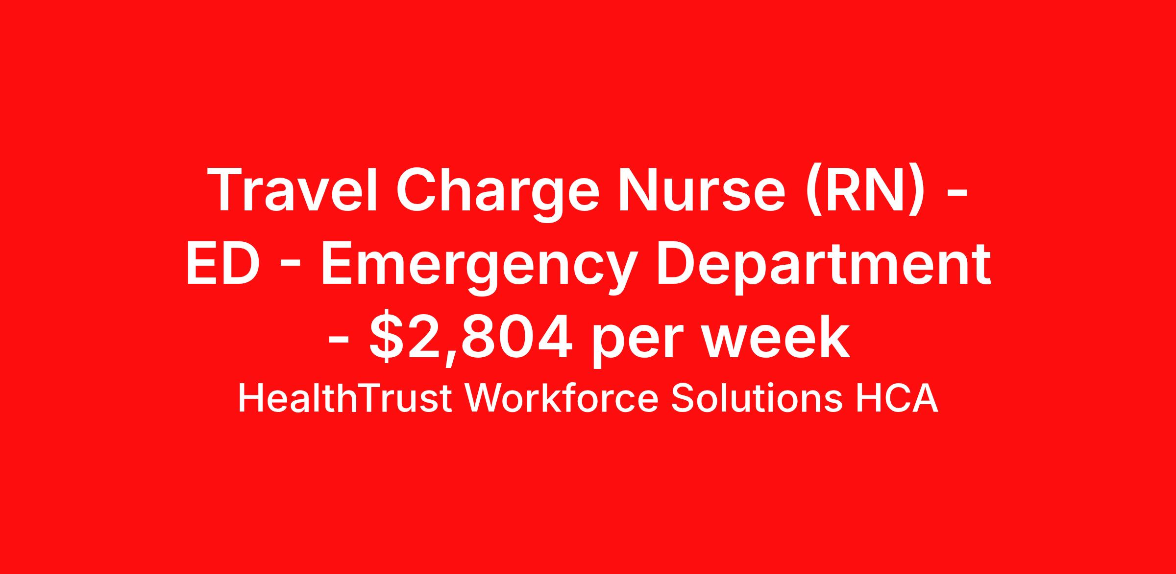 HealthTrust Workforce Solutions HCA is seeking a travel ED - Emergency Department Charge Nurse (RN) for a travel nursing job in Asheville, North Carolina. Job Description & Requirements Specialty: ED - Emergency Department Discipline: RN Start Date: 04/06/2026 Duration: 13 weeks 36 hours per week Shift: 12 hours, nights Employment Type: Travel Night Shift Must have Level 1 Charge RN ED Experience Must have ACLS, BLS, PALS, TNCC, CPI Must have : 2 years’ experience as a nurse with at least 1-year experience in ER setting, teamwork mentality, ability to coach and give feedback in real time. Flexibility to work in all areas of the ED. Active NC RN/ Compact License Guaranteed Hours Weekly Pay About HealthTrust Workforce Solutions HCA At HealthTrust Workforce Solutions, healthcare is not just about the four walls of a facility but about the people who provide and receive care. Our focus is on empowering healthcare professionals to deliver exceptional patient experiences by providing them with the necessary skills, tools, and support. We partner with healthcare facilities nationwide to ensure that the right professionals are in the right roles. We prioritize our clinicians by giving them a voice and access to opportunities to fulfill their mission of improving lives by providing quality patient care. We are committed to our core values of Trust, Innovation, Adaptability, Courage, and Accountability. We are dedicated to positively impacting the healthcare industry by providing first-priority access to more than 200,000 jobs nationwide to our healthcare professionals. Join us and be part of the HealthTrust family, where you can make a difference every day. We embrace our changing environment, and we maintain a culture that has a rich tradition of transforming itself to meet the challenges of the future. MISSION STATEMENT While putting great people in the right roles is essential, our mission is far greater. We want our clinicians to be part of the HealthTrust family, where healthcare professionals have a voice and are empowered with the right tools and opportunities to fulfill their personal mission of improving lives. Plus, as a preferred partner to thousands of top-performing hospitals, we provide our healthcare professionals with first-priority access to more than 200,000 jobs nationwide. Benefits Dental benefits Vision benefits Referral bonus Continuing Education Life insurance