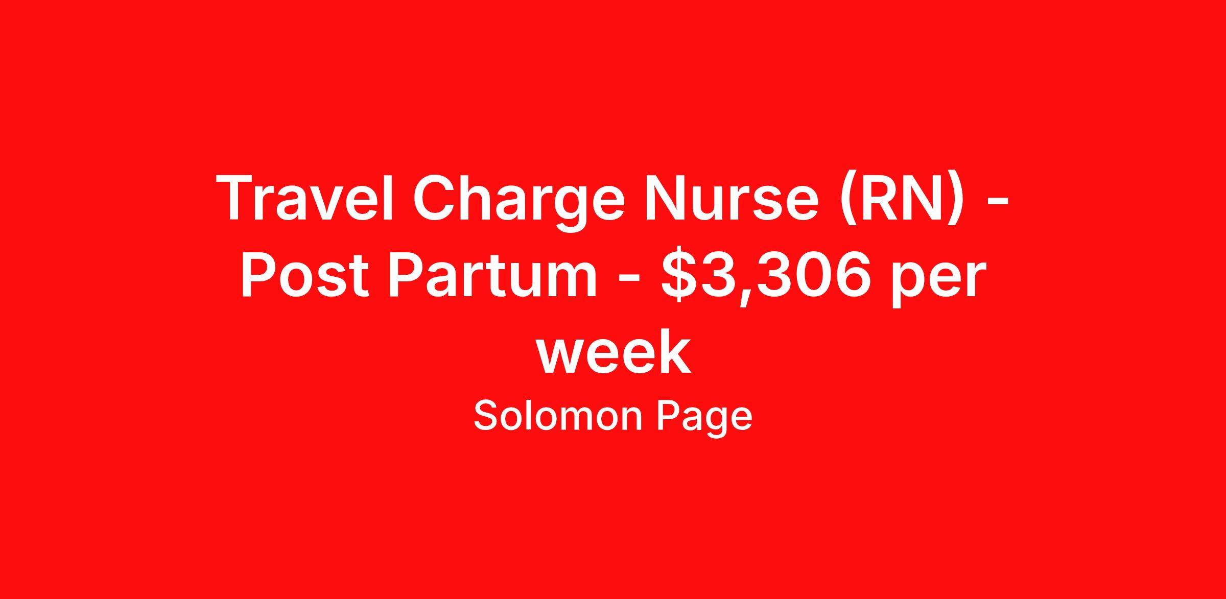 Solomon Page is seeking a travel Post Partum Charge Nurse (RN) for a travel nursing job in Salinas, California. Job Description & Requirements Specialty: Post Partum Discipline: RN Start Date: 03/23/2026 Duration: 13 weeks 40 hours per week Shift: 10 hours, rotating Employment Type: Travel Our client is looking to add a Registered Nurse to their team. Job Details: Location: Salinas, California Duration: 13 Weeks Start Date: 03/23/2026 Shift: 4x10 Rotating Estimated Gross Weekly Pay: 3306 Qualifications: Current California license Excellent interpersonal skills including patience, empathy, and compassion Effective communication skills, including active listening, writing, speaking and reading comprehension Fast and adaptive problem-solving abilities Ability to stand for long periods of time If you meet the required qualifications and are interested in this role, please apply today. Why Work with Us The success of Solomon Page is defined by our people. Offering a comprehensive benefits package, travel nurses have immediate access to medical coverage and ReviveHealth virtual care. Additionally, you are offered access to dental and vision coverage, commuter benefits, a 401(k) plan, flexible spending, referral bonuses, ongoing training, and more. As an ESOP company, Solomon Page offers an employee stock ownership plan to all consultants. As a member of our traveler community, you will join a nurturing culture that fosters your career goals. Solomon Page can connect you with your next opportunity – whether it is in your hometown, or you are looking to travel to a new destination. About Solomon Page Healthcare & Medical Staffing Accredited by the Joint Commission with the Gold Seal of Approval, Solomon Page prides ourselves in developing long-term relationships with healthcare providers based on trust and respect. Our experienced Healthcare and Medical Staffing experts are committed to providing safe and quality patient care through our wide network of travel nurses, locum tenens, and allied resources. For more information and additional healthcare opportunities, visit: solomonpage.com and connect with Solomon Page on Instagram, Facebook, Twitter, LinkedIn, and TikTok. Solomon Page Job ID 431538. Pay package is based on 10 hour shifts and 40 hours per week (subject to confirmation) with tax-free stipend amount to be determined. Posted job title: nurse - rn - postpartum - charge nurse | salinas, california About Solomon Page Founded in 1990, Solomon Page has grown to be a leader in the staffing industry. As a member of our healthcare provider community, you will join a nurturing culture that fosters your career goals. We have the network and resources to connect you with your next opportunity – whether it is in your hometown, or you are looking to travel to a new destination. Accredited by the Joint Commission with the Gold Seal of Approval, Solomon Page prides itself in developing long-term relationships with healthcare providers based on trust and respect. Headquartered in New York with offices throughout the United States our experienced healthcare and medical staffing experts are committed to providing safe and quality patient care through our wide network of travel nurses, locum tenens, and allied resources. For more information and additional healthcare opportunities, visit: solomonpage.com /healthcare and connect with us on Facebook , Twitter , Instagram , Tik Tok , and LinkedIn. ReviveHealth Virtual Care: Available immediately. Receive free, 100% company paid, virtual care access. Upon commencement of your employment, Solomon Page offers automatic enrollment into ReviveHealth, which offers concierge, membership-based access to virtual primary care, urgent care, mental health therapy, a vision program, and prescription medications. Medical Coverage : Available immediately . Whether you are looking to enroll in single or family insurance, you have immediate access to quality coverage. Dental Coverage : Available the 1st of the month after your hire date . We offer dental insurance to you and your dependents. Vision Coverage : Available the 1st of the month after your hire date . We offer vision insurance to you and your dependents. Commuter Benefits: Available the 1st of the month after your hire date . Set aside pre-tax money to pay for public transportation. 401K Plan: Associates can enroll in the 401K plan after they have worked 1000 hours. ESOP Benefits: As an ESOP company, Solomon Page offers an employee stock ownership plan. Referral Bonus: A cash bonus is offered for referring a candidate to Solomon Page who gets placed. Training & Support: Training programs and ongoing career coaching and support is offered to consultants. Benefits Medical benefits Dental benefits Vision benefits 401k retirement plan Referral bonus