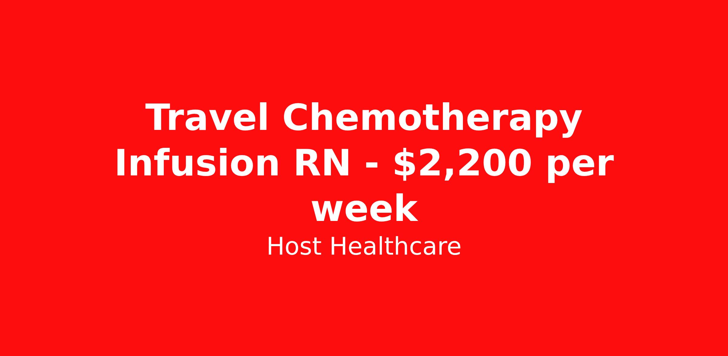 Host Healthcare is seeking a travel nurse RN Infusion for a travel nursing job in Crescent City, California. Job Description & Requirements Specialty: Infusion Discipline: RN Start Date: 03/30/2026 Duration: 13 weeks 40 hours per week Shift: 8 hours, days Employment Type: Travel Host Healthcare Job ID a1fVX000002uhQvYAI. Pay package is based on 8 hour shifts and 40 hours per week (subject to confirmation) with tax-free stipend amount to be determined. Posted job title: RN - Oncology About Host Healthcare At Host Healthcare, we provide a truly comfortable experience as you explore your travel nursing, therapy, or allied career. We make your travel healthcare journey easy by taking care of all the details, so you don’t have to. We are on a mission to help others live better and we do this by helping the healers of the world be as comfortable as possible. With access to tens of thousands of travel nursing, therapy, and allied jobs in all 50 states, our responsive and friendly recruiters find your dream position based on what’s important to you. During your assignment, get access to premium benefits, including Day 1 medical that continues up to 30 days between assignments, 401K matching, travel reimbursements, dedicated housing support, and more. We also offer 24/7 support from our team and access to our on-staff clinicians so you can feel comfortable and confident throughout your entire assignment. Travel comfortably with Host Healthcare. Benefits Referral bonus School loan reimbursement Vision benefits Wellness and fitness programs Company provided housing options License and certification reimbursement Life insurance Medical benefits Mileage reimbursement Pet insurance Discount program Employee assistance programs Guaranteed Hours Health savings account Holiday Pay 401k retirement plan Continuing Education Dental benefits