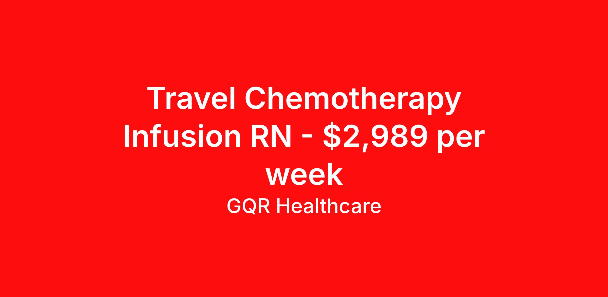 GQR Healthcare is seeking a travel nurse RN Infusion for a travel nursing job in Chico, California. Job Description & Requirements Specialty: Infusion Discipline: RN Start Date: 03/23/2026 Duration: 13 weeks 40 hours per week Shift: 8 hours, days Employment Type: Travel Contract - W2 Oncology Registered Nurse (RN) Job Location: Chico, California Start Date: March 23, 2026 Profession: Registered Nurse (RN) Facility: Estimated Pay: $2989.36 - $3084.36 Duration:13 weeks Specialty:Oncology Shift: Day Shift Details: null Day Job Type: Travel *Estimated weekly pay includes projected hourly wages and weekly meal and lodging per diems for eligible clinicians based on nationally published GSA rates. Actual weekly pay and per diems may differ from the amount shown and are subject to change during an assignment. Benefits: Day 1 Insurance Cigna medical, MetLife dental and vision insurance License reimbursement for new licenses needed for each assignment Discounts with hotels and rental cars A dedicated recruiter and support team that will help you every step of the way to sure you start on time and have an exceptional experience Referral bonus up to $700 About the Company: Finding the right role is about more than just matching skills to a job—it’s about aligning with your goals, values, and the way you want to work. As an award-winning talent partner, we support healthcare professionals through every step of that process, offering meaningful opportunities, clear guidance, and long-term partnership. From our first conversation to your first day on the job (and beyond!), we’re here to help you move forward with confidence. GQR Job ID 787465. Pay package is based on 8 hour shifts and 40 hours per week (subject to confirmation) with tax-free stipend amount to be determined. Posted job title: Registered Nurse (RN) About GQR Healthcare GQR’s Healthcare team specializes in connecting experts within the industry to highly skilled healthcare professionals across the US market. In the competitive healthcare market, we recognize that the industry’s common goals of improved quality of care and patient outcomes are wholly reliant upon the professionals directly supporting these initiatives. Leveraging our extensive candidate network, we deliver continuity of care for the communities our partners serve to ensure the patient experience is of the highest quality. Through deep market specialization and a unique approach to talent acquisition, GQR Healthcare provides an unparalleled and personalized experience across all medical specialties in nursing and within diverse healthcare platforms across the industry.