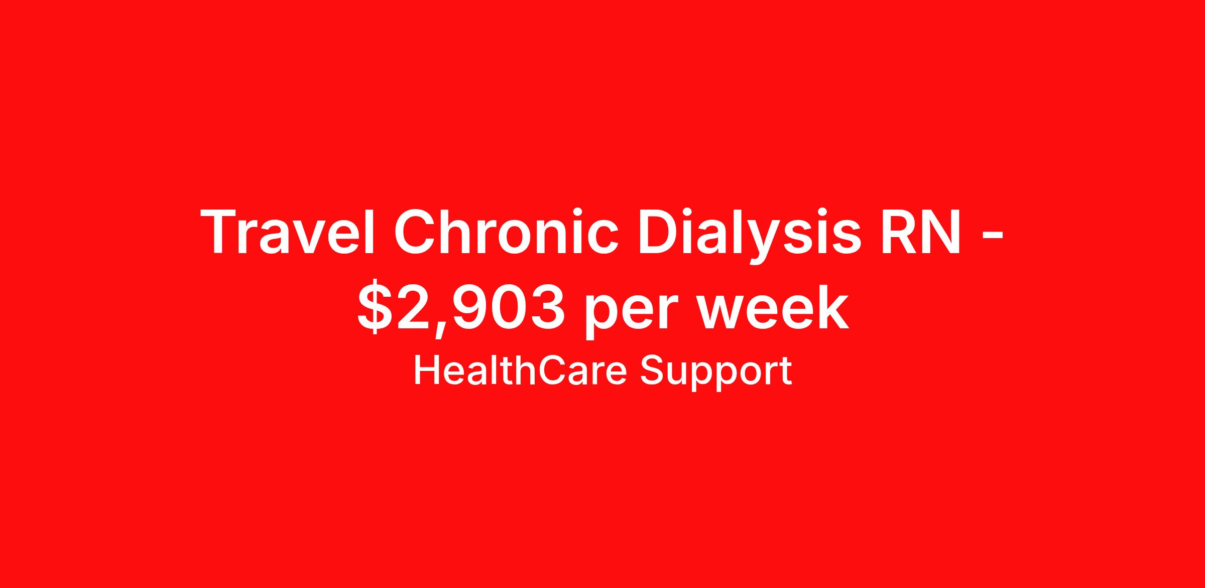 Healthcare Support is seeking a travel nurse RN Dialysis for a travel nursing job in Strongsville, Ohio. Job Description & Requirements Specialty: Dialysis Discipline: RN Start Date: 03/30/2026 Duration: 50 weeks 36 hours per week Shift: 12 hours Employment Type: Travel Now Hiring: Travel Nurse Educator – Dialysis (5008X Trainer) Nationwide Travel | 36 hrs/week | Paid Training Included 50-Week Contract | No Direct Patient Care | RN Role Be part of a groundbreaking national project! We're seeking experienced Dialysis RNs to join a high-impact team rolling out the cutting-edge 5008X dialysis machine in clinics across the U.S. Your Role As a Travel Nurse Educator, you'll: Deliver hands-on training to clinic staff (RNs, LPNs, Techs) on the 5008X machine Travel in 3-week deployment cycles to different clinics nationwide Provide on-site support during live treatments (no direct patient care) Promote safe and effective machine use through collaboration and coaching What You’ll Get 50-week renewable contract – extensions likely! Full paid training (first 6 weeks) Dedicated recruiter to support you throughout your journey Schedules released 2 months in advance – plan with confidence What You’ll Need Active RN license (multi-state highly preferred) 1 year of dialysis RN experience (minimum 1 year in the past 3 years) Current BLS certification Willingness to travel full-time and lead hands-on training Compensation Weeks 1–6 (Training Period) $54/hour, travel stipends included if currently traveling. Varies by location EXAMPLE Pay Package Week 7 and Beyond (Travel Assignments Pay Varies By Location) Taxable Weekly Pay: $1,089 (W2) Non-Taxable Weekly Stipends: $1,869 Total Weekly Pay: $2,958 Healthcare Support Job ID 485754. Pay package is based on 12 hour shifts and 36 hours per week (subject to confirmation) with tax-free stipend amount to be determined. Posted job title: rn chronic dialysis About Healthcare Support Healthcare Support excels at providing a streamlined and red-carpet experience for our travelers. Whether you are a nurse, a therapist, or an allied health professional, our goal is to connect you with top-rated facilities throughout the country and get you on the road to your next adventure. We leverage 20 years of relationships with the industry’s most respectable companies across all 50 states, both through direct client partnerships and via national MSP programs. From health systems and hospitals to specialty clinics and post-acute facilities, you can work where you want to work and go where you want to go. Not only does HealthCare Support reimburse for relocation and travel costs on your first check, but we also offer license and certification reimbursements required for your assignments so that you can focus on building your career. During your assignment, you’ll have access to medical benefits, 24/7 support from our Clinical Advocacy Team, and a travel team with stateside operations. Your travel team will include a designated credentialing expert to help you navigate every step of the on-boarding process, a payroll specialist who you can communicate with directly, and a skilled recruiter who takes the time to understand your needs and works hard to find the right position for you. Don’t get lost in the shuffle of another overblown staffing agency. Choose HealthCare Support to be your trusted partner that you can rely on for all your travel assignments. We can’t wait to hear about the amazing adventures you’ll have! Pst! Ask us about our Direct Hire Opportunities! Benefits License and certification reimbursement Medical benefits Dental benefits Mileage reimbursement Employee assistance programs Referral bonus 401k retirement plan Holiday Pay Weekly pay