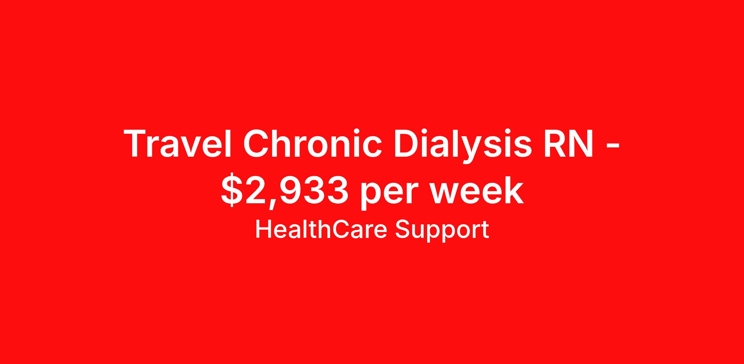Healthcare Support is seeking a travel nurse RN Dialysis for a travel nursing job in Manchester, New Hampshire. Job Description & Requirements Specialty: Dialysis Discipline: RN Start Date: 03/30/2026 Duration: 50 weeks 36 hours per week Shift: 12 hours Employment Type: Travel Now Hiring: Travel Nurse Educator – Dialysis (5008X Trainer) Nationwide Travel | 36 hrs/week | Paid Training Included 50-Week Contract | No Direct Patient Care | RN Role Be part of a groundbreaking national project! We're seeking experienced Dialysis RNs to join a high-impact team rolling out the cutting-edge 5008X dialysis machine in clinics across the U.S. Your Role As a Travel Nurse Educator, you'll: Deliver hands-on training to clinic staff (RNs, LPNs, Techs) on the 5008X machine Travel in 3-week deployment cycles to different clinics nationwide Provide on-site support during live treatments (no direct patient care) Promote safe and effective machine use through collaboration and coaching What You’ll Get 50-week renewable contract – extensions likely! Full paid training (first 6 weeks) Dedicated recruiter to support you throughout your journey Schedules released 2 months in advance – plan with confidence What You’ll Need Active RN license (multi-state highly preferred) 1 year of dialysis RN experience (minimum 1 year in the past 3 years) Current BLS certification Willingness to travel full-time and lead hands-on training Compensation Weeks 1–6 (Training Period) $54/hour, travel stipends included if currently traveling. Varies by location EXAMPLE Pay Package Week 7 and Beyond (Travel Assignments Pay Varies By Location) Taxable Weekly Pay: $1,089 (W2) Non-Taxable Weekly Stipends: $1,869 Total Weekly Pay: $2,958 Healthcare Support Job ID 485766. Pay package is based on 12 hour shifts and 36 hours per week (subject to confirmation) with tax-free stipend amount to be determined. Posted job title: rn chronic dialysis About Healthcare Support Healthcare Support excels at providing a streamlined and red-carpet experience for our travelers. Whether you are a nurse, a therapist, or an allied health professional, our goal is to connect you with top-rated facilities throughout the country and get you on the road to your next adventure. We leverage 20 years of relationships with the industry’s most respectable companies across all 50 states, both through direct client partnerships and via national MSP programs. From health systems and hospitals to specialty clinics and post-acute facilities, you can work where you want to work and go where you want to go. Not only does HealthCare Support reimburse for relocation and travel costs on your first check, but we also offer license and certification reimbursements required for your assignments so that you can focus on building your career. During your assignment, you’ll have access to medical benefits, 24/7 support from our Clinical Advocacy Team, and a travel team with stateside operations. Your travel team will include a designated credentialing expert to help you navigate every step of the on-boarding process, a payroll specialist who you can communicate with directly, and a skilled recruiter who takes the time to understand your needs and works hard to find the right position for you. Don’t get lost in the shuffle of another overblown staffing agency. Choose HealthCare Support to be your trusted partner that you can rely on for all your travel assignments. We can’t wait to hear about the amazing adventures you’ll have! Pst! Ask us about our Direct Hire Opportunities! Benefits License and certification reimbursement Medical benefits Dental benefits Mileage reimbursement Employee assistance programs Referral bonus 401k retirement plan Holiday Pay Weekly pay