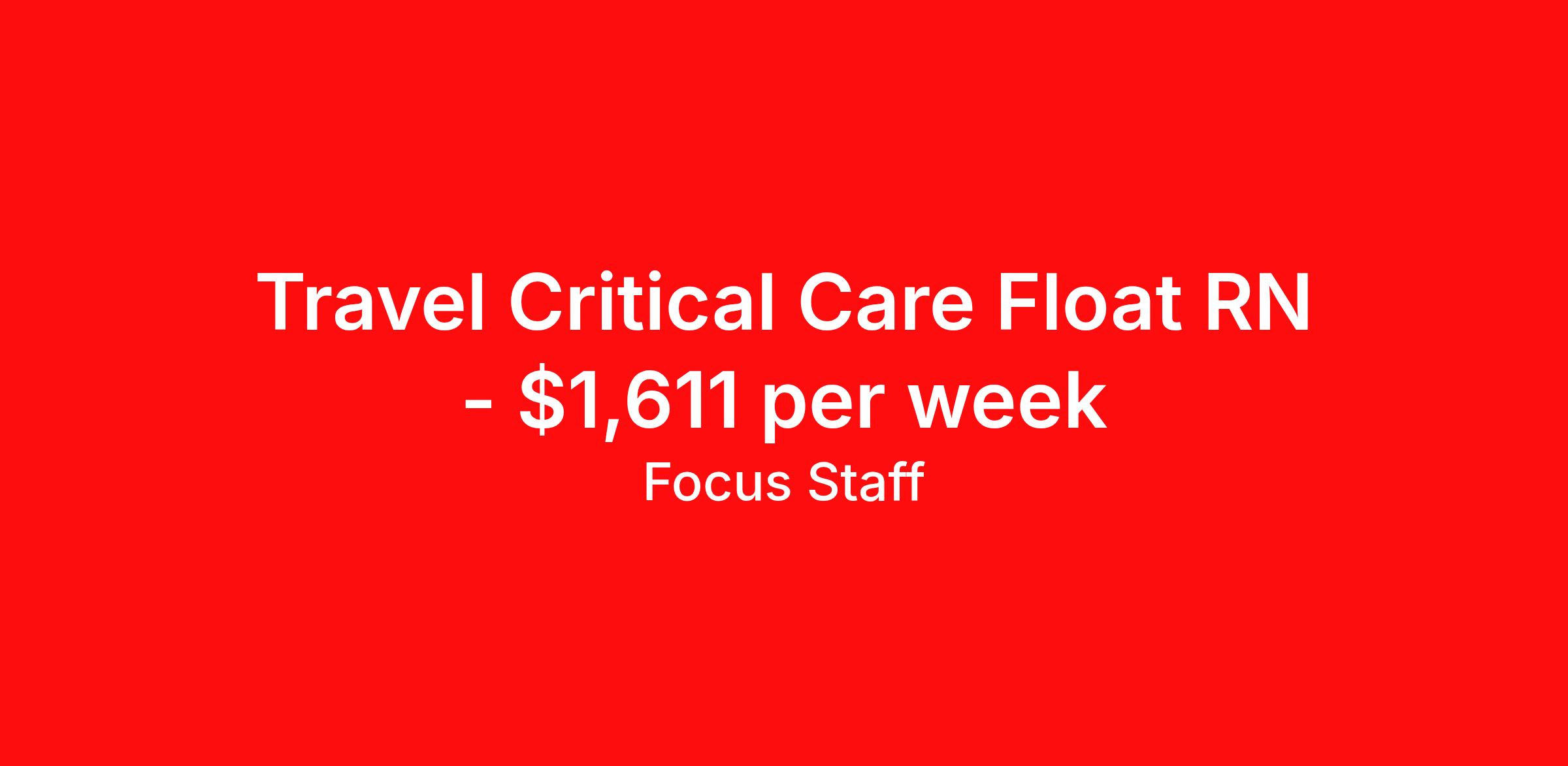 Focus Staff is seeking a travel nurse RN Float ICU - Intensive Care Unit Med Surg for a travel nursing job in Cartersville, Georgia. Job Description & Requirements Specialty: ICU - Intensive Care Unit Discipline: RN Start Date: 03/30/2026 Duration: 8 weeks 36 hours per week Shift: 12 hours, nights Employment Type: Travel We currently have a client in Cartersville, GA looking for Travel CCU RN - Critical Care Unit Registered Nurse! Focus Staff is seeking a Travel CCU RN - Critical Care Unit Registered Nurse who is highly motivated and energetic. Contract Assignment – 13 Weeks (Temporary) Shift: 3x12 Nights Rewards: (Critical Care Unit RN Benifits) Pay depends on location and experience. Health Insurance Coverage 401K matching New licensing reimbursement Job staffing in all 50 states Candidates must be willing to support a friendly, positive, and professional environment. Candidates need to possess phenomenal efficiency and attention to detail with a strong knowledge of procedures and patient safety. Being Compassionate and sensitive is a prerequisite for the profession. The ideal Candidates goes a step further by being a critical thinker and fast to act with emergencies. Requirements: Current State License. Minimum of one-year experience in Critical Care in an acute care hospital within the last three years required. Completion of AHA ACLS Provider Course within 12 months of employment required. CCRN preferred. Experience with high acuity CCU/ICU/ER medical/surgical patients is preferred. Associate`s Degree or BSN required. Work Experience: At least 2 years of experience If you are seeking a CCU RN position and would like to work with an agency that will listen to your needs and career goals, then Focus Staff is the right place to be. We are proud of our ability to build relationships with all our healthcare professionals, whether you are seeking Travel assignments, PRN work, or Permanent Placed positions. We are offering a very competitive package to the right licensed CCU RN candidate. Most traveling healthcare providers enjoy the flexibility and the capability to travel and work in various settings and work environments. Responsibilities: The nursing process of assessing, diagnosing, planning, implementing and evaluating is the basis for all delivery of care by the professional nurse. The registered nurse is accountable for direct patient care and for supervising the care provided by professional and ancillary personnel. The registered nurse assesses the plans for the educational needs of the patient and family that will contribute to the maintenance or restoration of health status on discharge. As a member of the health team, the registered nurse implements the nursing plan, coordinates with the medical plan and works collaboratively with the interdisciplinary team. Professionalism is demonstrated by quality of care, leadership and in continued professional growth and development. Quality assurance endeavors are implemented through and with the nursing team. Job Type: Contract/Temporary/Travel Location: Cartersville, GA If You have a Passion for Critical Care Unit, Apply Today and a Recruiter will guide you through the Process! Join our VIP team of traveling professionals! RN - CCU, Critical Care Unit RN, Traveling CCU RN - Critical Care Unit Registered Nurse, Part-Time, Contract, Travel, Temporary , 13 Weeks, Temp. Tier2, Travel CCU RN - Critical Care Unit Registered Nurse Focus Staff Job ID a0xVt00000Hs1N7IAJ. Pay package is based on 12 hour shifts and 36 hours per week (subject to confirmation) with tax-free stipend amount to be determined. Posted job title: Travel CCU RN - Critical Care Unit Registered Nurse About Focus Staff Your Journey, Our Focus. Travel Confidently, Care Boldly with Focus Staff. At Focus Staff, we’re here to make your travel healthcare career rewarding, seamless, and stress-free. Whether you’re a travel nurse, therapist, or allied health professional, we take care of the details so you can focus on what you do best — caring for others. Our mission is simple: to help healthcare heroes like you thrive, no matter where your journey takes you. With thousands of job opportunities across all 50 states, our dedicated recruiters work closely with you to match you to the right assignment, based on what matters most to you — pay, location, benefits, or career growth. From day one, you’ll enjoy premium benefits like medical coverage that bridges between assignments, 401K matching, travel and licensing reimbursements, and personalized housing support. Plus, our team is here for you 24/7, with clinical support available whenever you need guidance or backup. At Focus Staff, we believe in making every assignment a smooth, comfortable, and empowering experience. Let’s make your next adventure your best one yet.