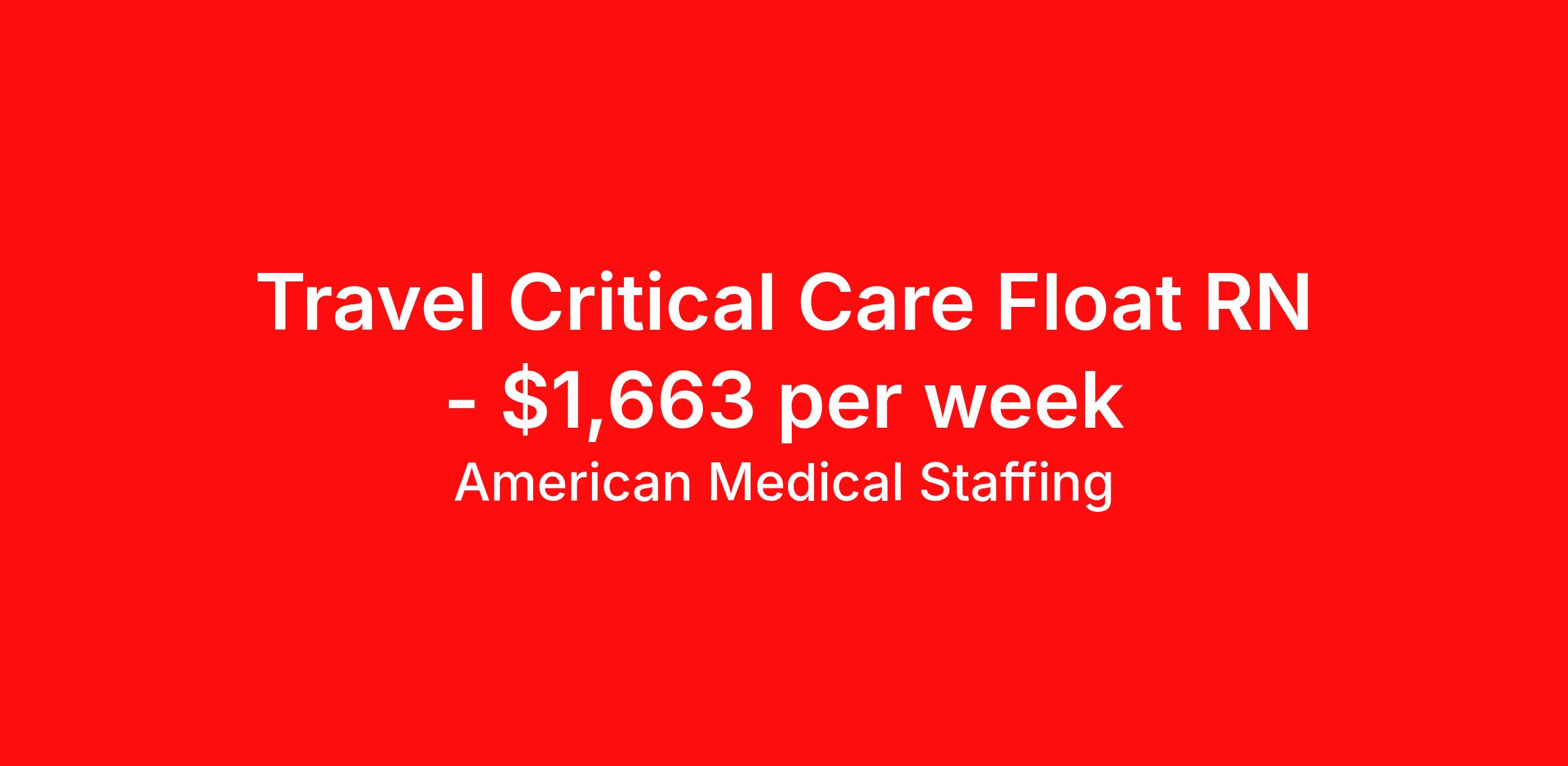 American Medical Staffing is seeking a travel nurse RN Float ICU - Intensive Care Unit Med Surg for a travel nursing job in Cartersville, Georgia. Job Description & Requirements Specialty: ICU - Intensive Care Unit Discipline: RN Start Date: 03/30/2026 Duration: 8 weeks 36 hours per week Shift: 12 hours, nights Employment Type: Travel We’re living in the new normal. Lives and careers look different today. So why shouldn’t you have a role that delivers excitement, fewer restrictions, and brings you closer to loved ones? At American Medical Staffing (AMS), we believe in supporting the pioneers who embody the sense of adventure each new placement brings and we’re looking for a RN: ICU for our Hospital contract assignment. Job Title : RN: ICU Location : Cartersville, Georgia Pay Range : Competitive, Negotiable, with Weekly Pay Schedule : 12-Hour Nights, 19:00:00-07:00:00, 12.00-3 Contract Length : 13 Weeks Requirements : · 2 years of experience as a RN · Qualified applicants MUST have at least 2 years of experience in the ICU · Valid RN license · Be willing to obtain Georgia licensure Why Choose American Medical Staffing? · Day-One Benefits : Medical, dental, and vision plans with no waiting period. · Wellness PTO : Build 1 or 2 weeks of paid time off into your contract. · Hotel Discounts : Save up to 60% on hotel bookings with access to 700,000 discounted properties. · Loyalty Program : Earn financial incentives automatically based on hours worked and assignment type. · Referral Program : $500 for you and $500 for each referral after 450 hours—no limits. · Working Advantage : Access exclusive discounts on retail, entertainment, and travel. · Scrub Discount : 20% off all scrubs through our customized AMS store. · Retirement Plans : 401(k) options to help you plan for the future. · Compliance & Credentialing Support : Let us handle the logistics so you can focus on patient care. Responsibilities · Deliver specialized care to patients across a variety of acute and subacute units. · Work closely with a multidisciplinary team of healthcare professionals to provide comprehensive and compassionate care. · Monitor patient conditions, administer treatments and document outcomes. · Advocate for the best possible patient experience while supporting recovery, safety, and continuity of care. Apply now to take the next step in your journey. American Medical Staffing is an Equal Employment Opportunity Employer and does not discriminate on the basis of race, color, religion, sex, national origin, sexual orientation, gender identity, disability, age, or any other non-merit factor. American Medical Staffing Job ID 106731. Pay package is based on 12 hour shifts and 36.0 hours per week (subject to confirmation) with tax-free stipend amount to be determined. Posted job title: RN:ICU,19:00:00-07:00:00 About American Medical Staffing American Medical Staffing is a staffing agency headquartered in Baltimore, MD. Our goal is to CREATE an extraordinary experience for our health care professionals. Our roots are nurse owned and operated so we know what clinicians want - lots of options, a smooth and informed placement process, competitive and accurate pay, great customer service and responsiveness to requests, and advocacy when there is an issue. When AMS was founded in 2001, we started our company with a mission to be a better agency than our competitors. We have always put a heavy emphasis into what is best for our employees, not necessarily just our clients or our company. You are not an expense as you may be to a hospital; you are an asset. We take employee advocacy seriously; you are not just a number to us. The end result is that you don`t work for us; we work for you. Since starting in Baltimore, MD, we continue to grow throughout the country. Check out our industry leading reviews on Google and Indeed to see how much our clinicians enjoy working with us! · Benefits: AMS offers an array of benefits for any employee working 30 hours or more! Those eligible employees who choose to participate will pay the premiums with deductions from their pre-tax earnings. We offer a complete benefits package including Health Insurance, 401K with up to 2% match, Life, Vision, and Dental. From health and wellness support, financial or legal needs, or help with life's everyday challenges, our Employee Assistance Program provides you with resources, services and discounts to help you manage your unique concerns and save time, energy and money. We also offer additional Employee Perks that you can enjoy as an AMS employee: Scrubin – Uniform Discounts Working Advantage – unlimited access to thousands of exclusive discounts and special offers nationwide for theme parks, shows, tours, attractions, sports, concerts, hotels, rental cars, retail gift cards, movie tickets and much more Hotel Engine - Save up to 60% when booking hotel rooms, with access to more than 700,000 deeply discounted hotels worldwide. Discounted Pet Insurance Wellness Program, including fitness, nutrition and financial wellness Betterhelp - 1 month of free therapy, followed by a discounted rate for our Healthcare Professionals and their family members. Win Win Referral Bonus - $500 for you, and $500 for them! Benefits 401k retirement plan Life insurance Medical benefits Dental benefits Vision benefits