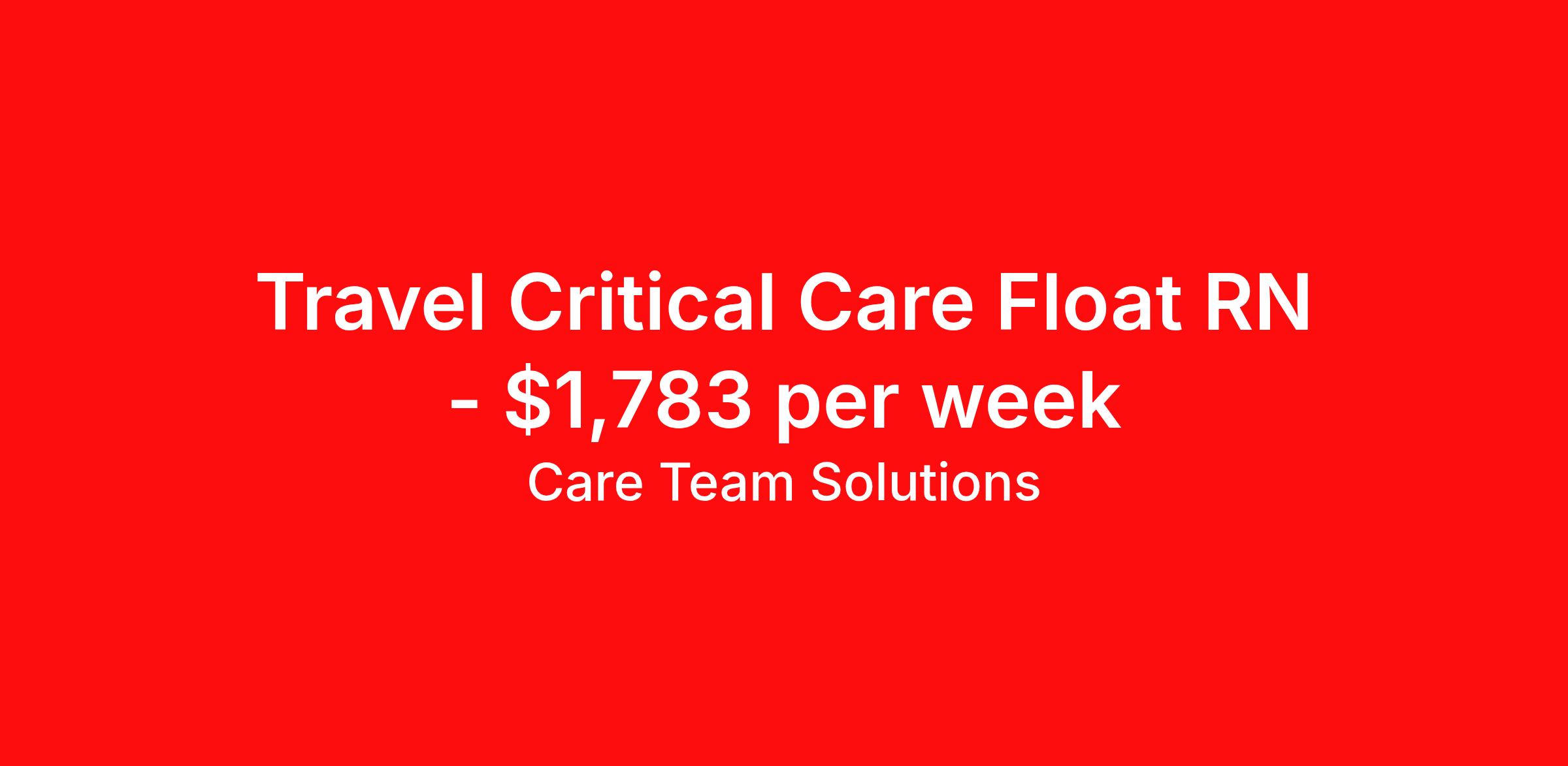 Care Team Solutions is seeking a travel nurse RN Float ICU - Intensive Care Unit Med Surg for a travel nursing job in Cartersville, Georgia. Job Description & Requirements Specialty: ICU - Intensive Care Unit Discipline: RN Start Date: ASAP Duration: 13 weeks 36 hours per week Shift: 12 hours Employment Type: Travel Registered Nurse must have 2 years of recent experience in particular specialty Details: Must Have 2 Years of recent Critical Care Unit experience. Specialty: Critical Care Unit Discipline: Registered Nurse Start Date: 2026-03-02 Duration: 8 Weeks Shift: 12 Hours Overnight shift. Hours Per Week: 36 Hours Employment Type: Contract Gross Weekly Pay: $1783.02 Six things that won’t happen if you apply to this job: You won’t have to guess what the downsides are. We’ll tell you up front. You won’t show up on day 1 and find out this is not what you signed up for. We won't leave your phone call ringing when it's inconvenient. Business hours for you are business hours for us. You won’t get shuffled to some customer service rep when a problem pops up. If we screw up something in securing your placement, we'll own it. That means it's on us to make it right. You won’t figure out your credentials alone. Our credentialing experts will walk you through it step by step. We've talked to thousands of travel nurses like you. We know you want good pay. You want to choose when you work. But the one thing nurse after nurse has said they want and don't have is someone in their corner. There's a lot in this business that’s messed up. We’re trying to be the people that fix it. You and every nurse with the guts to travel deserve it. We've worked hard for you to enjoy some one-of-a-kind benefits you'll not likely find anywhere else, because they benefit you more than they benefit us: Our early pay program Student loan reimbursement Free well-being tele-visits with a psychologist Care Team Solutions Job ID 582590. Pay package is based on 12 hour shifts and 36 hours per week (subject to confirmation) with tax-free stipend amount to be determined. Posted job title: Critical Care Float Registered Nurse About Care Team Solutions Two brothers who give an enormous damn. We're Justin and Kyle. Neither of us are nurses. It doesn’t take a nurse to see that the way travel nurses are treated sucks. Nursing is already hard enough. Travel nursing takes serious guts. You get the toughest assignments in places you’ve never been. Which can be fun, but it’s also stressful. You’re in your element but outside of your hometown. You can be a stranger on the team. If anyone deserves someone in their corner, it’s you. But that’s not how most agencies operate. Which is why travel nurses hate working with them. We got into this business because we saw bucket-loads of nurses moving through the "churn and burn" travel machinery. We absolutely hate that. You'll do your best work when you have the placements you want and feel fully supported in your work. We pay our people well because we want them to treat you well. Our recruiters are amazing (we picked each of them ourselves), but if you've got a problem too big for them, they can come straight to us. We work like ten feet away. The "Churners and Burners" promise you the same benefits. They might as well copy/paste them from each other. We have them too: 401k, holiday pay, healthcare, dental, travel reimbursement, etc But we've worked hard for you to enjoy some one-of-a-kind benefits you'll not likely find anywhere else, because they benefit you more than they benefit us: Our early pay program Student loan reimbursement Free well-being tele-visits with a psychologist Benefits Weekly pay Holiday Pay Guaranteed Hours 401k retirement plan Wellness and fitness programs Referral bonus Medical benefits Dental benefits Vision benefits School loan reimbursement