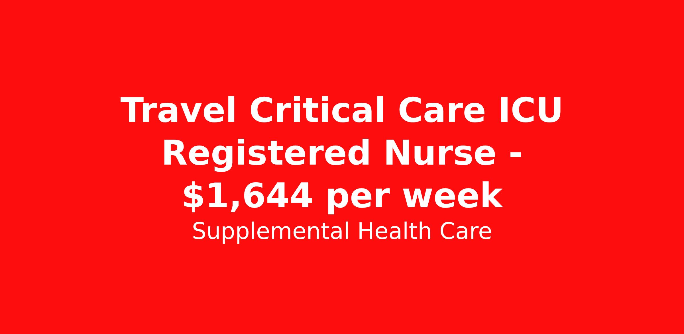 Supplemental Health Care is seeking a travel nurse RN ICU - Intensive Care Unit for a travel nursing job in Canton, Ohio. Job Description & Requirements Specialty: ICU - Intensive Care Unit Discipline: RN Start Date: ASAP Duration: 13 weeks 36 hours per week Shift: 12 hours, days Employment Type: Travel Job Description: Supplemental Health Care is connecting Critical Care - Icu Registered Nurses with top-tier hospital contracts in Canton, Ohio. Travel or stay local, either way, we’ll guide you to an opportunity that matches your goals, offering excellent pay, benefits, and support. Qualifications: Current Ohio Registered Nurse License / Certification American Heart Association BLS 1 to 2 years of recent Critical Care - Icu experience Critical Care - Icu Registered Nurse Contract Details: $1,512 - $1,644 per week* Weekly pay 13-week full-time contract with possibility to extend AM shifts available 36 hours per week *Estimated weekly payment may include both taxable wages and tax-free reimbursements for meals, housing, and incidentals. Please speak with a recruiter for details. What We Offer: Full medical, dental, vision, life, and even pet insurance! Round the clock support. No matter where you are or what time it is, Supplemental Health Care is standing by. SHC's Share the Care referral program is the most dynamic, profitable referral program in the industry. 401(k) Retirement Savings Program with a wide range of investment options. Discounted and free online access to CEU courses through Supplemental University. Apply now to launch your next Critical Care - Icu Registered Nurse assignment, or ask our team about other exciting Registered Nurse opportunities. Supplemental Health Care is an Equal Opportunity Employer. All candidates, including veterans and those with disabilities, are encouraged to apply. SHC will consider for employment qualified applicants with criminal histories in a manner consistent with the requirements of applicable local, state, or federal law. To learn more, visit www.shccares.com/eeo Supplemental Health Care Job ID 1487326. Pay package is based on 12 hour shifts and 36 hours per week (subject to confirmation) with tax-free stipend amount to be determined. Posted job title: Critical Care - Icu Registered Nurse About Supplemental Health Care At Supplemental Health Care, a simple belief in the power of caring guides a unique commitment to world-class service in healthcare staffing. For 40 years, we’ve supported talented professionals pursuing their life calling in hospitals, schools, home health, corrections, behavioral health, and other settings. At SHC, we inspire vital connections and enrich lives and inspire better outcomes. As recipients of the Best in Staffing Awards for both Client and Talent, Supplemental Health Care is proud to be among only 2% of staffing companies singled out for the distinction based on the real feedback of our employees and the clients we serve. SHC has also earned The Joint Commission’s Gold Seal of Approval and is named among the Largest Health Care Staffing companies in the United States by Staffing Industry Analysts. We are also thrilled to recognize our very own SLP, Dr. Kelly Byrd as the American Staffing Association 2024 National Staffing Employee of the Year and Health Care Sector All-Star. We’re honored to connect Dr. Byrd to employment, share her incredible story, and support her family literacy nonprofit. For everyone that we serve, SHC is the place where caring hearts thrive. Benefits Referral bonus Benefits start day 1 401k retirement plan Continuing Education Discount program Health savings account