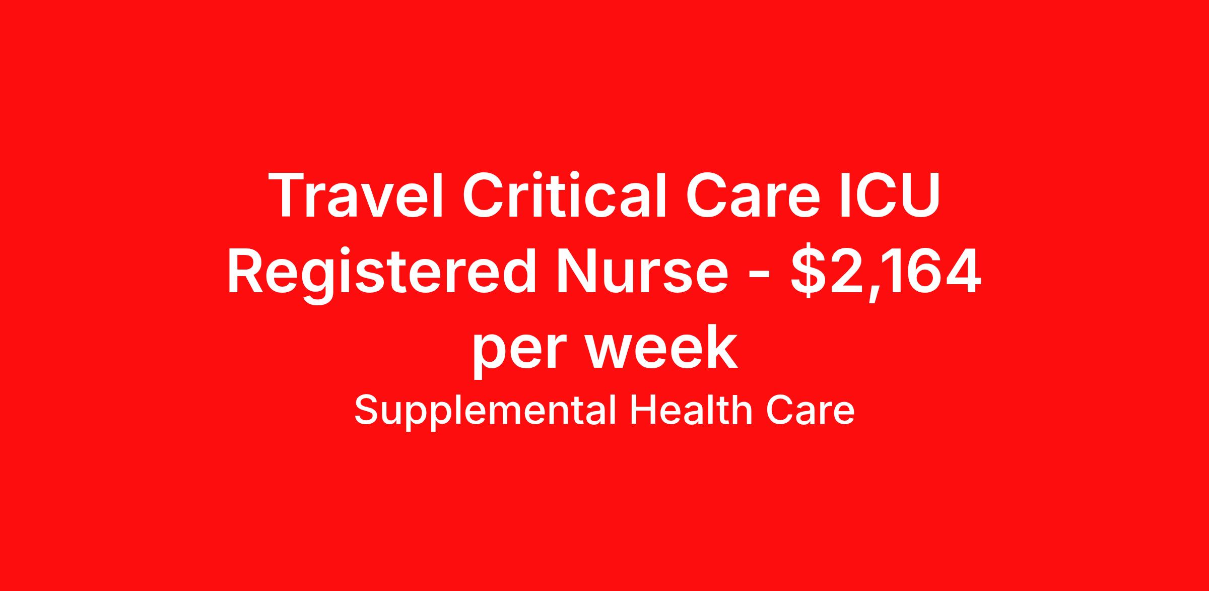 Supplemental Health Care is seeking a travel nurse RN ICU - Intensive Care Unit for a travel nursing job in West Burlington, Iowa. Job Description & Requirements Specialty: ICU - Intensive Care Unit Discipline: RN Start Date: ASAP Duration: 13 weeks 36 hours per week Shift: 12 hours, nights Employment Type: Travel Job Description: Supplemental Health Care is connecting Critical Care - Icu Registered Nurses with top-tier hospital contracts in West Burlington, Iowa. Travel or stay local, either way, we’ll guide you to an opportunity that matches your goals, offering excellent pay, benefits, and support. Qualifications: Current Iowa Registered Nurse License / Certification American Heart Association BLS 1 to 2 years of recent Critical Care - Icu experience Critical Care - Icu Registered Nurse Contract Details: $1,998 - $2,164 per week* Weekly pay 13-week full-time contract with possibility to extend NOC shifts available *Estimated weekly payment may include both taxable wages and tax-free reimbursements for meals, housing, and incidentals. Please speak with a recruiter for details. What We Offer: Full medical, dental, vision, life, and even pet insurance! Round the clock support. No matter where you are or what time it is, Supplemental Health Care is standing by. SHC's Share the Care referral program is the most dynamic, profitable referral program in the industry. 401(k) Retirement Savings Program with a wide range of investment options. Discounted and free online access to CEU courses through Supplemental University. Apply now to launch your next Critical Care - Icu Registered Nurse assignment, or ask our team about other exciting Registered Nurse opportunities. Supplemental Health Care is an Equal Opportunity Employer. All candidates, including veterans and those with disabilities, are encouraged to apply. SHC will consider for employment qualified applicants with criminal histories in a manner consistent with the requirements of applicable local, state, or federal law. To learn more, visit www.shccares.com/eeo Supplemental Health Care Job ID 1471217. Pay package is based on 12 hour shifts and 36 hours per week (subject to confirmation) with tax-free stipend amount to be determined. Posted job title: Critical Care - Icu Registered Nurse About Supplemental Health Care At Supplemental Health Care, a simple belief in the power of caring guides a unique commitment to world-class service in healthcare staffing. For 40 years, we’ve supported talented professionals pursuing their life calling in hospitals, schools, home health, corrections, behavioral health, and other settings. At SHC, we inspire vital connections and enrich lives and inspire better outcomes. As recipients of the Best in Staffing Awards for both Client and Talent, Supplemental Health Care is proud to be among only 2% of staffing companies singled out for the distinction based on the real feedback of our employees and the clients we serve. SHC has also earned The Joint Commission’s Gold Seal of Approval and is named among the Largest Health Care Staffing companies in the United States by Staffing Industry Analysts. We are also thrilled to recognize our very own SLP, Dr. Kelly Byrd as the American Staffing Association 2024 National Staffing Employee of the Year and Health Care Sector All-Star. We’re honored to connect Dr. Byrd to employment, share her incredible story, and support her family literacy nonprofit. For everyone that we serve, SHC is the place where caring hearts thrive. Benefits Referral bonus Benefits start day 1 401k retirement plan Continuing Education Discount program Health savings account
