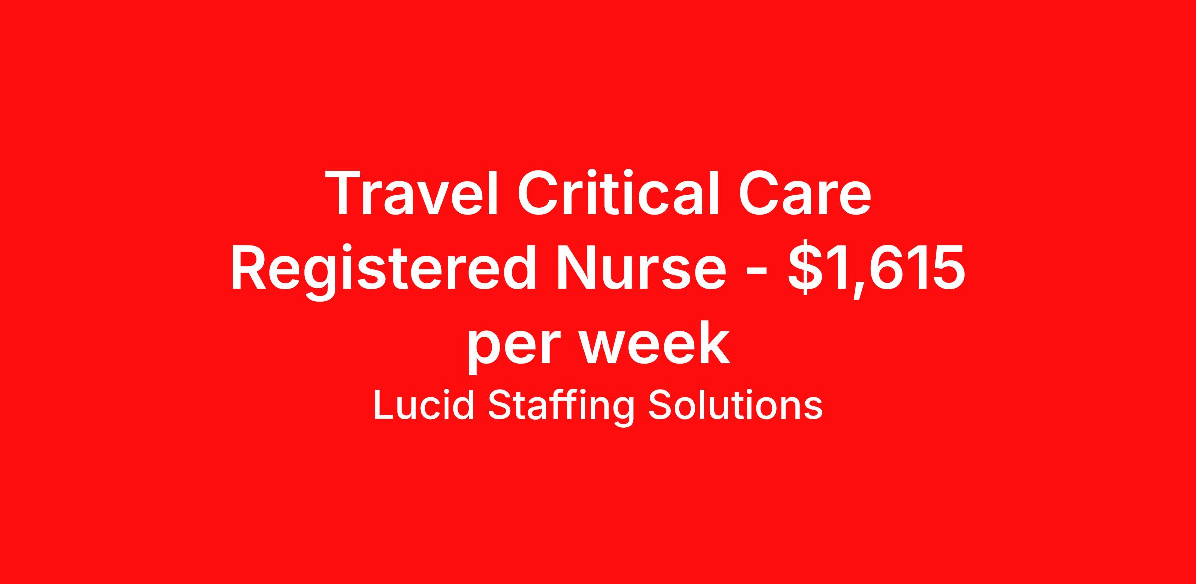 Lucid Staffing Solutions is seeking a travel nurse RN ICU - Intensive Care Unit for a travel nursing job in Cleveland, Ohio. Job Description & Requirements Specialty: ICU - Intensive Care Unit Discipline: RN Duration: 13 weeks 36 hours per week Shift: 12 hours, nights Employment Type: Travel Job Description Position: Travel Registered Nurse (RN) with experience in ICU Location: Cleveland, Ohio Shift: hr Night Weekly Gross: $1615.01 Lucid Staffing Solutions was created by former healthcare workers who lived the short staffing, the chaotic workflows, and the nonstop pressure that comes with patient care. We built an agency powered by real clinical experience, kept simple and supportive, so you never have to guess whether the people guiding you actually know what they’re talking about. Minimum Requirements: Active license as a Registered Nurse (RN) Licensed in Ohio (If applicable) or compact eligible Two years of recent ICU experience Active BLS Why Lucid Works for Travelers Paid Weekly: Stipends pushed to GSA limits whenever possible $500 Travel Reimbursement: Paid at the start of each assignment Clinician-Led Team: Recruiters and Account Managers with real clinical experience In-House Compliance: fast updates, real communication, and none of the delays that come with outsourced vendors. Health Coverage Options: Multiple medical plans plus dental, vision, and workers compensation 401(k) Match: 4 percent match after 6 months License & Certification Reimbursement: We help cover the cost of staying compliant Liability Insurance: Included automatically Referral Bonuses: $500 per referral, $750 after five referrals Ready to start your journey? Apply today to connect with a Clinician-Recruiter! Lucid Staffing Solutions Job ID 35239. Pay package is based on 12 hour shifts and 36 hours per week (subject to confirmation) with tax-free stipend amount to be determined. Posted job title: ICU About Lucid Staffing Solutions Clinician Owned & Operated At Lucid Staffing Solutions, we do things differently—because we’ve been in your shoes. Founded by actual healthcare professionals, Lucid was built to fix the issues we experienced as travelers. We know what makes a great assignment: competitive pay, seamless onboarding, honest recruiters, and most importantly—working with a team that truly sees and supports you. Our entire team is made up of former clinicians who understand the demands of the job and what travelers truly need to succeed. We offer some of the highest paying allied health and nursing contracts across the country, along with some amazing benefits & perks. Whether you're chasing freedom, flexible schedules, bigger paychecks, or your next adventure, Lucid helps you get there—with real support, real respect , and real healthcare experts. Benefits Dental benefits Medical benefits Vision benefits