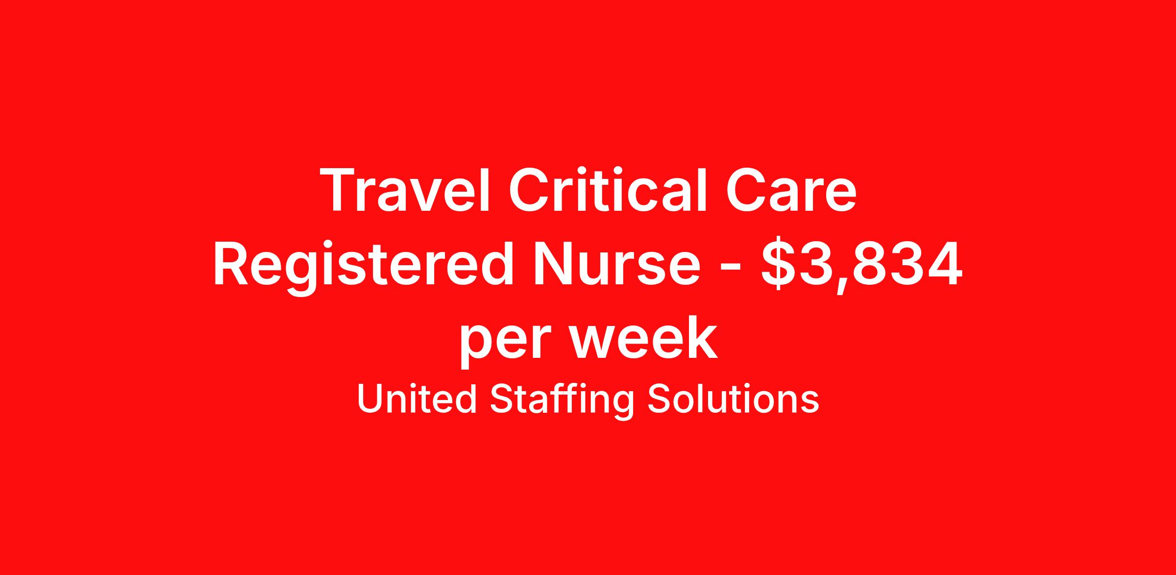 United Staffing Solutions is seeking a travel nurse RN ICU - Intensive Care Unit for a travel nursing job in Pittsfield, Massachusetts. Job Description & Requirements Specialty: ICU - Intensive Care Unit Discipline: RN Start Date: 04/13/2026 Duration: 13 weeks 48 hours per week Shift: 12 hours, nights Employment Type: Travel Unit: Critical Care Care Setting: ICU Provide care for high-acuity critical care patients requiring ventilator management, ICP monitoring, and hemodynamic monitoring. Candidates must have 2 years of current critical care experience and be willing to float as needed. Meditech Expanse experience is strongly preferred; TNCC and BSN are preferred. Required certifications: BLS, ACLS, and NIHSS with active Massachusetts RN license in hand. Block scheduling is not available, and travelers must have their own vehicle. United Staffing Solutions Job ID 65572. Pay package is based on 12 hour shifts and 48 hours per week (subject to confirmation) with tax-free stipend amount to be determined. About United Staffing Solutions United Staffing Solutions, Inc. (USS) is one of the largest privately-owned business in America, with 4 divisions and staffing in over 4,000 job categories. USS offers a complete portfolio of personnel solutions to small, mid-sized and large organizations through the tri-state region. Specializes in staffing and recruitment for various industries, including Travel Healthcare, Education, Light Industrial, IT, Security and Administrative Roles. Comprehensive services for workforce solutions, including temporary, permanent and contract staffing Expertise in diverse talent sourcing and matching skilled candidates with appropriate roles. Strong knowledge of industry regulations and compliance standards. Benefits Medical benefits Referral bonus Weekly pay