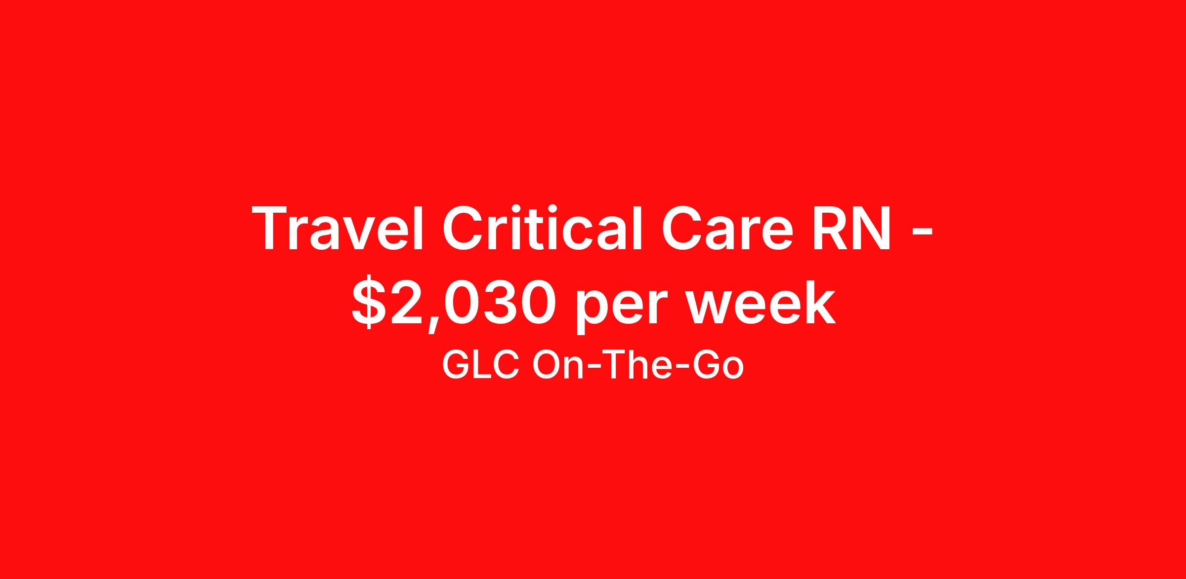 GLC On-The-Go is seeking a travel nurse RN ICU - Intensive Care Unit for a travel nursing job in Alexandria, Louisiana. Job Description & Requirements Specialty: ICU - Intensive Care Unit Discipline: RN Start Date: 03/30/2026 Duration: 13 weeks 36 hours per week Shift: 12 hours Employment Type: Travel GLC is hiring: RN CCU/ICU - Alexandria, LA - 13-week contract GLC – Named Best Nurse Agency 2024–2025 We connect nurses, nursing professionals, and allied health professionals like you to contracts that align with your skills, schedule, and career goals. About this Assignment Join the care team in CCU/ICU where you’ll provide patient-centered care in a collaborative environment. Typical responsibilities include direct patient care, timely documentation, and coordination with the care team. Specific duties will be confirmed during your interview with a recruiter. Assignment Details Location: Alexandria, LA Assignment Length: 13 weeks Start Date: 03/30/2026 End Date: 06/28/2026 Pay Range: $1,827 - $2,030 Minimum Requirements Active license in CCU/ICU 1 year full-time RN, CCU/ICU experience within the last 2 years What you can expect from GLC Weekly on-time pay with direct deposit Transparent communication, clear assignment details, and recruiter support from start to finish - or extension Referral bonus up to $500 Health, dental, and vision insurance 401(k) plan Completion and signing bonuses may also be available Ready to move forward? Apply now and start your rewarding journey with GLC - a recruiter will connect quickly to review pay , start date , and assignment details so you can make the best decision for your next contract. GLC On-The-Go Job ID 504459. Pay package is based on 12 hour shifts and 36 hours per week (subject to confirmation) with tax-free stipend amount to be determined. Posted job title: 41101 - Travel: RN - Critical Care - DAYS About GLC On-The-Go GLC is more than just a staffing agency – we’re your trusted partner in finding travel, local, and PRN contracts that align with your career aspirations and lifestyle. We specialize in connecting travel nurses and allied healthcare professionals like you with opportunities in acute care, long-term care, behavioral health, and allied fields across the U.S. Our attentive and friendly recruiters are always just a call or text away, ready to guide you at every step, ensuring you feel valued and heard. We understand the unique needs of travel healthcare professionals, which is why we offer comprehensive benefits and 24/7 support. Join GLC, where our 20 years of experience mean we know how to help you find the assignments that turn your career goals into reality. With us, it's not just a placement – it's your dream career made possible