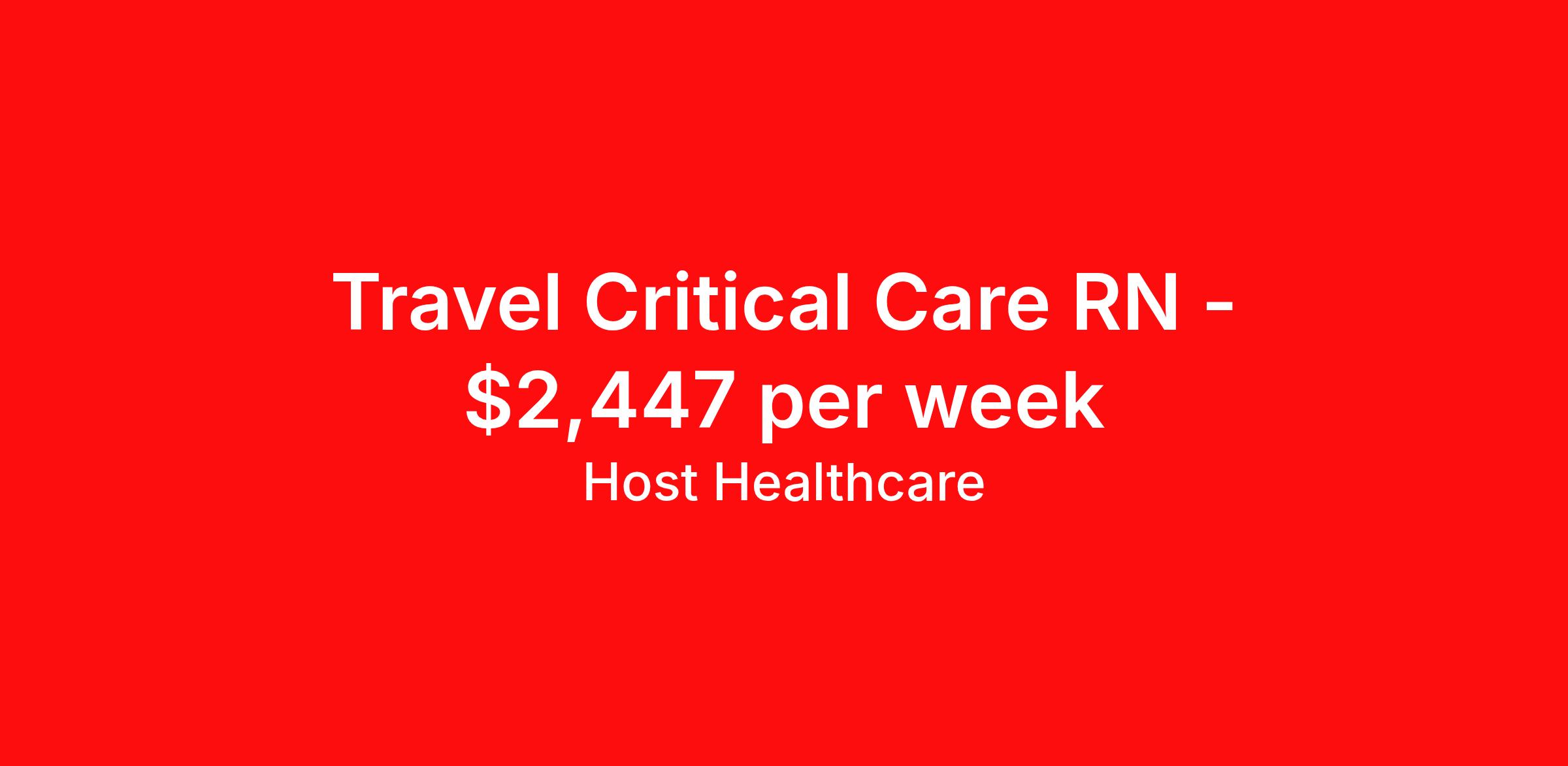 Host Healthcare is seeking a travel nurse RN ICU - Intensive Care Unit for a travel nursing job in Fairfield, California. Job Description & Requirements Specialty: ICU - Intensive Care Unit Discipline: RN Start Date: 04/06/2026 Duration: 13 weeks 36 hours per week Shift: 12 hours, days Employment Type: Travel Host Healthcare Job ID a1fVX000002xECHYA2. Pay package is based on 12 hour shifts and 36 hours per week (subject to confirmation) with tax-free stipend amount to be determined. Posted job title: RN - ICU About Host Healthcare At Host Healthcare, we provide a truly comfortable experience as you explore your travel nursing, therapy, or allied career. We make your travel healthcare journey easy by taking care of all the details, so you don’t have to. We are on a mission to help others live better and we do this by helping the healers of the world be as comfortable as possible. With access to tens of thousands of travel nursing, therapy, and allied jobs in all 50 states, our responsive and friendly recruiters find your dream position based on what’s important to you. During your assignment, get access to premium benefits, including Day 1 medical that continues up to 30 days between assignments, 401K matching, travel reimbursements, dedicated housing support, and more. We also offer 24/7 support from our team and access to our on-staff clinicians so you can feel comfortable and confident throughout your entire assignment. Travel comfortably with Host Healthcare. Benefits Referral bonus School loan reimbursement Vision benefits Wellness and fitness programs Company provided housing options License and certification reimbursement Life insurance Medical benefits Mileage reimbursement Pet insurance Discount program Employee assistance programs Guaranteed Hours Health savings account Holiday Pay 401k retirement plan Continuing Education Dental benefits