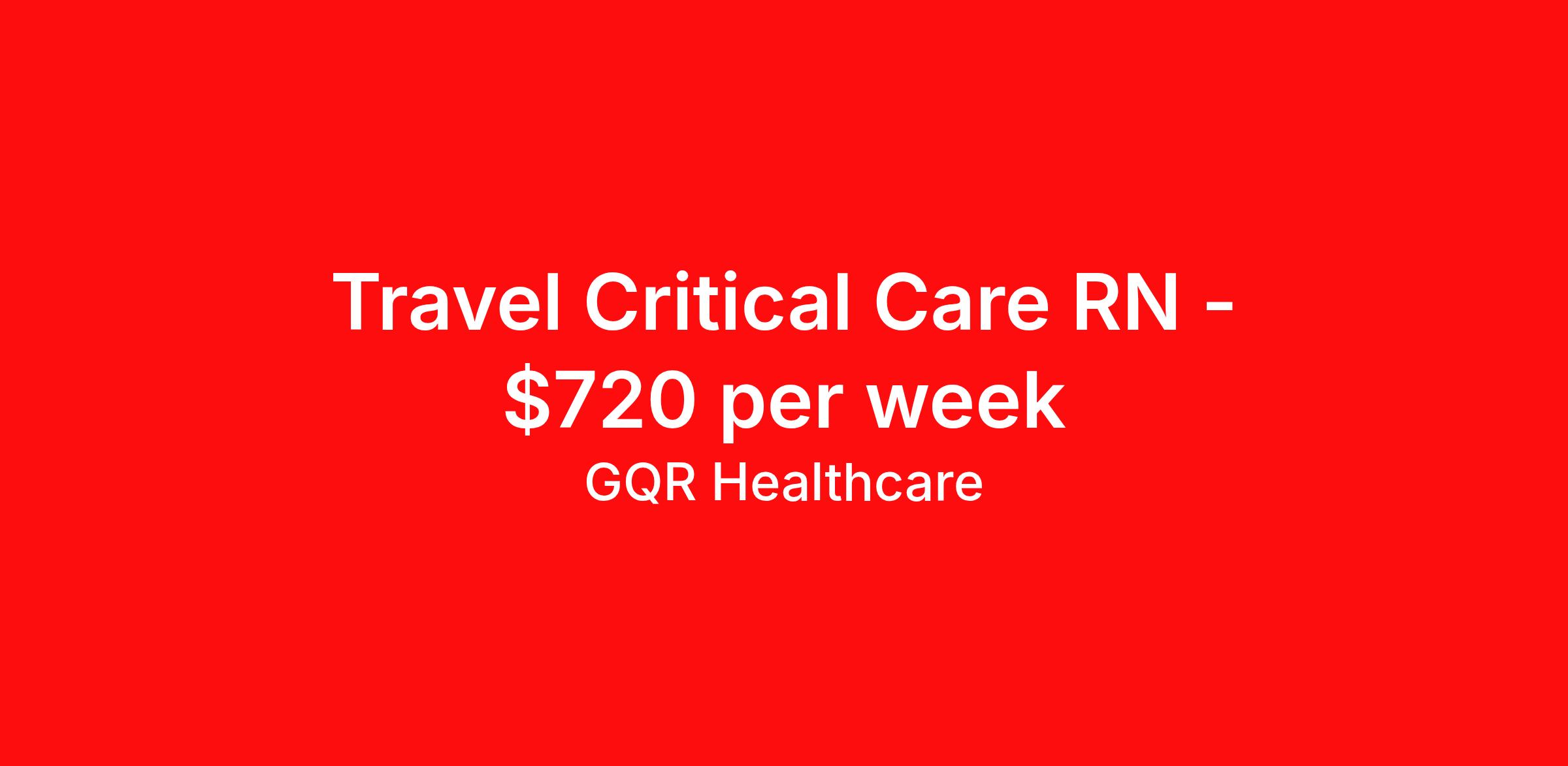 GQR Healthcare is seeking a travel nurse RN ICU - Intensive Care Unit for a travel nursing job in Marietta, Georgia. Job Description & Requirements Specialty: ICU - Intensive Care Unit Discipline: RN Start Date: ASAP Duration: 2 weeks 36 hours per week Shift: 12 hours, nights Employment Type: Travel Contract - W2 CCU | ICU Registered Nurse (RN) Job Location: Marietta, Georgia Start Date: February 24, 2026 Profession: Registered Nurse (RN) Facility: Short Term Acute Care Estimated Pay: $720 - $815 Duration:2 weeks Specialty:CCU | ICU Shift: Night Shift Details: null Night Job Type: Travel *Estimated weekly pay includes projected hourly wages and weekly meal and lodging per diems for eligible clinicians based on nationally published GSA rates. Actual weekly pay and per diems may differ from the amount shown and are subject to change during an assignment. Benefits: Day 1 Insurance Cigna medical, MetLife dental and vision insurance License reimbursement for new licenses needed for each assignment Discounts with hotels and rental cars A dedicated recruiter and support team that will help you every step of the way to sure you start on time and have an exceptional experience Referral bonus up to $700 About the Company: Finding the right role is about more than just matching skills to a job—it’s about aligning with your goals, values, and the way you want to work. As an award-winning talent partner, we support healthcare professionals through every step of that process, offering meaningful opportunities, clear guidance, and long-term partnership. From our first conversation to your first day on the job (and beyond!), we’re here to help you move forward with confidence. GQR Job ID 769435. Pay package is based on 12 hour shifts and 36 hours per week (subject to confirmation) with tax-free stipend amount to be determined. Posted job title: Registered Nurse (RN) About GQR Healthcare GQR’s Healthcare team specializes in connecting experts within the industry to highly skilled healthcare professionals across the US market. In the competitive healthcare market, we recognize that the industry’s common goals of improved quality of care and patient outcomes are wholly reliant upon the professionals directly supporting these initiatives. Leveraging our extensive candidate network, we deliver continuity of care for the communities our partners serve to ensure the patient experience is of the highest quality. Through deep market specialization and a unique approach to talent acquisition, GQR Healthcare provides an unparalleled and personalized experience across all medical specialties in nursing and within diverse healthcare platforms across the industry.