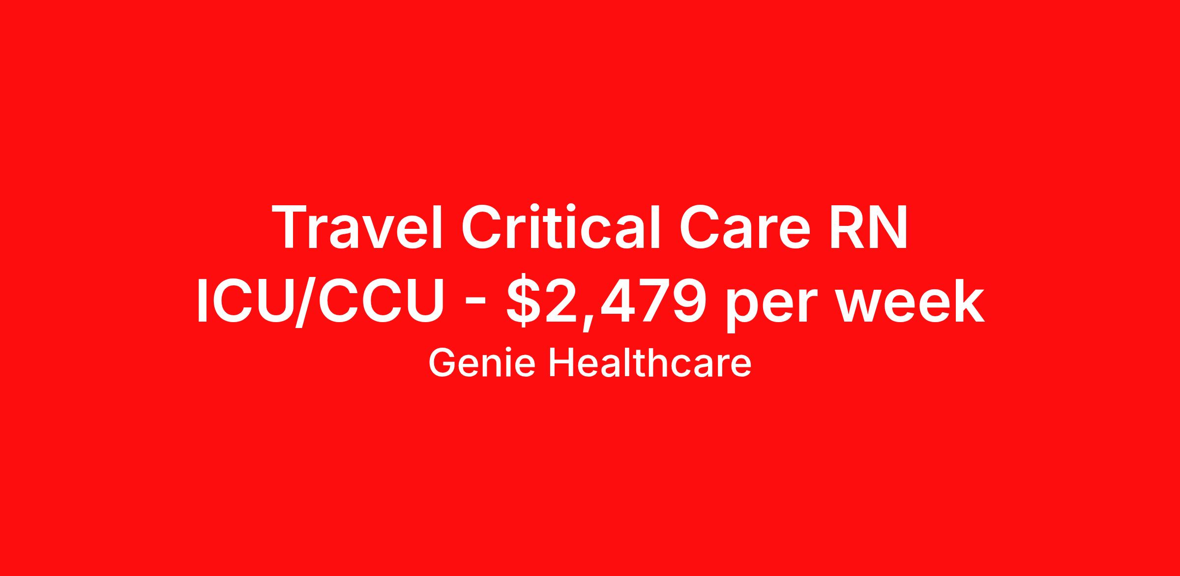 Genie Healthcare is seeking a travel nurse RN ICU - Intensive Care Unit for a travel nursing job in West Burlington, Iowa. Job Description & Requirements Specialty: ICU - Intensive Care Unit Discipline: RN Start Date: 03/23/2026 Duration: 13 weeks 36 hours per week Shift: 12 hours, nights Employment Type: Travel Genie Healthcare is looking for a RN to work in Intensive Care Unit (ICU) for a 12.86 weeks travel assignment located in West Burlington, IA for the Shift (3x12 nights, 19:00:00-07:00:00, 12.00-3). Pay and benefits packages are estimated based on client bill rate at time the job was posted. These rates are subject to change. Exact pay and benefits vary based on several things, including, but not limited to, guaranteed hours, client changes in bill rate, experience, etc. Benefits: Medical Insurance, Dental Insurance, Vision Insurance, 401(k) with company matching (50% up to 6% of what you contribute) Genie Healthcare Job ID 17837743. Pay package is based on 12 hour shifts and 36.0 hours per week (subject to confirmation) with tax-free stipend amount to be determined. Posted job title: RN:Intensive Care Unit (ICU),19:00:00-07:00:00 About Genie Healthcare Genie Healthcare is one of the fastest growing Nurse Travel Agencies in the USA. Genie serves hundreds of facilities and has over 4000 current travel RN contracts open at any given time. Genie provides travel RN’s flexibility, support, top pay scale, housing and the 1 rated, multi-state health insurance coverage. Genie Healthcare carries with it a commitment to providing a comprehensive level of service and quality care. Growing from a small team of eager recruiters to a company with satisfied clients in nearly every corner of the nation, delivering excellence in patient and customer care is the key to Genie’s success. The management team has 20 years of experience in workforce solutions and staffing in medical and non-medical fields, roles ranging from Clerical job to Cardiologist to software developer to CEO.
