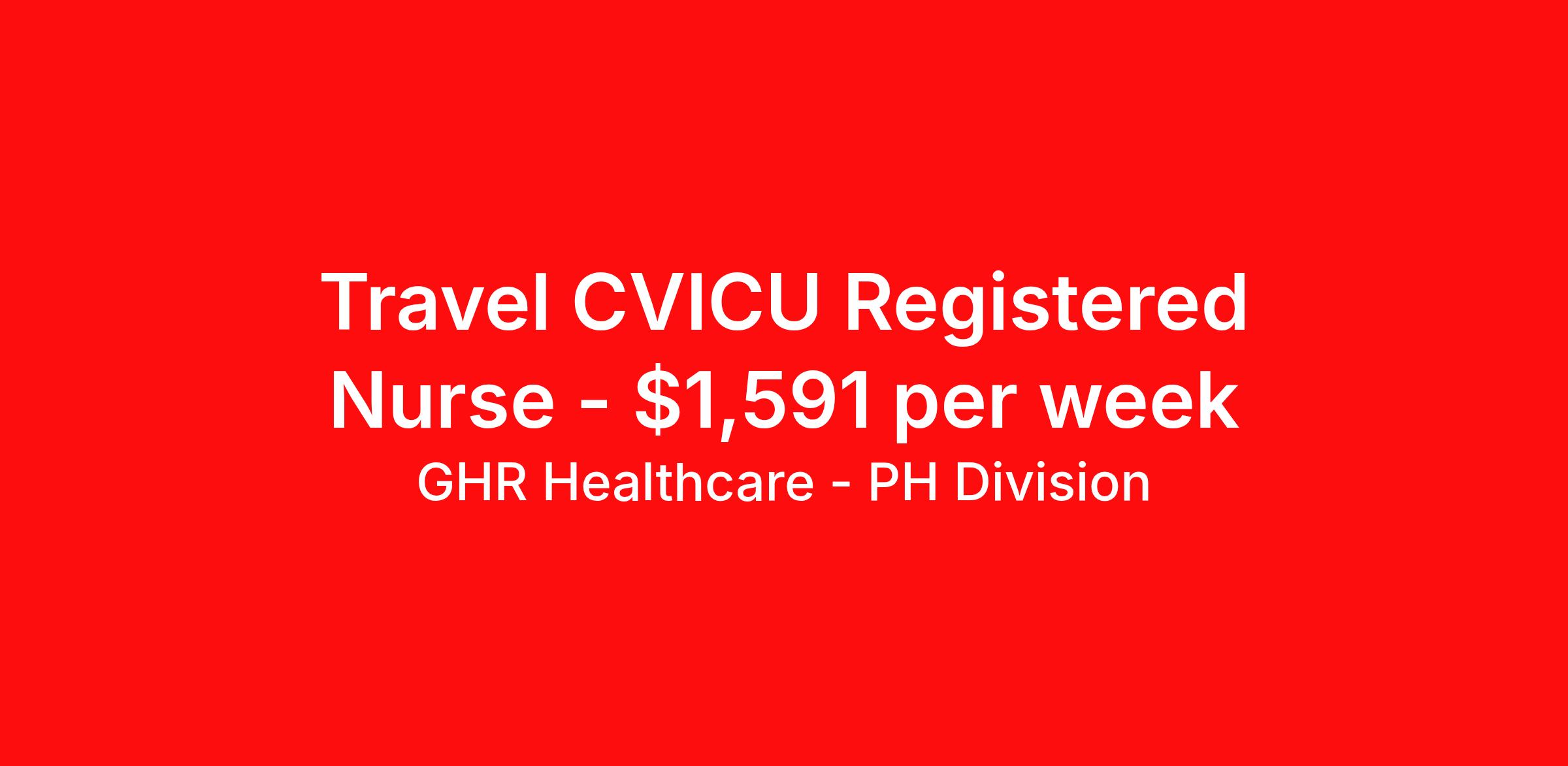 GHR Healthcare - PH Division is seeking a travel nurse RN CVICU for a travel nursing job in Fort Worth, Texas. Job Description & Requirements Specialty: CVICU Discipline: RN Start Date: ASAP Duration: 13 weeks 36 hours per week Shift: 12 hours Employment Type: Travel Planet Healthcare Job ID 73979914. Pay package is based on 12 hour shifts and 36 hours per week (subject to confirmation) with tax-free stipend amount to be determined. About GHR Healthcare - PH Division For over 30 years, GHR Healthcare has been the bridge between healthcare professionals and the facilities that need them nationwide. We're committed to uncovering your ideal fit, supported by GHR's dedication to competitive compensation, transparent communication, and a devoted team that genuinely cares about your career journey. You can trust us to stand by your side as your advocate, confidante, and partner in advancing your career. At GHR, care and consideration are at the heart of everything we do. Visit ghrhealthcare.com to learn more.
