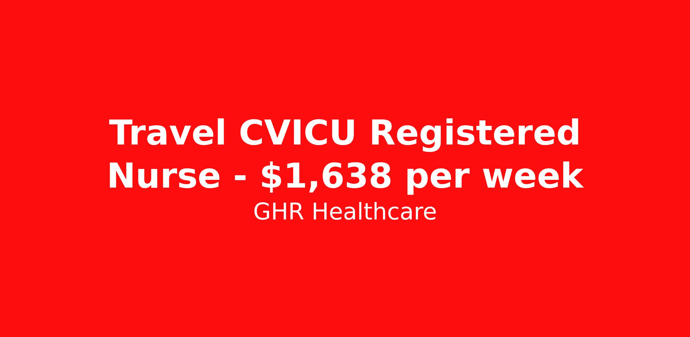 GHR Healthcare is seeking a travel nurse RN CVICU for a travel nursing job in Fort Worth, Texas. Job Description & Requirements Specialty: CVICU Discipline: RN Start Date: ASAP Duration: 13 weeks 36 hours per week Shift: 12 hours Employment Type: Travel CVICU Registered Nurse (RN) – Travel Nursing Job in Fort Worth, Texas Advance your nursing career with a rewarding CVICU Registered Nurse (RN) travel assignment in Fort Worth, TX (zip code 76104). Join a leading healthcare team in a state-of-the-art Cardiovascular Intensive Care Unit, providing critical care to adult patients. This travel nursing job offers competitive pay, professional growth, and the chance to experience the vibrant culture of Fort Worth, Texas. Key Job Details – CVICU RN Travel Assignment Location: Fort Worth, TX 76104 (Texas healthcare jobs) Facility Setting: Cardiovascular Intensive Care Unit (CVICU) Unit Size: 16 beds, 3rd floor (3 West), A Tower Employment Type: Travel Nursing – Registered Nurse Shift: 7:00 PM – 7:00 AM (12-hour night shifts) Hours per Week: 36 Assignment Duration: 13 weeks (Start: 12/1/2025 – End: 3/2/2026) Weekend Requirement: 2 weekend shifts biweekly Dress Code: Royal Blue Scrubs Estimated Weekly Salary: $1360 - $1460 Registered Nurse Qualifications Active RN license (Texas or compact state) Minimum 2 years of recent critical care nursing experience (CVICU, adult ICU, Neuro ICU, or Critical Care specialty) Proficient in ventilator management, arterial/central line, and chest tube management Ability to float to Medical ICU, Neuro Surgical ICU, and Cardiac PCU as needed Experience with Meditech EMR preferred BSN and CCRN certification preferred CVICU RN Responsibilities Deliver high-quality nursing care to critically ill cardiovascular patients in a CVICU setting Perform hemodynamic monitoring, manage Swan Ganz catheters, arterial lines, chest tubes, and ventilators Collaborate with a multidisciplinary healthcare team to ensure optimal patient outcomes Participate in CABG recovery, CRRT, and Impella device management (preferred skills) Maintain accurate documentation using Meditech EMR Adhere to unit policies and guidelines, and uphold a team-oriented approach Apply now to join our healthcare team as a CVICU Registered Nurse in Fort Worth, Texas! Take the next step in your nursing career and explore exciting travel nursing opportunities in Texas. Benefits 401K with Matching, Healthcare, Dental and Vision About GHR With over 30 years of healthcare staffing experience, GHR Healthcare is your trusted partner in finding the perfect contract or permanent role in the healthcare industry. Our specialized teams have placed thousands of healthcare professionals nationwide. You will have a dedicated recruiter, providing access to new opportunities and guidance every step of the way. Whatever your career goals, GHR Healthcare is here to support you and find your perfect fit. Get to know us:www.ghrhealthcare.com Equal Opportunity We are an equal opportunity employer and value diversity across our organization. We do not discriminate on the basis of race, religion, color, national origin, gender, sexual orientation, age, marital status, veteran status, or disability status. GHR Healthcare Job ID 431408. Pay package is based on 12 hour shifts and 36 hours per week (subject to confirmation) with tax-free stipend amount to be determined. Posted job title: CVICU About GHR Healthcare For over 30 years, GHR Healthcare has been the bridge between healthcare professionals and the facilities that need them nationwide. We're committed to uncovering your ideal fit, supported by GHR's dedication to competitive compensation, transparent communication, and a devoted team that genuinely cares about your career journey. You can trust us to stand by your side as your advocate, confidante, and partner in advancing your career. At GHR, care and consideration are at the heart of everything we do. Visit ghrhealthcare.com to learn more.