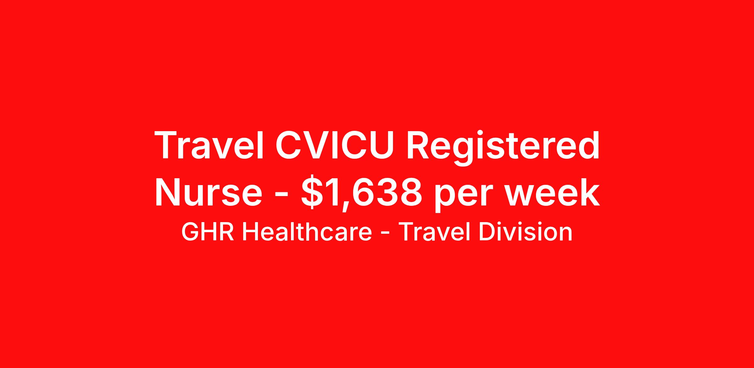 GHR Healthcare - Travel Division is seeking a travel nurse RN CVICU for a travel nursing job in Fort Worth, Texas. Job Description & Requirements Specialty: CVICU Discipline: RN Start Date: ASAP Duration: 13 weeks 36 hours per week Shift: 12 hours Employment Type: Travel GHR Healthcare - Travel Division Job ID 73979914. Pay package is based on 12 hour shifts and 36 hours per week (subject to confirmation) with tax-free stipend amount to be determined. About GHR Healthcare - Travel Division For over 30 years, GHR Healthcare has been the bridge between healthcare professionals and the facilities that need them nationwide. We're committed to uncovering your ideal fit, supported by GHR's dedication to competitive compensation, transparent communication, and a devoted team that genuinely cares about your career journey. You can trust us to stand by your side as your advocate, confidante, and partner in advancing your career. At GHR, care and consideration are at the heart of everything we do. Visit ghrhealthcare.com to learn more.