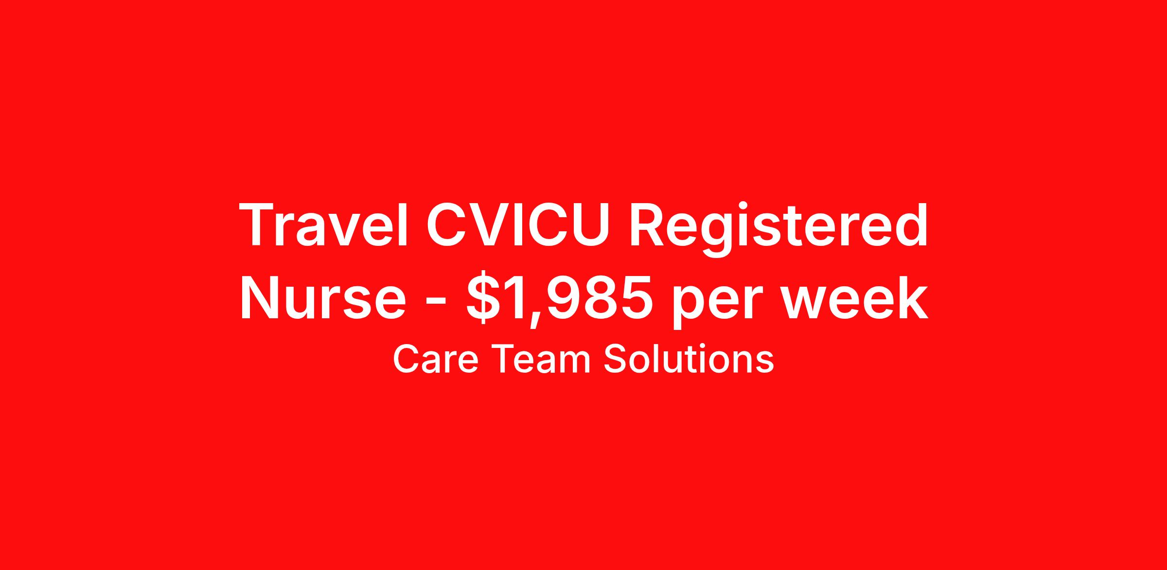 Care Team Solutions is seeking a travel nurse RN CVICU for a travel nursing job in Nashville, Tennessee. Job Description & Requirements Specialty: CVICU Discipline: RN Start Date: ASAP Duration: 13 weeks 36 hours per week Shift: 12 hours Employment Type: Travel Registered Nurse must have 2 years of recent experience in particular specialty Details: Must Have 2 Years of recent Cardiovascular Intensive Care Unit experience. Specialty: Cardiovascular Intensive Care Unit Discipline: Registered Nurse Start Date: 2026-03-03 Duration: 13 Weeks Shift: 12 Hours Overnight shift. Hours Per Week: 36 Hours Employment Type: Contract Gross Weekly Pay: $1984.72 Six things that won’t happen if you apply to this job: You won’t have to guess what the downsides are. We’ll tell you up front. You won’t show up on day 1 and find out this is not what you signed up for. We won't leave your phone call ringing when it's inconvenient. Business hours for you are business hours for us. You won’t get shuffled to some customer service rep when a problem pops up. If we screw up something in securing your placement, we'll own it. That means it's on us to make it right. You won’t figure out your credentials alone. Our credentialing experts will walk you through it step by step. We've talked to thousands of travel nurses like you. We know you want good pay. You want to choose when you work. But the one thing nurse after nurse has said they want and don't have is someone in their corner. There's a lot in this business that’s messed up. We’re trying to be the people that fix it. You and every nurse with the guts to travel deserve it. We've worked hard for you to enjoy some one-of-a-kind benefits you'll not likely find anywhere else, because they benefit you more than they benefit us: Our early pay program Student loan reimbursement Free well-being tele-visits with a psychologist Care Team Solutions Job ID 578805. Pay package is based on 12 hour shifts and 36 hours per week (subject to confirmation) with tax-free stipend amount to be determined. Posted job title: TRAVEL - RN - CVICU - COST CENTER (653) - 7:00PM - 7:00AM About Care Team Solutions Two brothers who give an enormous damn. We're Justin and Kyle. Neither of us are nurses. It doesn’t take a nurse to see that the way travel nurses are treated sucks. Nursing is already hard enough. Travel nursing takes serious guts. You get the toughest assignments in places you’ve never been. Which can be fun, but it’s also stressful. You’re in your element but outside of your hometown. You can be a stranger on the team. If anyone deserves someone in their corner, it’s you. But that’s not how most agencies operate. Which is why travel nurses hate working with them. We got into this business because we saw bucket-loads of nurses moving through the "churn and burn" travel machinery. We absolutely hate that. You'll do your best work when you have the placements you want and feel fully supported in your work. We pay our people well because we want them to treat you well. Our recruiters are amazing (we picked each of them ourselves), but if you've got a problem too big for them, they can come straight to us. We work like ten feet away. The "Churners and Burners" promise you the same benefits. They might as well copy/paste them from each other. We have them too: 401k, holiday pay, healthcare, dental, travel reimbursement, etc But we've worked hard for you to enjoy some one-of-a-kind benefits you'll not likely find anywhere else, because they benefit you more than they benefit us: Our early pay program Student loan reimbursement Free well-being tele-visits with a psychologist Benefits Weekly pay Holiday Pay Guaranteed Hours 401k retirement plan Wellness and fitness programs Referral bonus Medical benefits Dental benefits Vision benefits School loan reimbursement