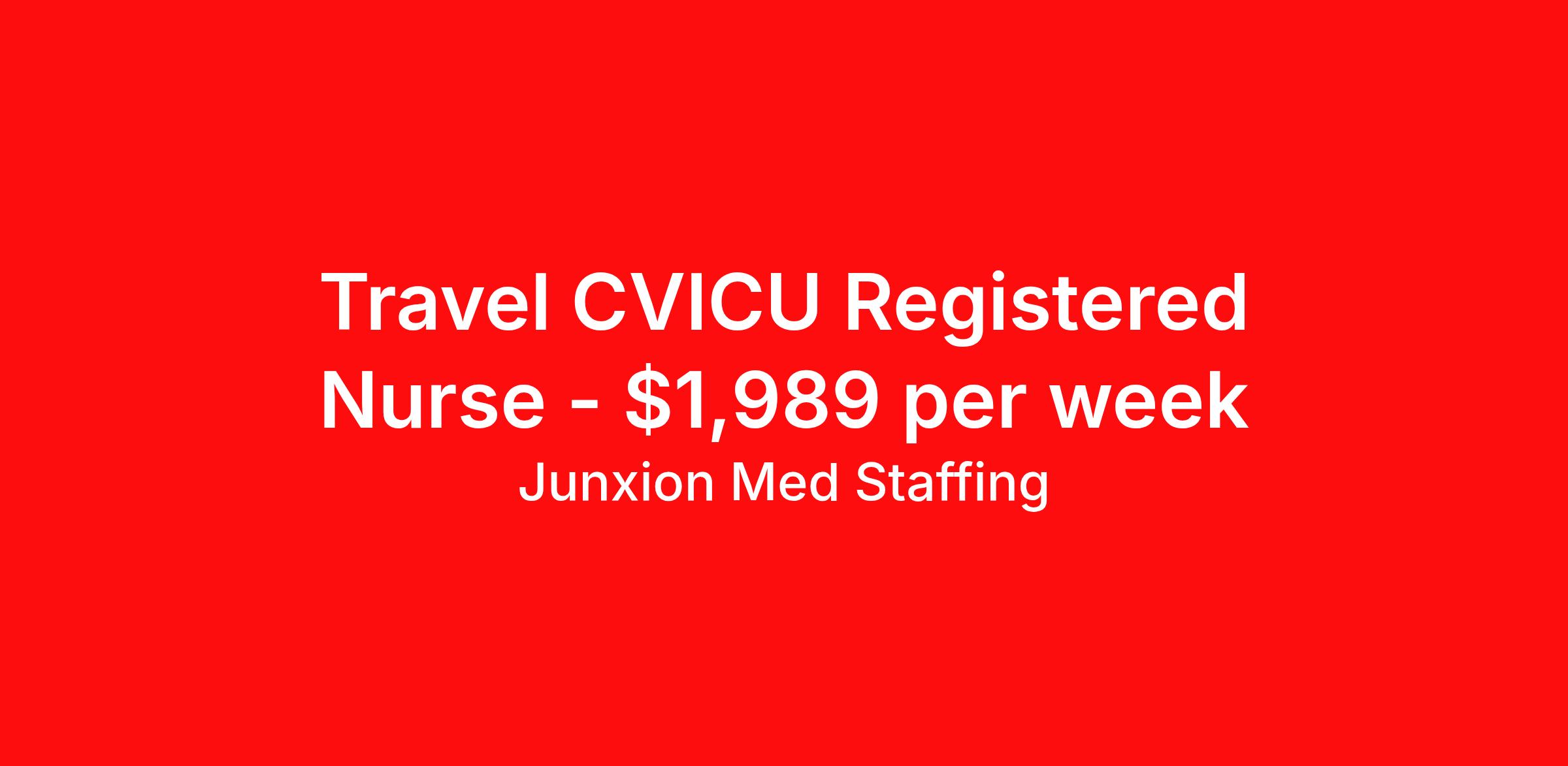 Junxion Med Staffing is seeking a travel nurse RN CVICU for a travel nursing job in Evansville, Indiana. Job Description & Requirements Specialty: CVICU Discipline: RN Start Date: 04/06/2026 Duration: 13 weeks 36 hours per week Shift: 12 hours, nights Employment Type: Travel Summary: Junxion Med Staffing is looking for a CVICU RN to take an assignment in Evansville, Indiana. This assignment lasts 13 WEEKS and is scheduled to start on April 6, 2026. If you don't like the start date, pay, or shift, then let’s talk. Give us a call opt 1 Job Details: Shift: 12H Nights Total Weekly Hours: 36 Certifications: BLS, Nursys, License/Certificate Verification Trauma Level: Benefits: Day 1 Insurance Additional bonus potential for every contract Additional vacation incentives Medical insurance with no more than $175 monthly premium for employee Employee Assistance Program (EAP) Referral bonus up to $1,000 401K and access to financial advisors for financial wellness and education A dedicated recruiter and support team that will help you every step of the way to sure you start on time and have an exceptional experience An agency ran by a traveler for travelers Click here for licensing requirements About the Company: Junxion Med Staffing is an award-winning healthcare staffing company with a mission to provide quality healthcare to our communities. Apply today to speak with a recruiter! Awards: RNVIP- Top 10 Travel Nursing Agencies of 2024 BluePipes – The Best Travel Nursing Companies 2023 *Estimated weekly pay includes projected hourly wages and weekly meal and lodging per diems for eligible clinicians based on nationally published GSA rates. Actual weekly pay and per diems may differ from the amount shown and may be subject to change during an assignment. For all employees and employee applicants, Junxion Med Staffing is an Equal Employment Opportunity ("EEO") Employer, including Disability/Vets, and welcomes all to apply. Junxion Med Staffing Job ID 1362922. Pay package is based on 12 hour shifts and 36 hours per week (subject to confirmation) with tax-free stipend amount to be determined. About Junxion Med Staffing Junxion Med Staffing was founded by a former healthcare traveler who understands the challenges healthcare professionals face - because we’ve been there. We specialize in placing travel nurses, allied health professionals, physicians, physician assistants, and nurse practitioners in both short-term and permanent roles across a wide range of specialties. Whether you're looking for a travel contract or a long-term fit, we work to ensure the right match between each healthcare professional and facility. At Junxion, we keep it simple: ● Transparent communication. No surprises, no hidden details, just honest conversations so you always know what to expect. ● Dedicated support. From job search to contract negotiations and throughout your assignment, you’ll have a recruiter who’s with you every step of the way. ● Competitive pay and benefits. We advocate for you to be fairly compensated and supported in your goals. ● A focus on your success. When healthcare professionals feel valued and empowered, patient care improves and that’s what it’s all about. You’re not just a number here. You’re part of a team that actually cares. Let’s find your next great opportunity together. Benefits Weekly pay Referral bonus Dental benefits Vision benefits 401k retirement plan Medical benefits Mileage reimbursement