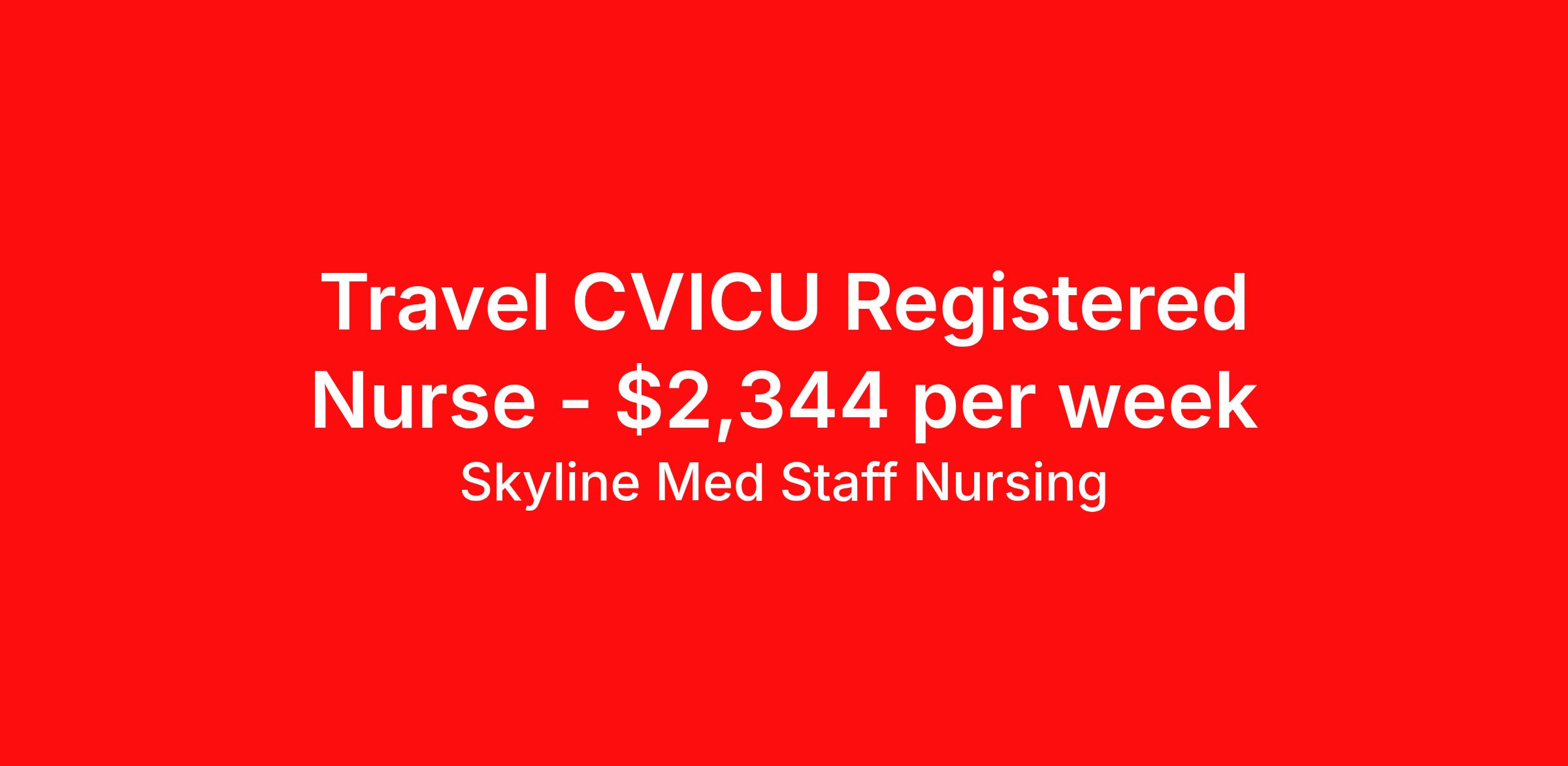 Skyline Med Staff Nursing is seeking a travel nurse RN CVICU for a travel nursing job in Towson, Maryland. Job Description & Requirements Specialty: CVICU Discipline: RN Start Date: 04/06/2026 Duration: 13 weeks 36 hours per week Shift: 12 hours, nights Employment Type: Travel Weekly amount stated in job postings is an estimate based on estimated hourly wage and potential stipends available for the location of the assignment. Pay package is calculated on bill rate at the time job was posted, but can change or vary without notice. Exact pay packages might vary as this is an estimate. Our recruiter would be happy to build an exact pay package for you for each job. Skyline Med Staff Nursing Job ID 36119787. Pay package is based on 12 hour shifts and 36.0 hours per week (subject to confirmation) with tax-free stipend amount to be determined. Posted job title: RN:CVICU,19:00:00-07:00:00 About Skyline Med Staff Nursing Join the Top- Rated Travel Healthcare Team! Skyline Med Staff was named as the 1 Best Travel Healthcare Company in 2025 by BluePipes, a recognition driven by glowing reviews from travel healthcare professionals. Our recruiters are consistently praised on Google for their responsiveness, dedication, accessibility, and industry knowledge. Ready to experience the difference? Apply for a job today and see why healthcare professionals choose Skyline! Certified Women Owned Business We believe that travel is good for the soul. We want to be on your journey with you and find the right job that fits you Skyline Med Staff is committed to one vision treating others the way that THEY want to be treated. The executive team at Skyline Med Staff focuses on a commitment to quality, consistency, and the highest level of service. Our team members continually strive to build long term relationships that center on you and helping you achieve your goals. Some of the Benefits you will receive with Skyline Med Staff: Over 30 years of combined experience in the staffing industry Higher Take-Home Pay Rates Dedicated Personal Recruiter We are available to you 24/7 Health Insurance Plan Options Tax Free Per Diems, Housing Stipends and Travel Reimbursements Joint Commission Certified Contracts in all 50 states Referral and Loyalty Bonuses Benefits Medical benefits Referral bonus