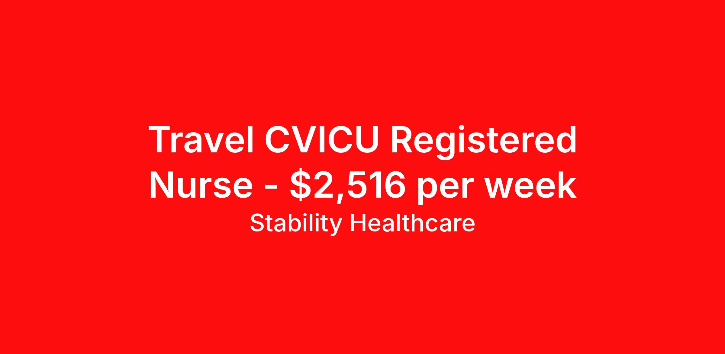 Stability Healthcare is seeking a travel nurse RN CVICU for a travel nursing job in Hartford, Connecticut. Job Description & Requirements Specialty: CVICU Discipline: RN Duration: 13 weeks 36 hours per week Shift: 12 hours, nights Employment Type: Travel Stability Healthcare is looking for a CVICU RN contract position in Hartford, CT. Nurses working in the cardiovascular intensive care unit provide care for patients recovering from open-heart surgery and heart transplants. CVICU Nurses observe changes, perform diagnostics tests, analyze charts, and record medical histories of patients. *$600 travel bonus *Day 1 health insurance with United Healthcare *PTO plan start accruing on day 1, use during contract or cash out at the end! *Guaranteed stipend if facility calls you off *Extra hour bonus earn an additional hourly bonus for working over your weekly contracted hours Stability Job ID 828550. Pay package is based on 12 hour shifts and 36 hours per week (subject to confirmation) with tax-free stipend amount to be determined. Posted job title: CVICU About Stability Healthcare Stability Healthcare was founded in 2009, with the mission of becoming the best Travel Nursing Agency in California. We have been rated one of the top travel nursing agencies and offer our nurses the highest paying travel nursing jobs available. We have access to the best travel assignments from 1000’s of facilities. You can start the year off in sunny California, spend the Spring in the Colorado Rockies, enjoy the Summer in the Mid-West, experience the change of seasons in Boston and New York, and hit the beaches of Florida in the winter. Our Nurses work in the best hospitals and health systems in the country. Benefits Guaranteed Hours Benefits start day 1