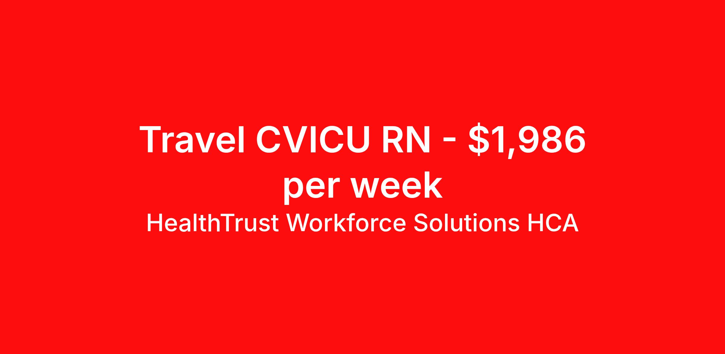 HealthTrust Workforce Solutions HCA is seeking a travel nurse RN CVICU for a travel nursing job in Nashville, Tennessee. Job Description & Requirements Specialty: CVICU Discipline: RN Start Date: 03/29/2026 Duration: 13 weeks 36 hours per week Shift: 10 hours, days Employment Type: Travel Entrust Your Career to HealthTrust! At HealthTrust, we believe that healthcare is not defined by the four walls in which it is practiced; it’s defined by its people. We pride ourselves on crafting opportunities that expand skill sets, broaden career horizons, provide economic stability, and cultivate personal growth. HealthTrust Offers: Competitive Pay Packages Guaranteed hours Weekly direct deposit options 401k with Company Match Earn up to $750 for referrals Free Private Furnished Housing or Tax-Free Subsidy To get started, you will need: RN's a minimum of 1 year in specialty Allied 6 months of experience An adventurous spirit and fierce dedication Degree in corresponding specialty as required Appropriate certifications and licensure as needed for the specific position HealthTrust Benefits: Opportunities for a lifetime: When you become a part of the HCA family, you will have exclusive access to more opportunities than any other healthcare system in the nation. At HWS, we help open the door to a lifetime of lasting career opportunities. A culture of care: Our clinicians have made HWS an industry leader for over 25 years. We are passionate about our mission that, above all else, we are committed to the care and improvement of human life. Career Development: As a wholly owned subsidiary of HCA Healthcare, HWS is a preferred partner to thousands of top-performing hospitals. We provide our healthcare professionals with first-priority access to more than 200,000 jobs nationwide. We are uniquely positioned to offer you exclusive and direct access to HCA Healthcare’s vast network of facilities. Let us open the door to nationwide opportunities that fit your lifestyle! We are an equal opportunity employer and value diversity at our company. We do not discriminate on the basis of race, religion, color, national origin, gender, sexual orientation, age, marital status, veteran status, or disability status. Job Requirements Certifications ACLS (Required) NIHSS (Required) BLS (Required) HealthTrust Workforce Solutions HCA Job ID 982367. Posted job title: Travel Nurse - Cardiac ICU About HealthTrust Workforce Solutions HCA At HealthTrust Workforce Solutions, healthcare is not just about the four walls of a facility but about the people who provide and receive care. Our focus is on empowering healthcare professionals to deliver exceptional patient experiences by providing them with the necessary skills, tools, and support. We partner with healthcare facilities nationwide to ensure that the right professionals are in the right roles. We prioritize our clinicians by giving them a voice and access to opportunities to fulfill their mission of improving lives by providing quality patient care. We are committed to our core values of Trust, Innovation, Adaptability, Courage, and Accountability. We are dedicated to positively impacting the healthcare industry by providing first-priority access to more than 200,000 jobs nationwide to our healthcare professionals. Join us and be part of the HealthTrust family, where you can make a difference every day. We embrace our changing environment, and we maintain a culture that has a rich tradition of transforming itself to meet the challenges of the future. MISSION STATEMENT While putting great people in the right roles is essential, our mission is far greater. We want our clinicians to be part of the HealthTrust family, where healthcare professionals have a voice and are empowered with the right tools and opportunities to fulfill their personal mission of improving lives. Plus, as a preferred partner to thousands of top-performing hospitals, we provide our healthcare professionals with first-priority access to more than 200,000 jobs nationwide. Benefits Dental benefits Vision benefits Referral bonus Continuing Education Life insurance