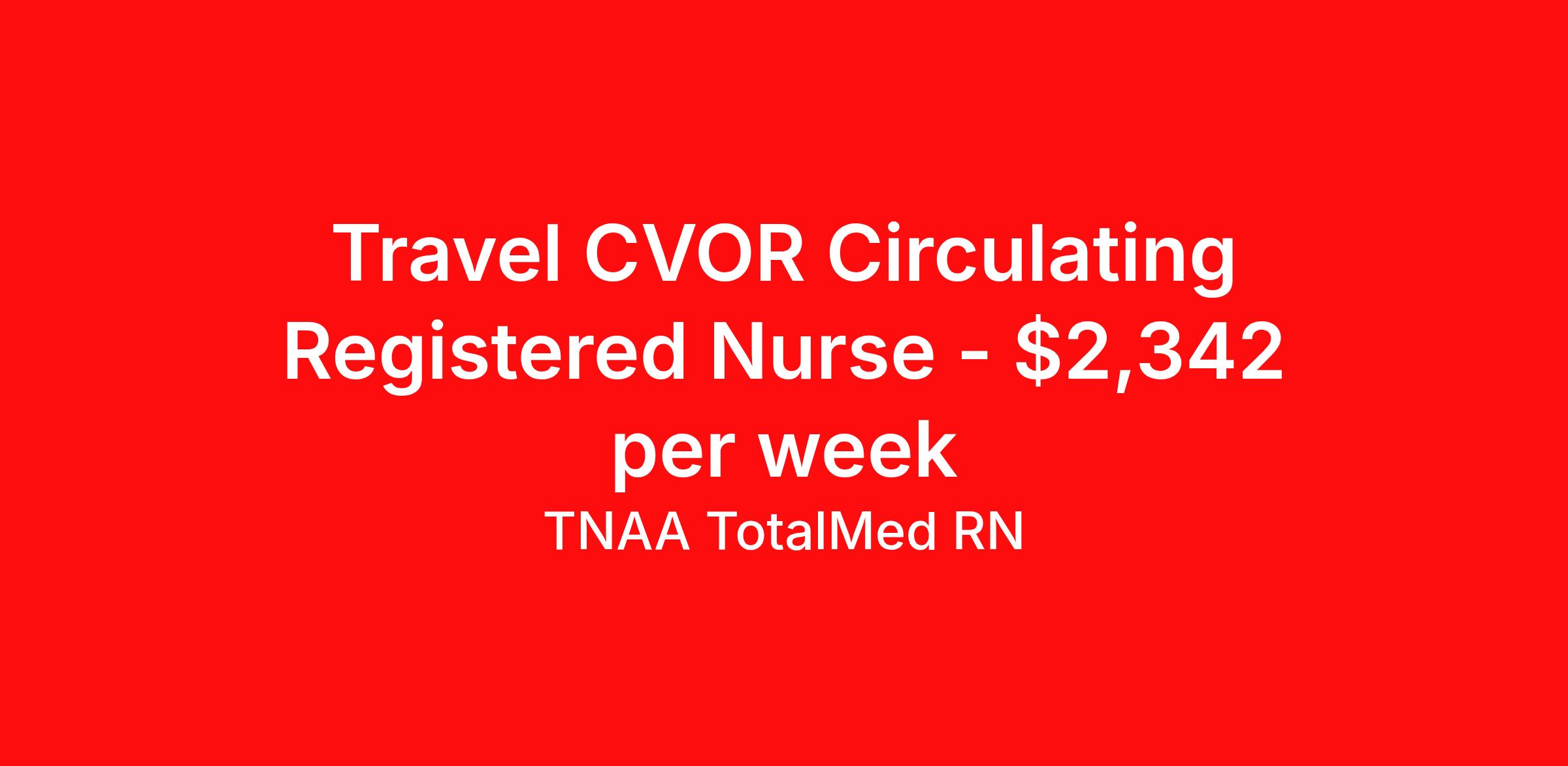 TNAA TotalMed RN is seeking a travel nurse RN CVOR for a travel nursing job in Indianapolis, Indiana. Job Description & Requirements Specialty: CVOR Discipline: RN Start Date: 04/20/2026 Duration: 13 weeks 36 hours per week Shift: 12 hours, days Employment Type: Travel We're looking for Cardiovascular Operating Room RNs for an immediate travel nurse opening in Indianapolis, IN. The right RN should have 1-2 years recent acute care experience. Read below for more requirements. As a CVOR RN, you'll be responsible for providing professional CVOR care services to support a team of physicians, RNs and other medical staff. Our CVOR Travel Nurses demonstrate advanced clinical expertise in circulating for a variety of cardiothoracic surgical procedures and other complex surgeries. As a CVOR Travel Nurse, you should be prepared to perform the following tasks: Assess, plan and evaluate the nursing care needs of the patient before, during and after a surgical procedure. Participate in the care of patients receiving conscious sedation. Administer prescribed medications, apply dressings, monitor vital signs. Assist physician during procedures. Maintain aseptic techniques and actively monitor situations which could lead to breaches in aseptic technique. Coordinate the operating room with respect to sterility, cleanliness, availability of functioning equipment and supplies. Ensure the proper handling of specimens. CVOR Travel Nurses should be able to stand and walk for long periods of time, as well as bend, lean and stoop without difficulty. RNs should be able to easily lift 20 pounds. Moving or lifting of patients may require lifting of up to 50 pounds at times. Because of the fast-paced environment, Cardiovascular OR RNs must possess good skills for coping with stress and be able to relate to people of all ages and backgrounds. Requirements*: ACLS, BLS, 2 Years * Additional certifications may be required before beginning an assignment. TotalMed Travel Job ID 1394917. Pay package is based on 12 hour shifts and 36 hours per week (subject to confirmation) with tax-free stipend amount to be determined. Posted job title: Cardiovascular Operating Room - CVOR RN - Travel Nurse About TNAA TotalMed RN TotalMed is a Top Ten, travel nursing and healthcare staffing agency with the mission of igniting purpose in healthcare. The organization staffs nurses, therapists, pharmacists, and other clinicians of all specialties in all 50 states. They offer local and travel jobs and match caregivers with the right organization to assist both facilities and patients. As an organization, they focus on putting highly-skilled staff into facilities to ensure adequate staffing for a better patient experience. TotalMed specializes in recruiting and placing healthcare professionals in travel, PRN, and permanent positions across the country in Nursing and Allied Health. Throughout 2020, the organization filled roles at even the most short-staffed facilities during the most challenging time in healthcare. By matching the right travel healthcare professional with the right organization, TotalMed continues to offer a lifeline to facilities and their patients. Benefits Weekly pay Guaranteed Hours Continuing Education 401k retirement plan Sick pay Wellness and fitness programs Referral bonus Employee assistance programs Medical benefits Dental benefits Vision benefits Benefits start day 1