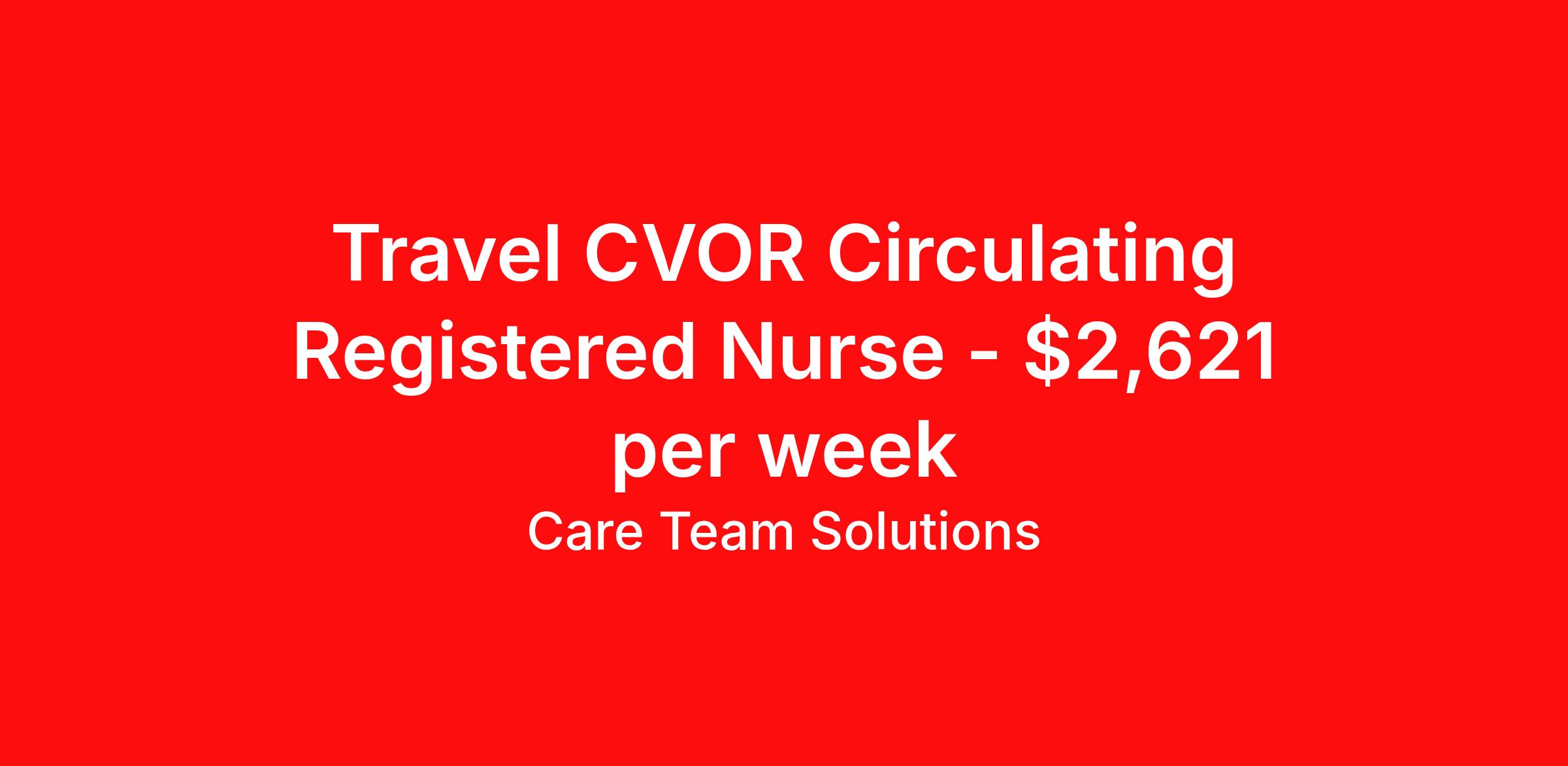 Care Team Solutions is seeking a travel nurse RN CVOR for a travel nursing job in Indianapolis, Indiana. Job Description & Requirements Specialty: CVOR Discipline: RN Start Date: 04/20/2026 Duration: 13 weeks 36 hours per week Shift: 12 hours Employment Type: Travel Registered Nurse must have 2 years of recent experience in particular specialty Details: Must Have 2 Years of recent Cardiovascular Operating Room experience. Specialty: Cardiovascular Operating Room Discipline: Registered Nurse Start Date: 2026-04-20 Duration: 13 Weeks Shift: 12 Hours Day shift Hours Per Week: 36 Hours Employment Type: Contract Gross Weekly Pay: $2621.37 Six things that won’t happen if you apply to this job: You won’t have to guess what the downsides are. We’ll tell you up front. You won’t show up on day 1 and find out this is not what you signed up for. We won't leave your phone call ringing when it's inconvenient. Business hours for you are business hours for us. You won’t get shuffled to some customer service rep when a problem pops up. If we screw up something in securing your placement, we'll own it. That means it's on us to make it right. You won’t figure out your credentials alone. Our credentialing experts will walk you through it step by step. We've talked to thousands of travel nurses like you. We know you want good pay. You want to choose when you work. But the one thing nurse after nurse has said they want and don't have is someone in their corner. There's a lot in this business that’s messed up. We’re trying to be the people that fix it. You and every nurse with the guts to travel deserve it. We've worked hard for you to enjoy some one-of-a-kind benefits you'll not likely find anywhere else, because they benefit you more than they benefit us: Our early pay program Student loan reimbursement Free well-being tele-visits with a psychologist Care Team Solutions Job ID 586783. Pay package is based on 12 hour shifts and 36 hours per week (subject to confirmation) with tax-free stipend amount to be determined. Posted job title: CVOR Registered Nurse About Care Team Solutions Two brothers who give an enormous damn. We're Justin and Kyle. Neither of us are nurses. It doesn’t take a nurse to see that the way travel nurses are treated sucks. Nursing is already hard enough. Travel nursing takes serious guts. You get the toughest assignments in places you’ve never been. Which can be fun, but it’s also stressful. You’re in your element but outside of your hometown. You can be a stranger on the team. If anyone deserves someone in their corner, it’s you. But that’s not how most agencies operate. Which is why travel nurses hate working with them. We got into this business because we saw bucket-loads of nurses moving through the "churn and burn" travel machinery. We absolutely hate that. You'll do your best work when you have the placements you want and feel fully supported in your work. We pay our people well because we want them to treat you well. Our recruiters are amazing (we picked each of them ourselves), but if you've got a problem too big for them, they can come straight to us. We work like ten feet away. The "Churners and Burners" promise you the same benefits. They might as well copy/paste them from each other. We have them too: 401k, holiday pay, healthcare, dental, travel reimbursement, etc But we've worked hard for you to enjoy some one-of-a-kind benefits you'll not likely find anywhere else, because they benefit you more than they benefit us: Our early pay program Student loan reimbursement Free well-being tele-visits with a psychologist Benefits Weekly pay Holiday Pay Guaranteed Hours 401k retirement plan Wellness and fitness programs Referral bonus Medical benefits Dental benefits Vision benefits School loan reimbursement
